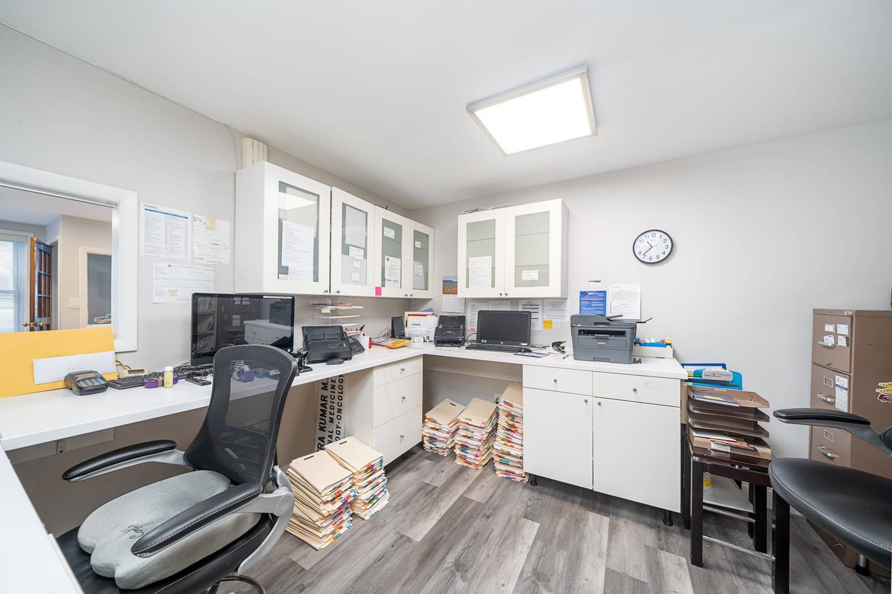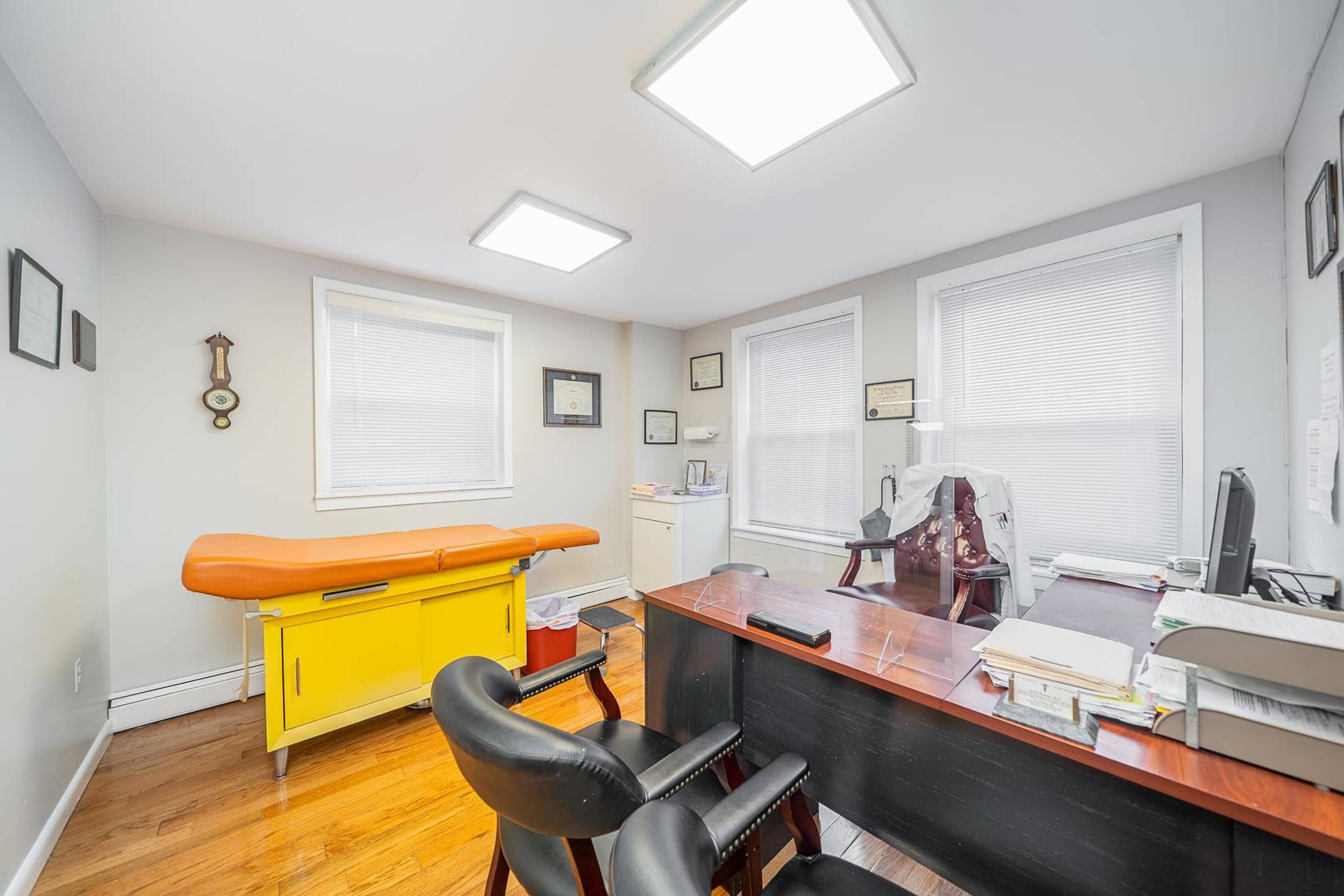 This medical condo office space for lease features a large waiting room, a front desk reception area, three exam rooms, a lab room with kitchenette fixtures, a file room, a private office, and a bathroom. The space is suitable for medical professionals or general office tenants. An adjacent space of 1,074 square feet is available and can be combined with this unit for additional space. The property is located on Boulevard East, offering convenient access to bus transportation and parking. It is also situated near the Ferry and Light Rail at Port Imperial. The location provides access to amenities in West New York, including restaurants, parks, and dog parks.