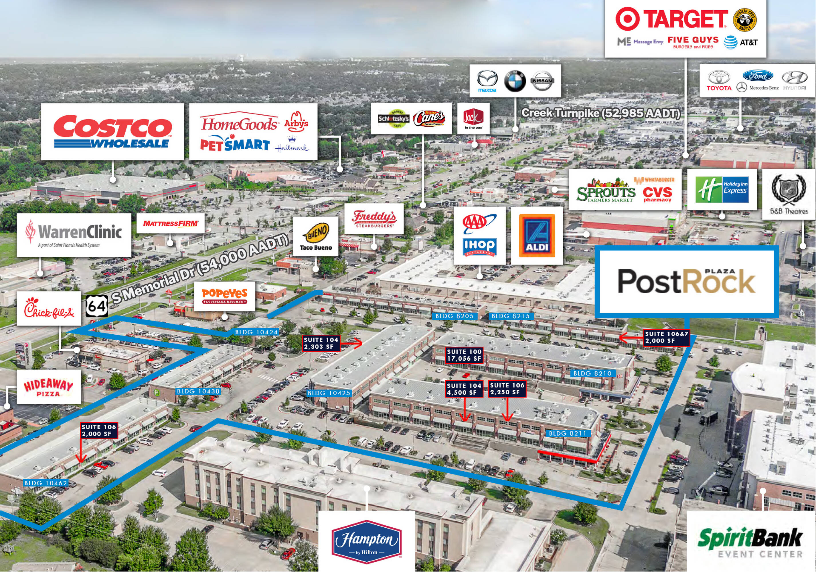 Post Rock Plaza is a mixed-use center situated in a well-established commercial area. The location benefits from high traffic volume, with 52,985 cars per day on the Creek Turnpike and 54,000 cars per day on Memorial Drive, providing convenient access. The surrounding area includes a variety of businesses, including Aldi, Costco, Lifetime Fitness, Target, Chick Fil A, Chipotle, and Hideaway Pizza.