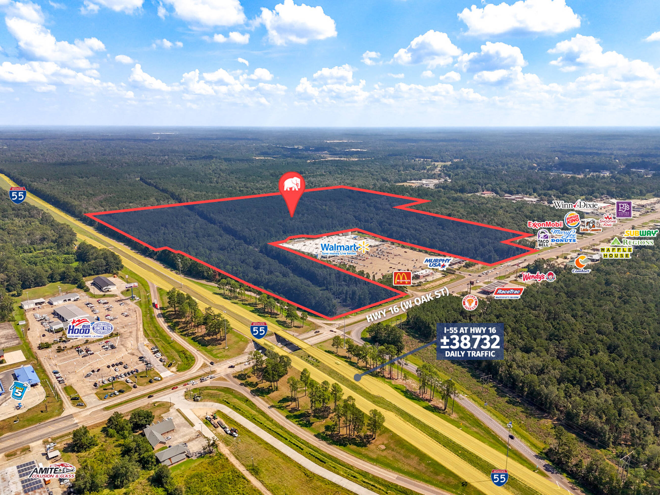 This expansive ±102.70-acre tract is available for sale, offering commercial, hospitality, retail, and recreational development opportunities. The site is located off I-55 and surrounded by major chains such as Walmart, McDonald's, and Winn Dixie. The property features approximately 3,385 feet of dual frontage along I-55 and Hwy 16 (W Oak St), positioning it on Amite's main retail corridor. The land can be subdivided into smaller plots to meet diverse investor or developer needs.