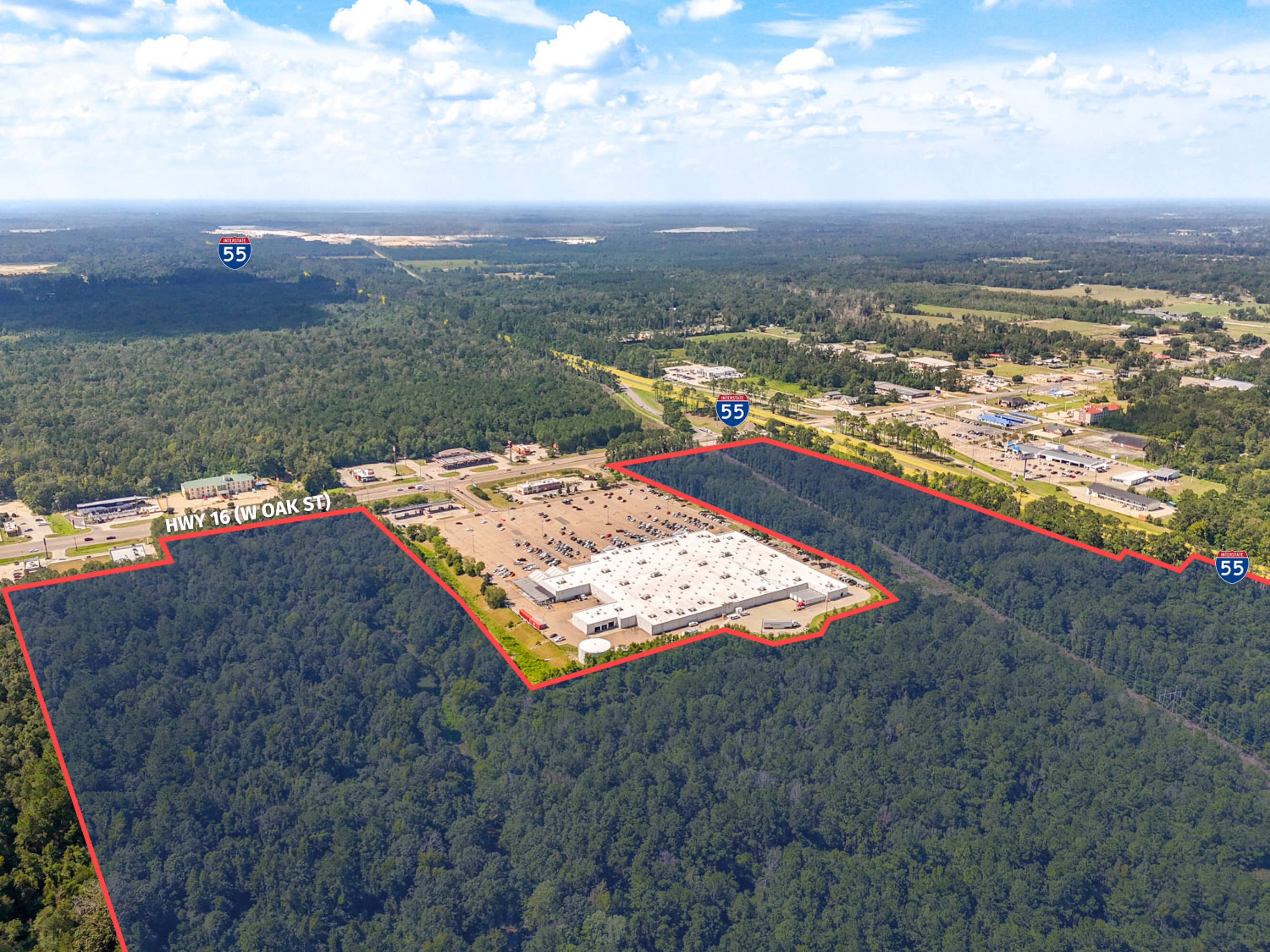This property features: ±102.70‑acre tract suitable for commercial, hospitality, retail, and recreational development.; Enjoy maximum visibility with ±3,385 ft of dual frontage along I‑55 and Hwy 16 (W Oak St).; Located off I‑55 and surrounded by major chains.