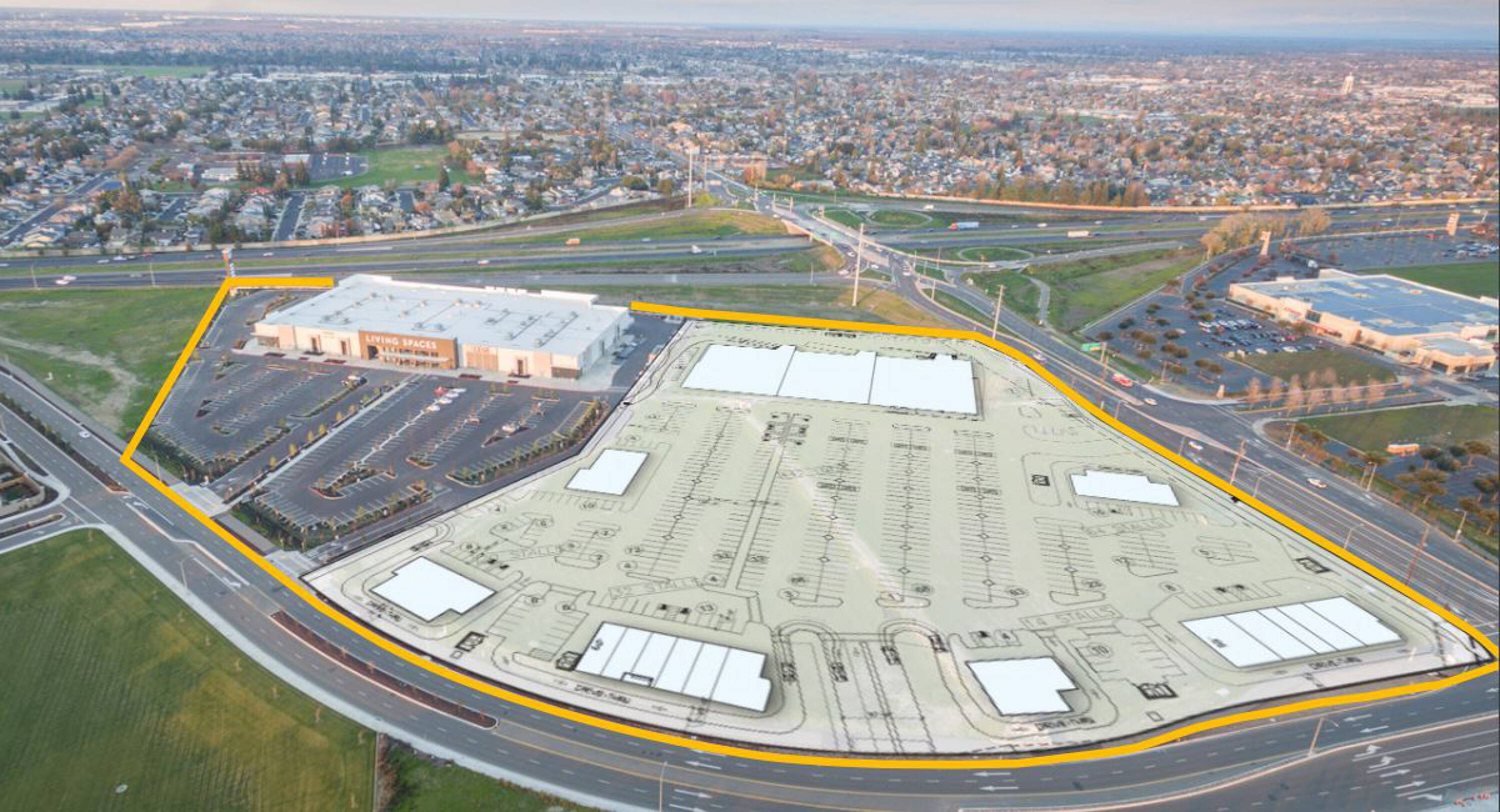 New retail center in Manteca with highway visibility.