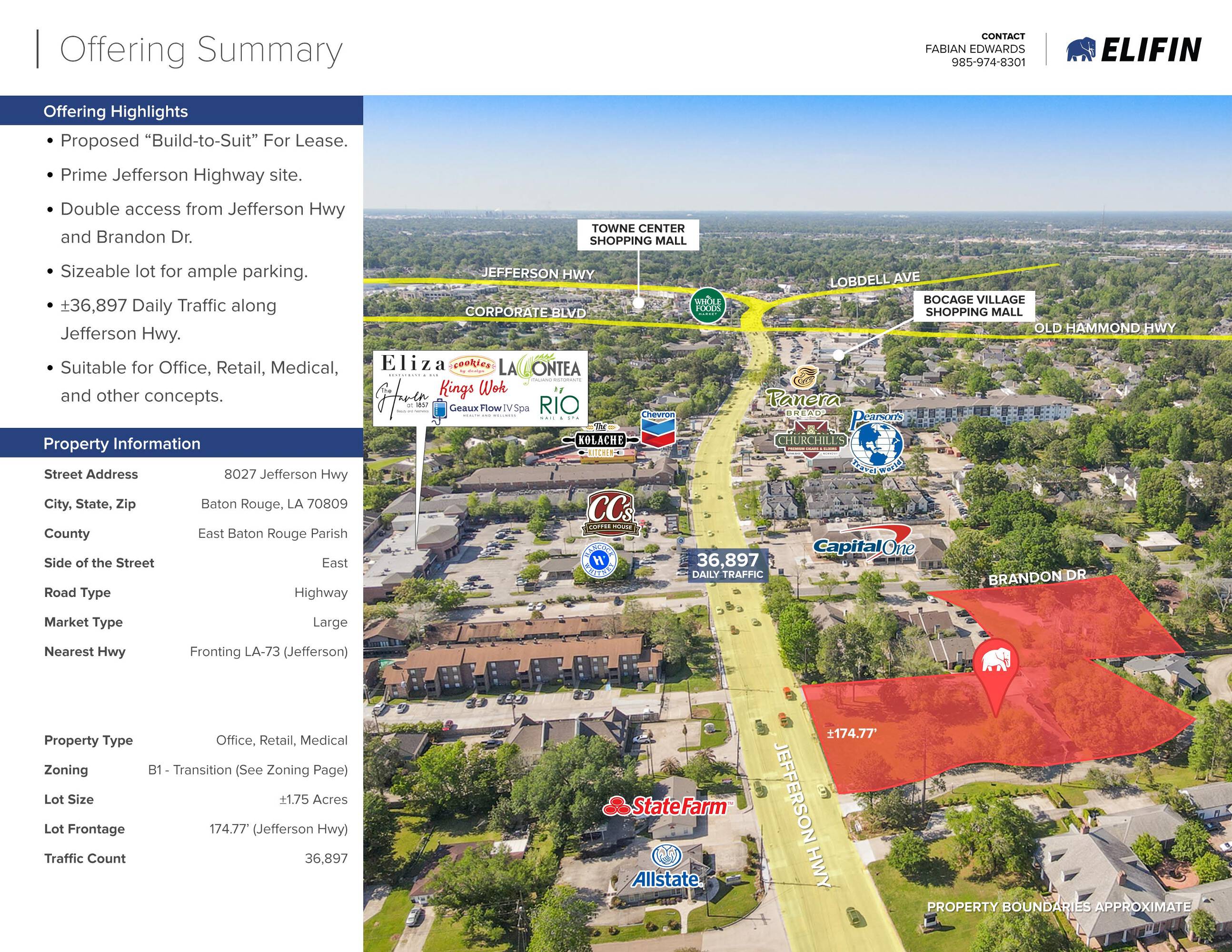 This property features: Prominent location on Jefferson Hwy with high daily traffic (±37,000) and strong residential economic demographics.; Build‑to‑suit opportunity allowing customization to tenant's requirements.; Large site (±1.75 Acres) with double access from Jefferson Hwy and Brandon Dr.