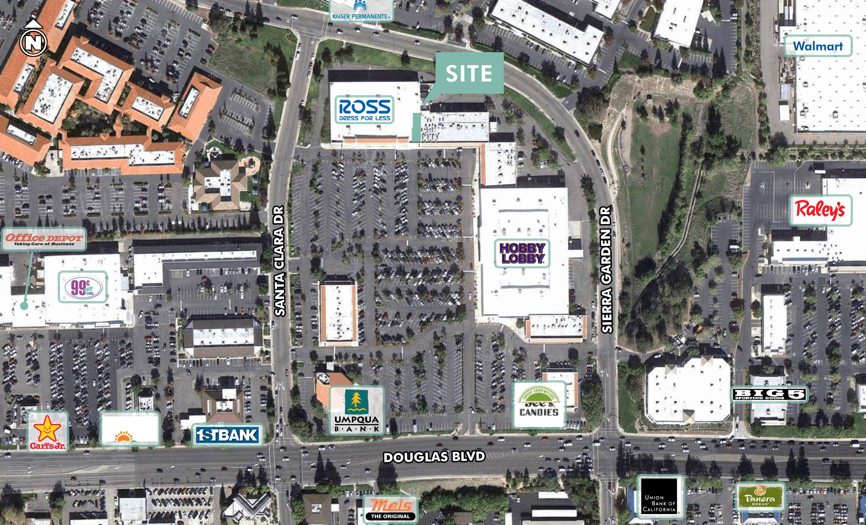 This property features: High foot‑traffic location; Anchored by Ross Dress For Less and Hobby Lobby; Located on the corner of Douglas Boulevard and Santa Clara Drive
