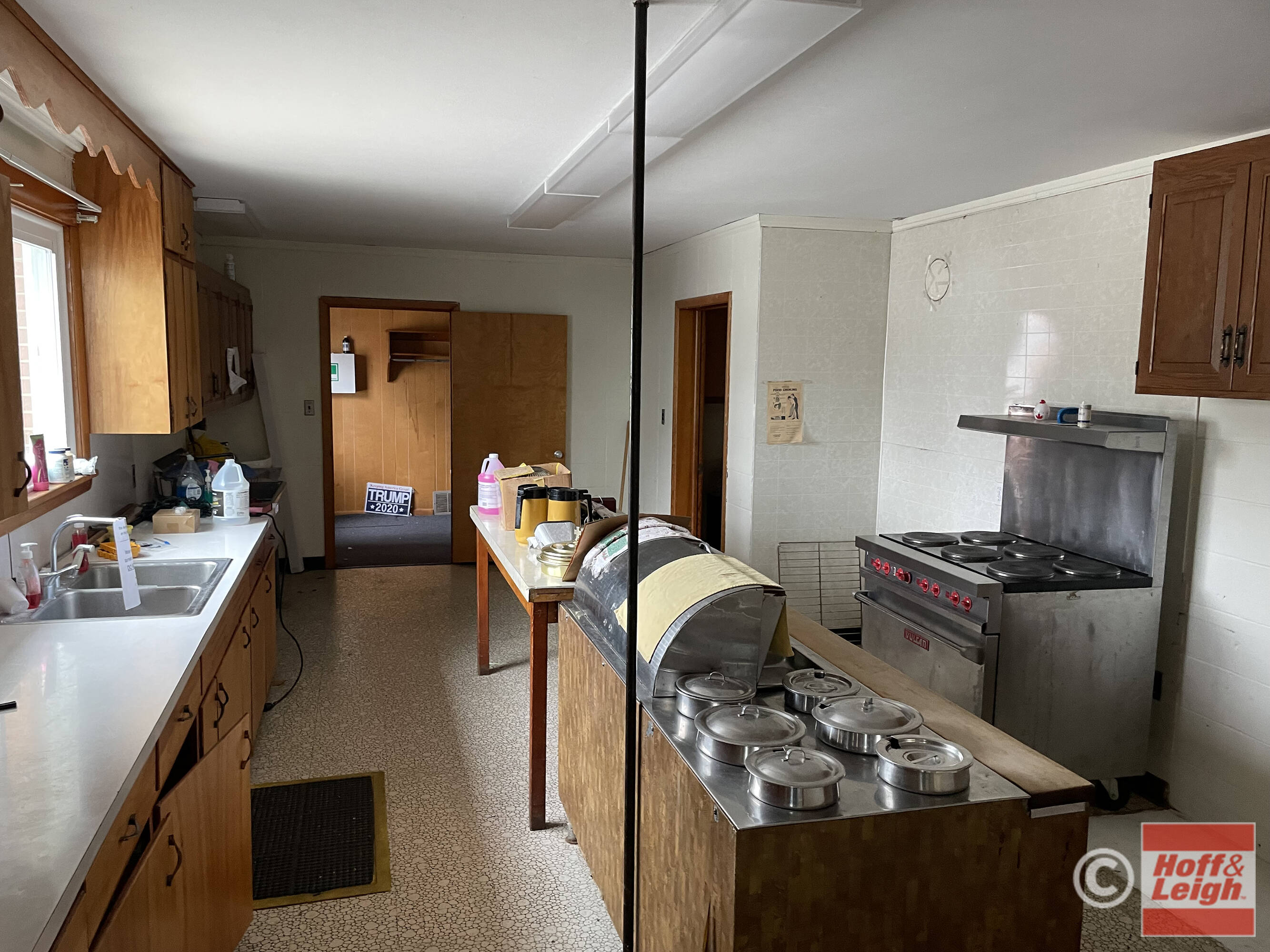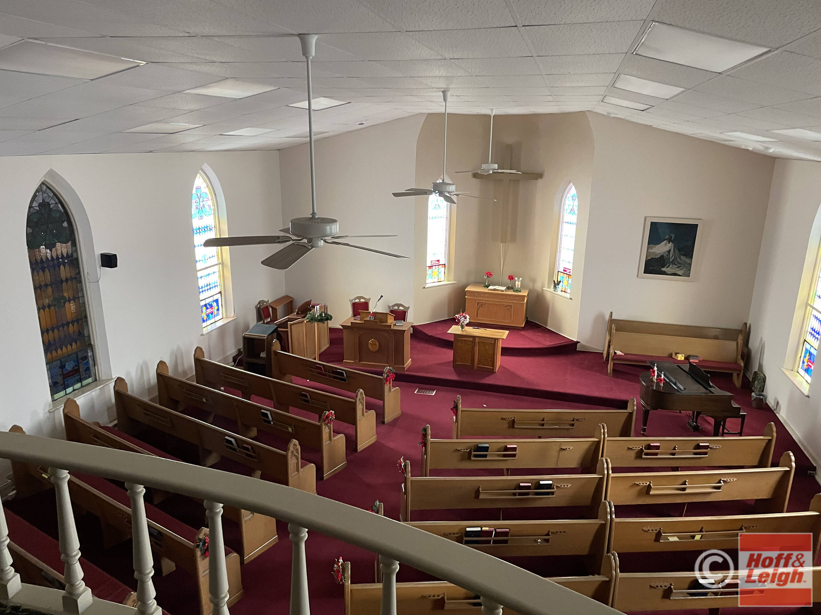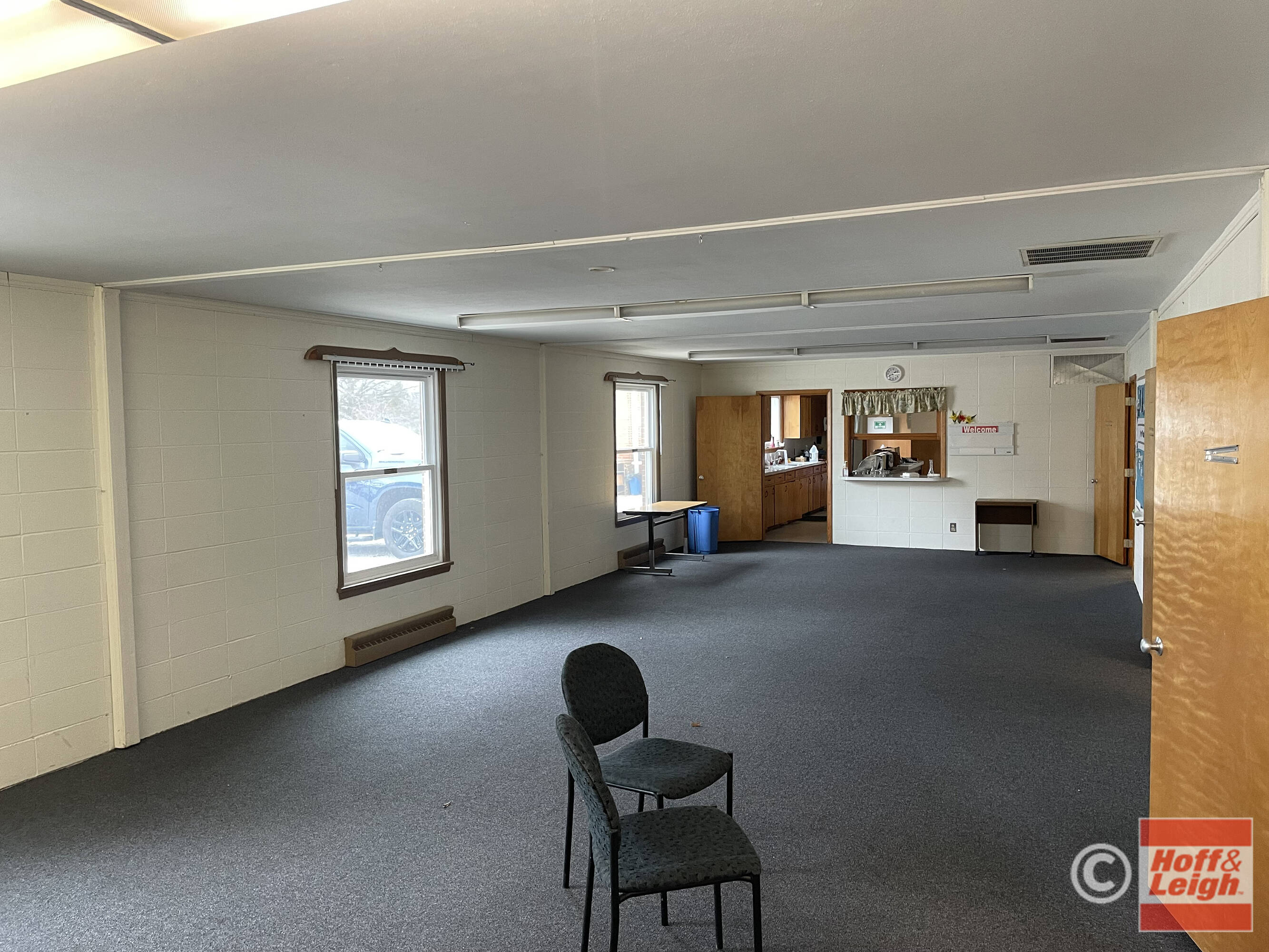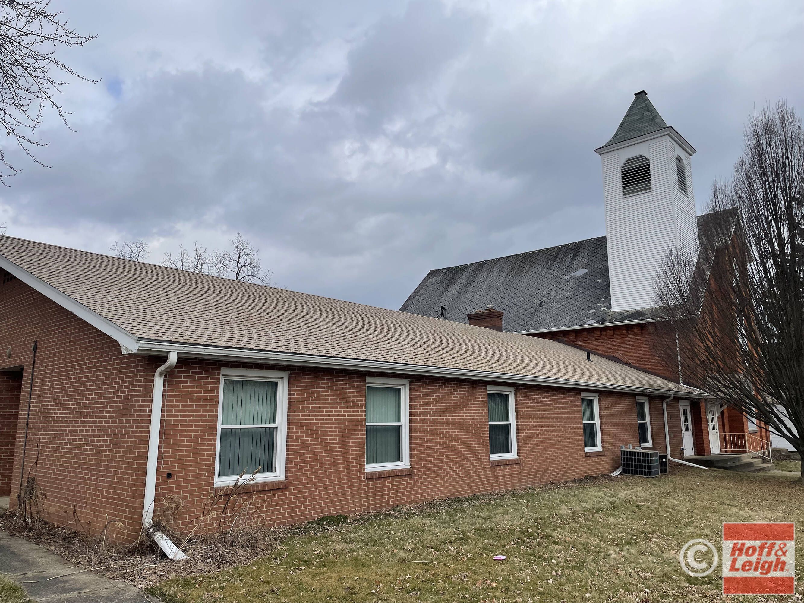 Church building with kitchen, fellowship hall, offices, and classrooms.