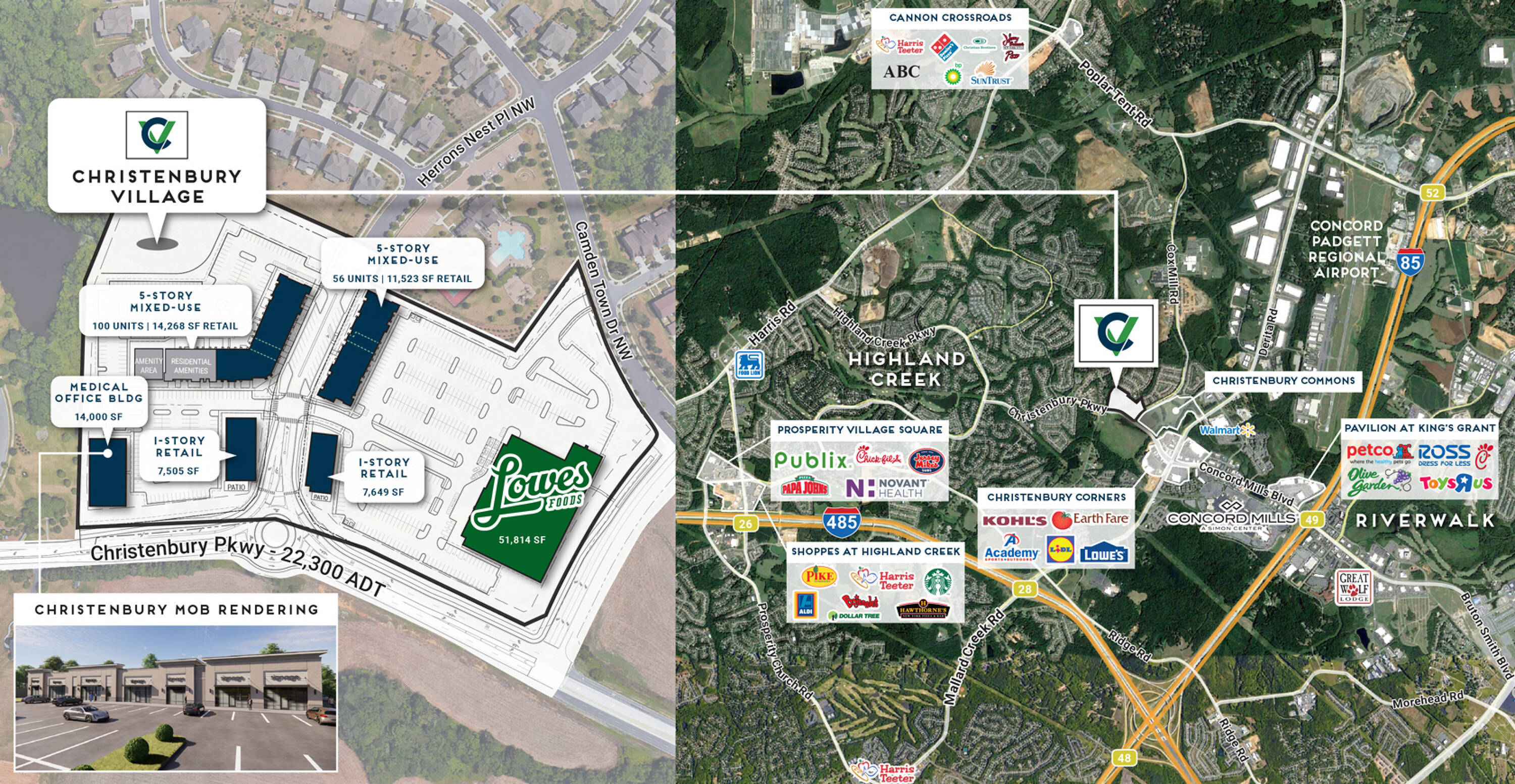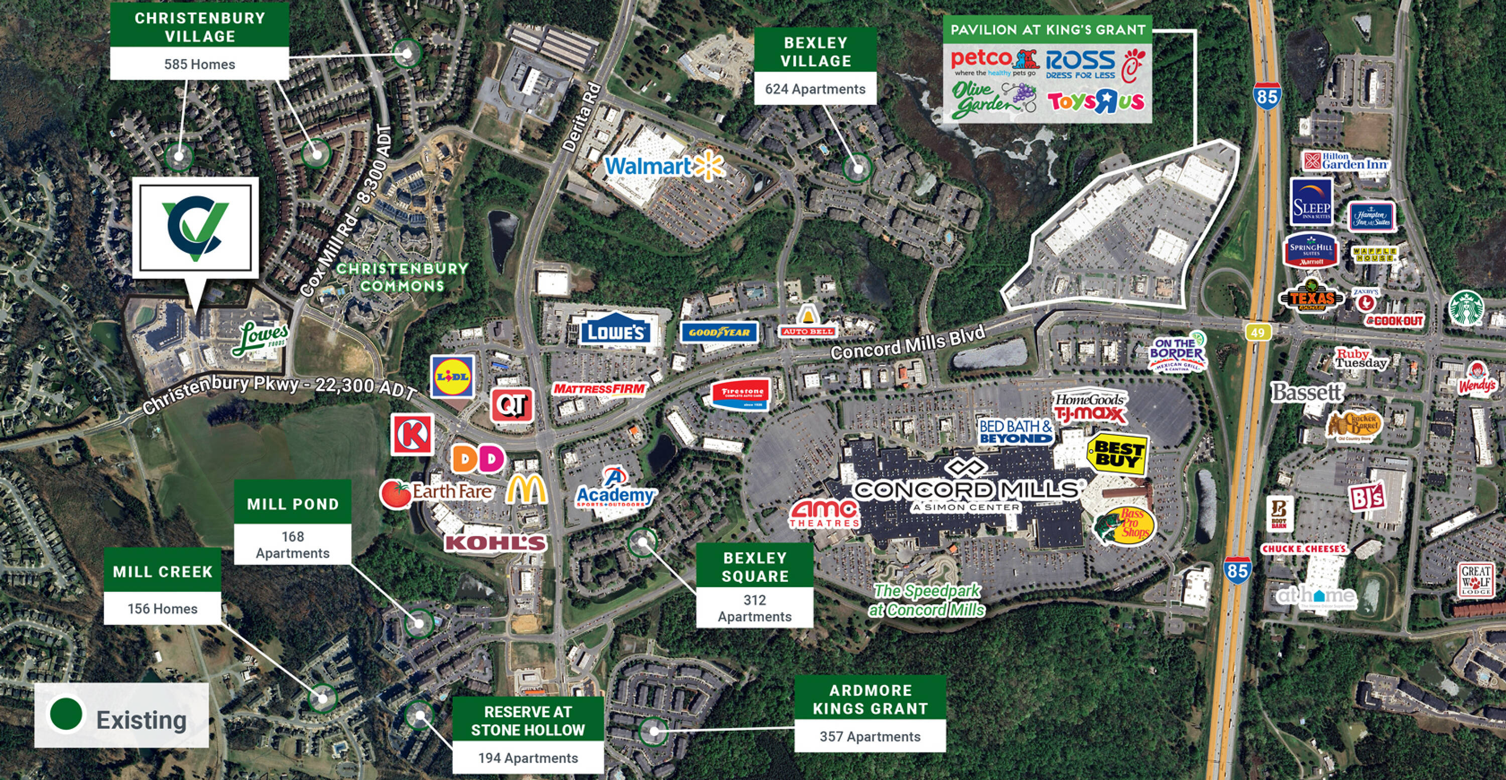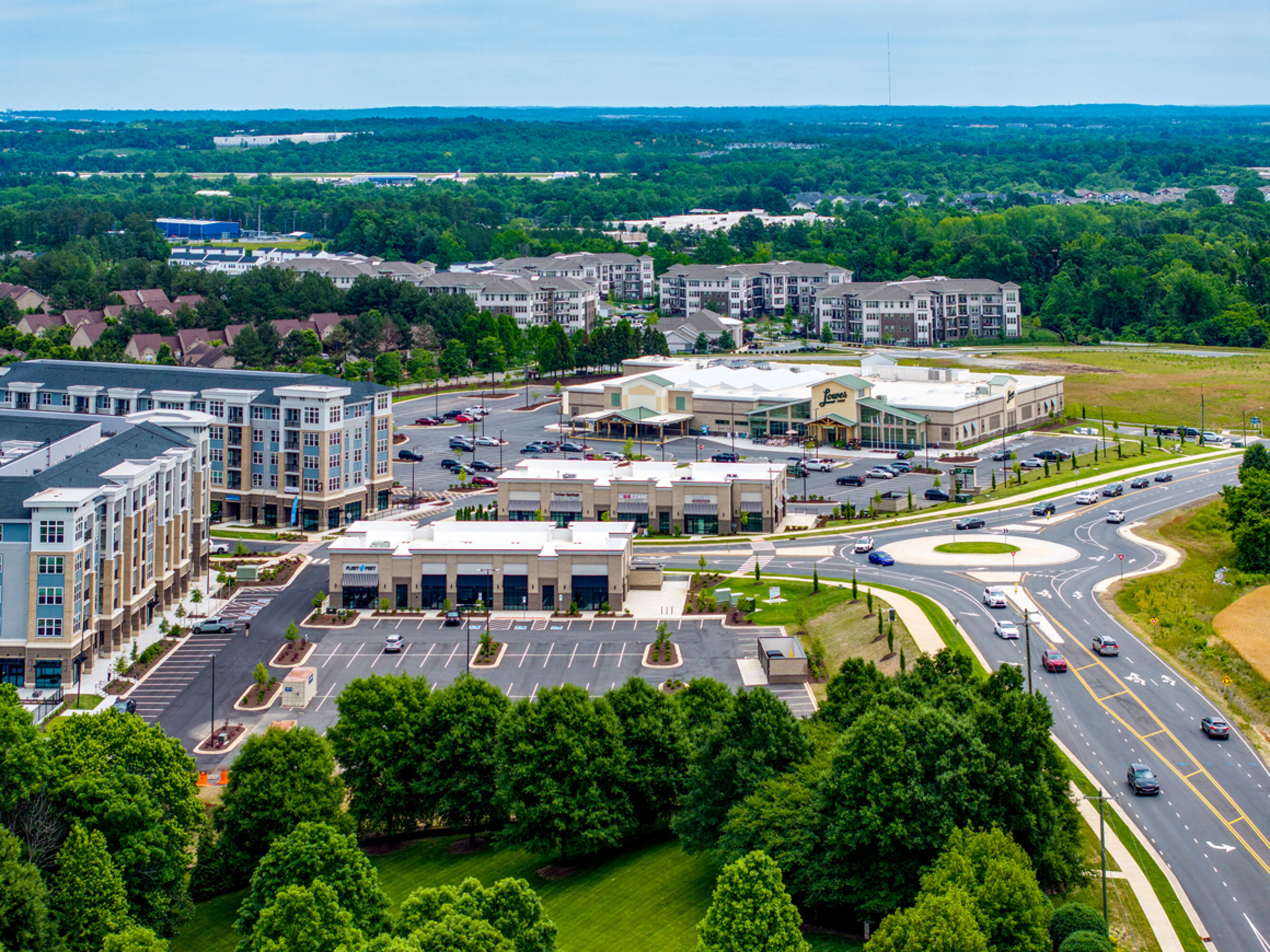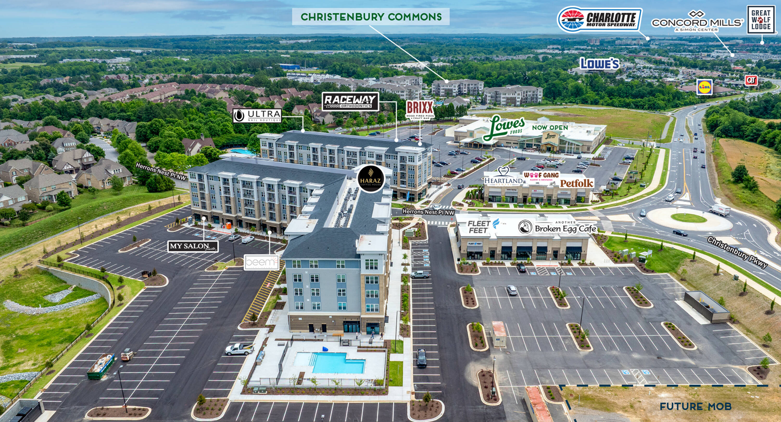 Mixed-use development near Concord Mills with retail and multifamily.