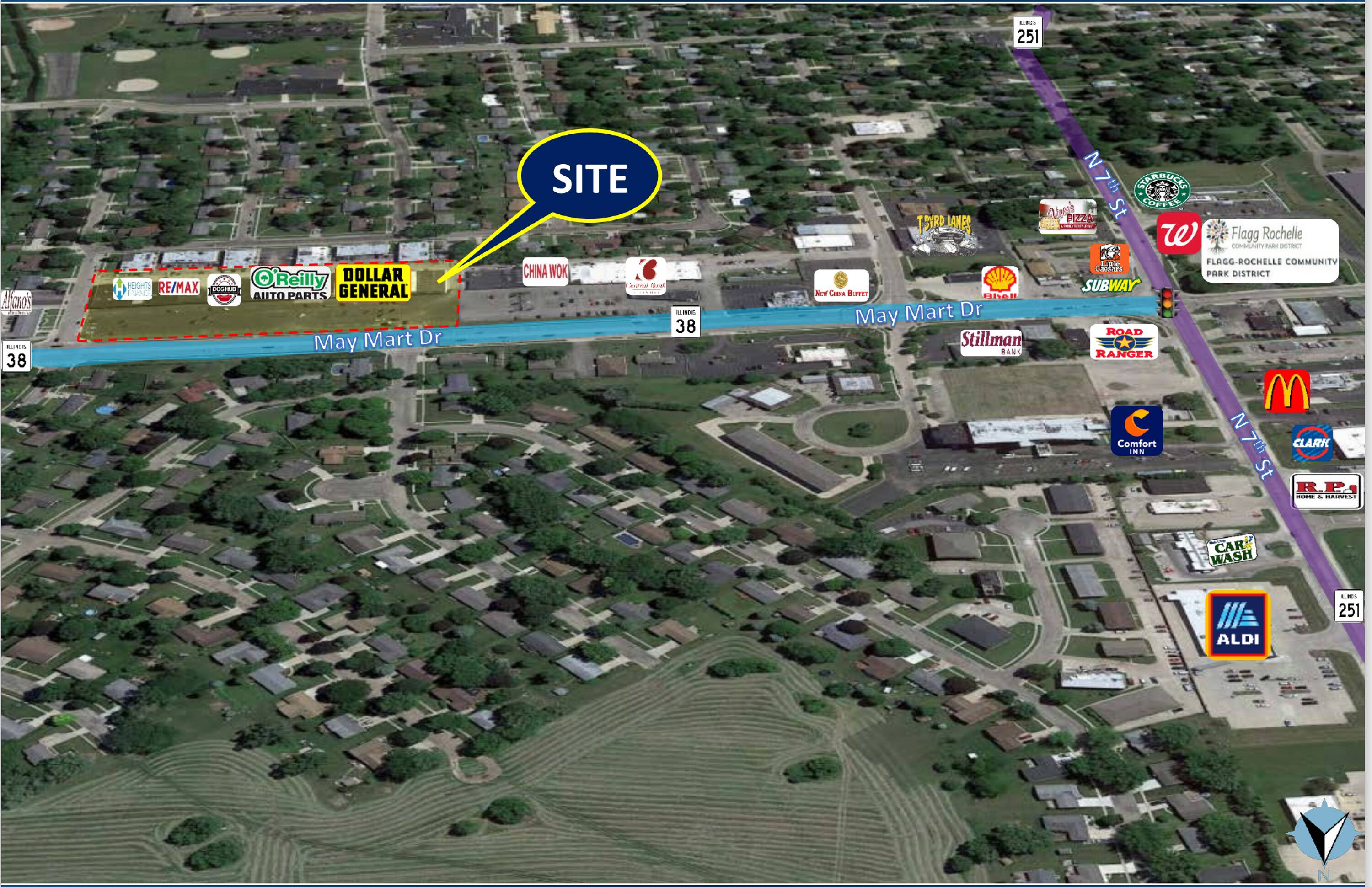 Rochelle Commons is a shopping center with high visibility, situated directly across from Walmart. It benefits from consistent daily traffic, accessibility, and visibility along IL-38. The location is suitable for retail, service, medical, fitness, and various neighborhood-focused businesses. The property provides flexible suite sizes, storefront exposure, and parking to support customer flow. With established co-tenants and residential density surrounding the site, Rochelle Commons is suitable for operators looking to grow or expand in the market. The rental rate is $7 per square foot.