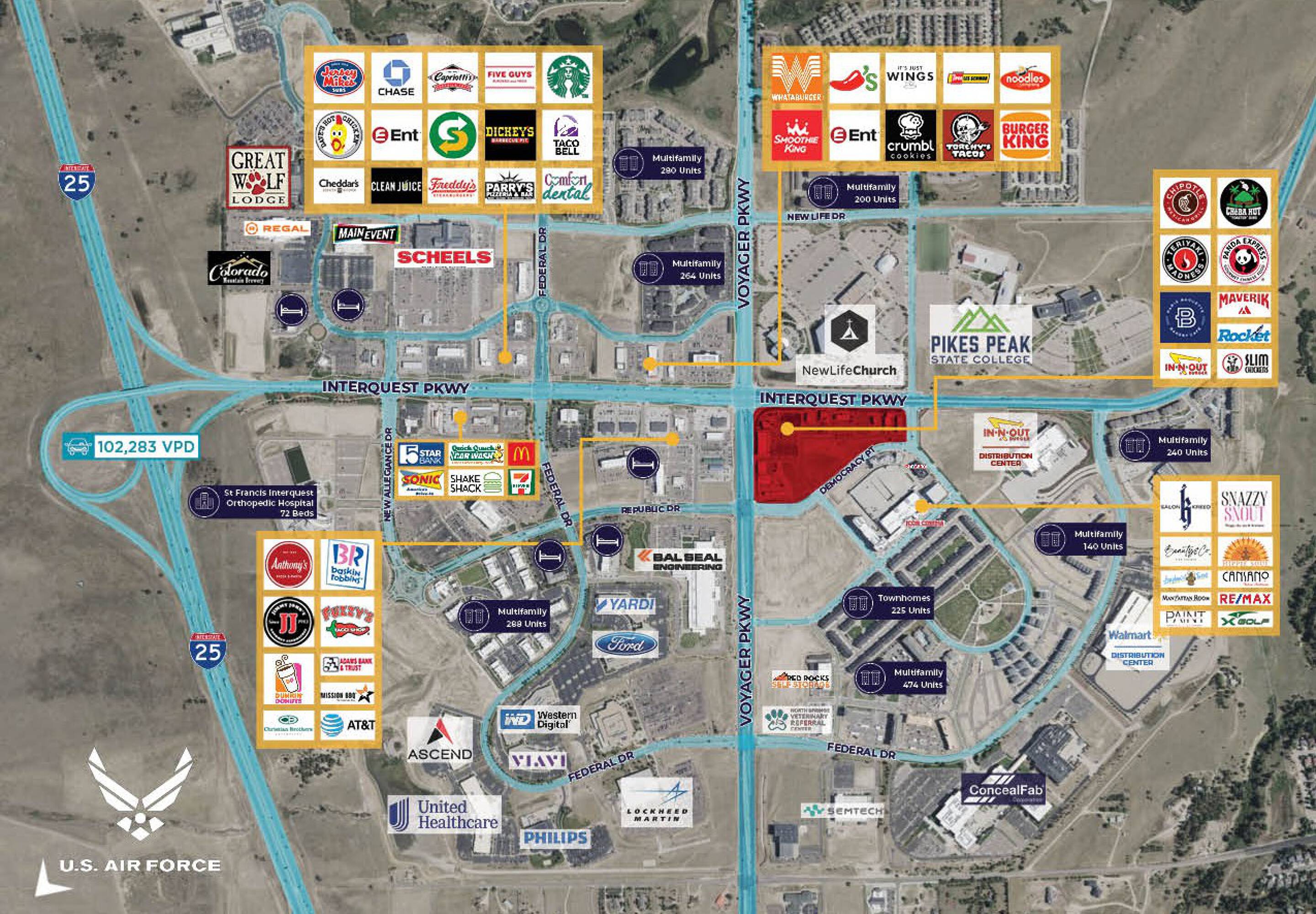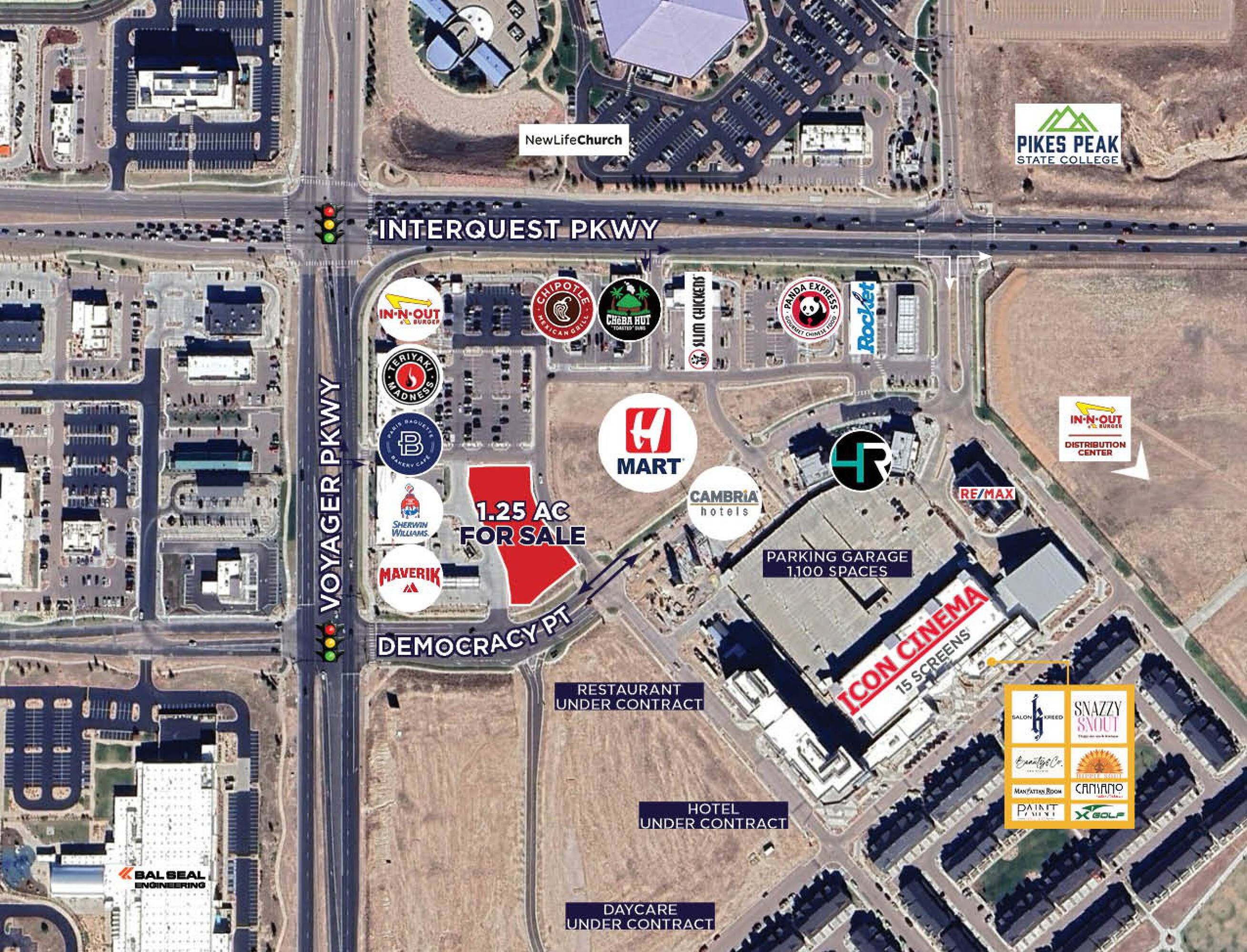This property features: Excellent location just off I‑25 at Interquest & Voyager Parkway.; Rapidly developing area in North Colorado Springs.; Mixed‑use development with integrated blend of retailers, office, entertainment, residential, and hotel.