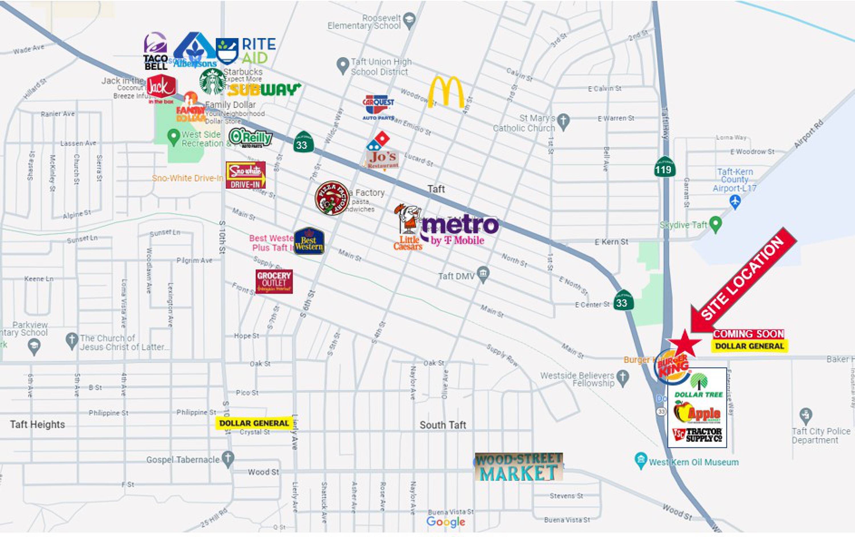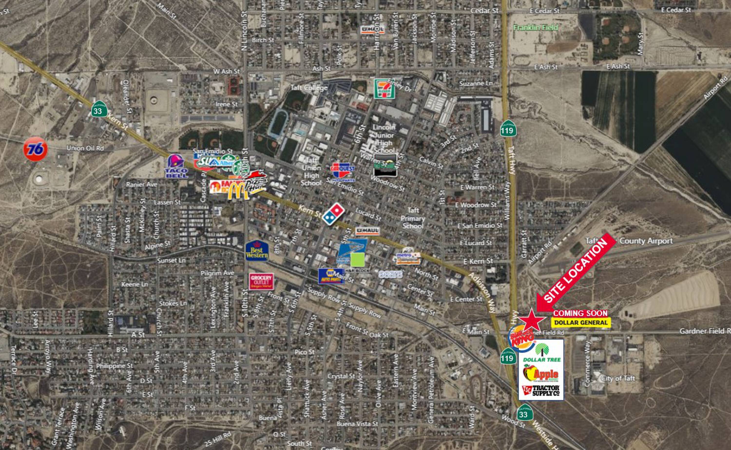 Land available for development or ground lease in Taft, CA.