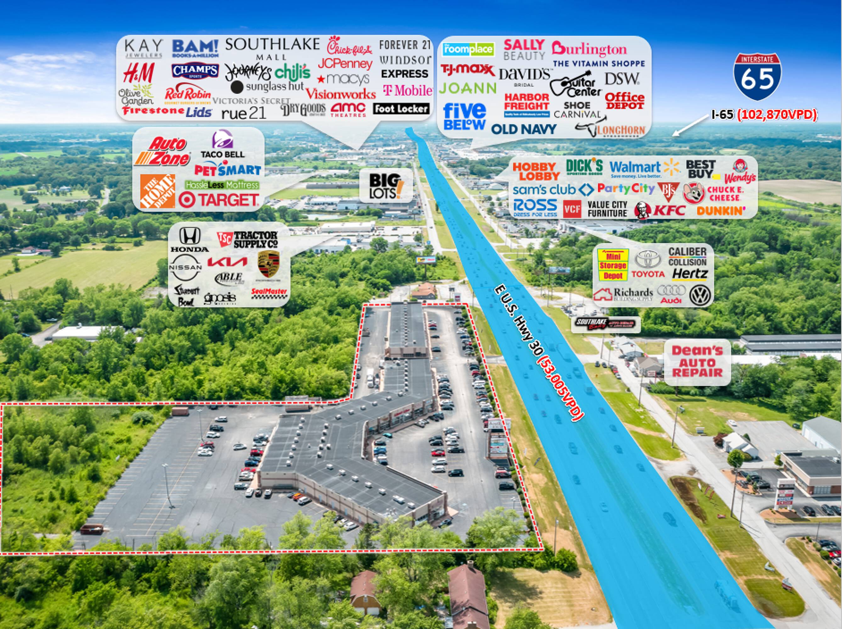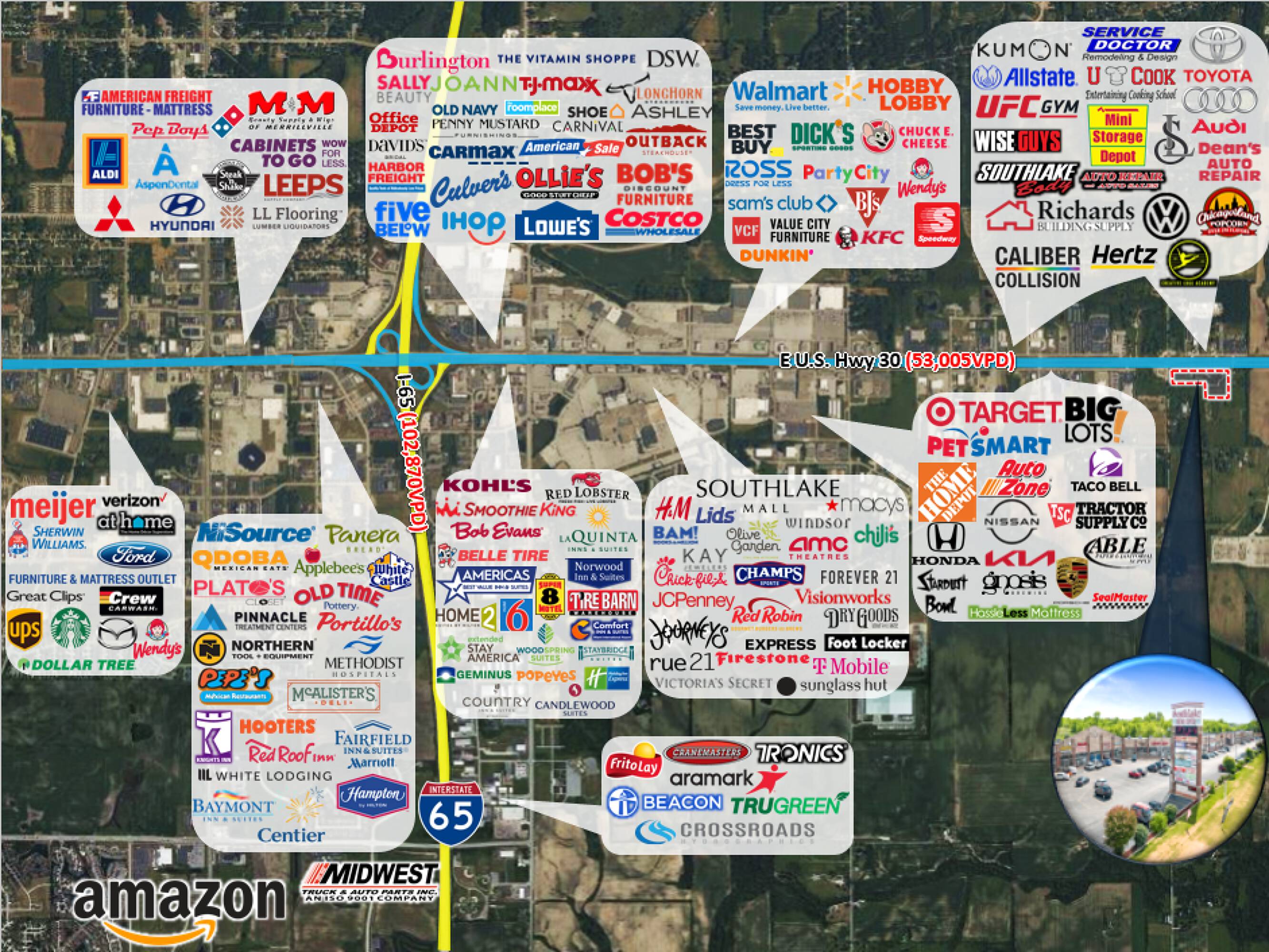 This property features: High visibility to US 30 Highway with 53,000+ vehicles per day.; Located near major retailers including Sam’s Club, Walmart, and Hobby Lobby.; Well‑maintained retail center built in 2005.