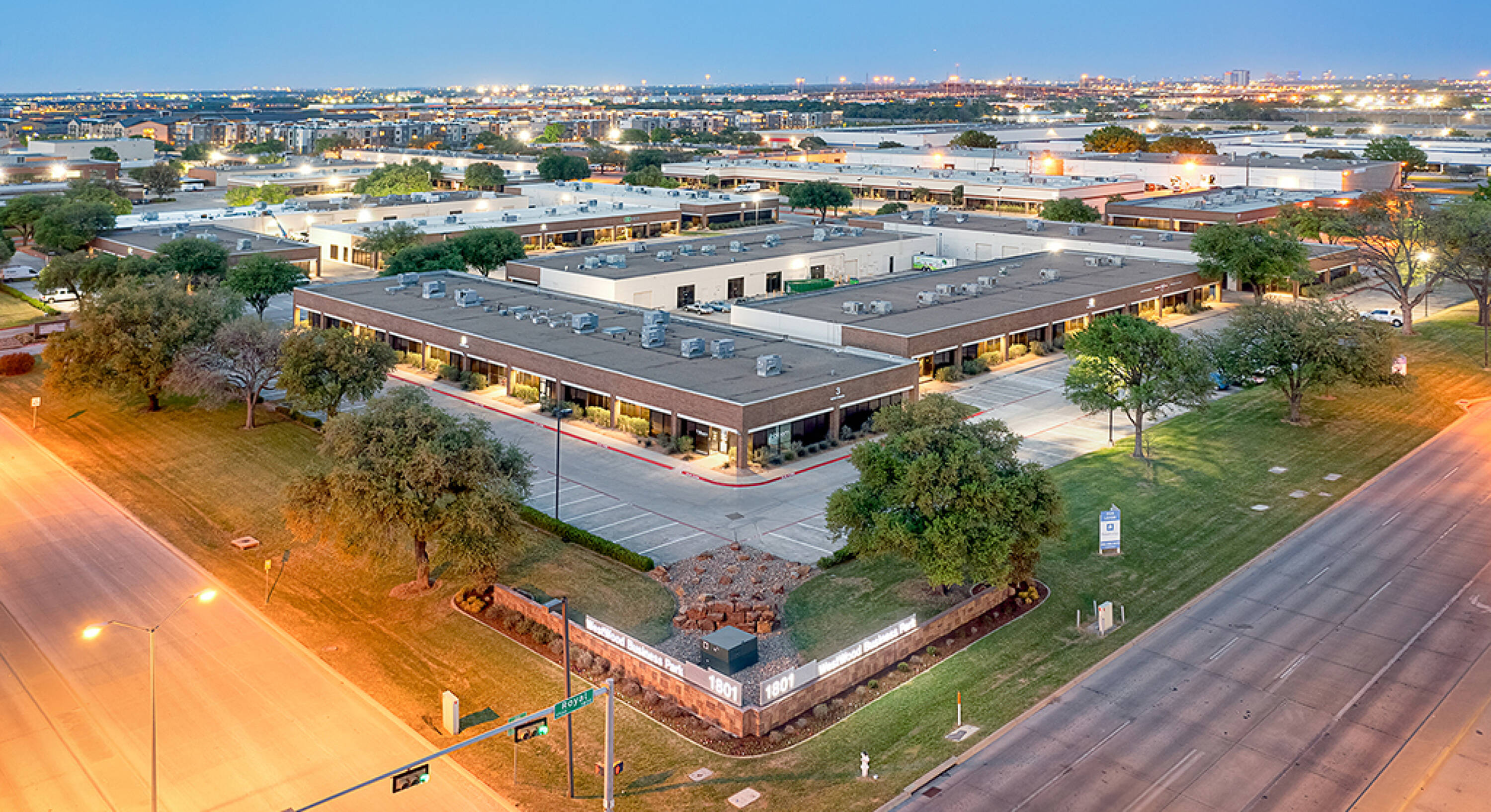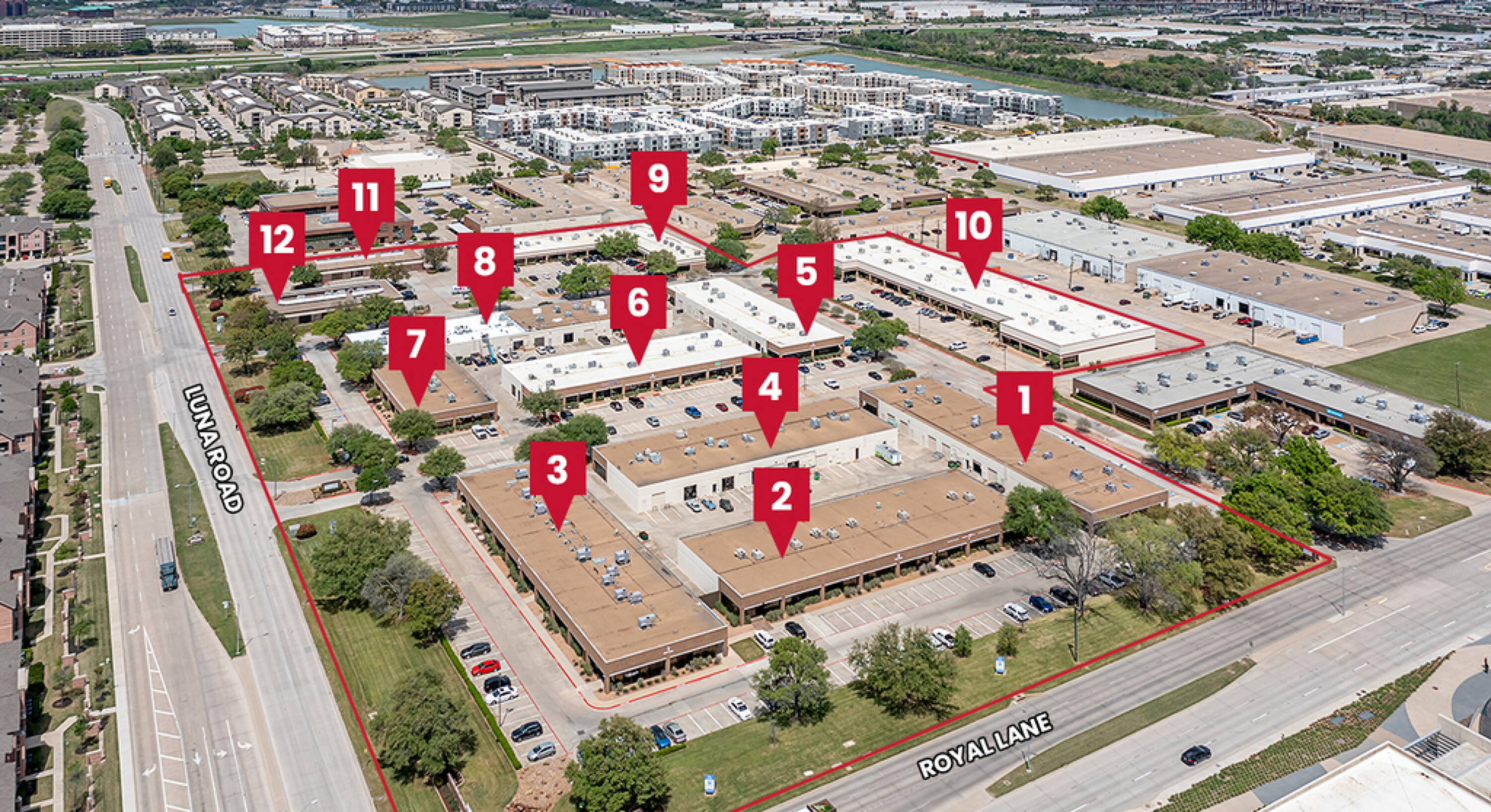 Office and industrial spaces in a 12-building business park.