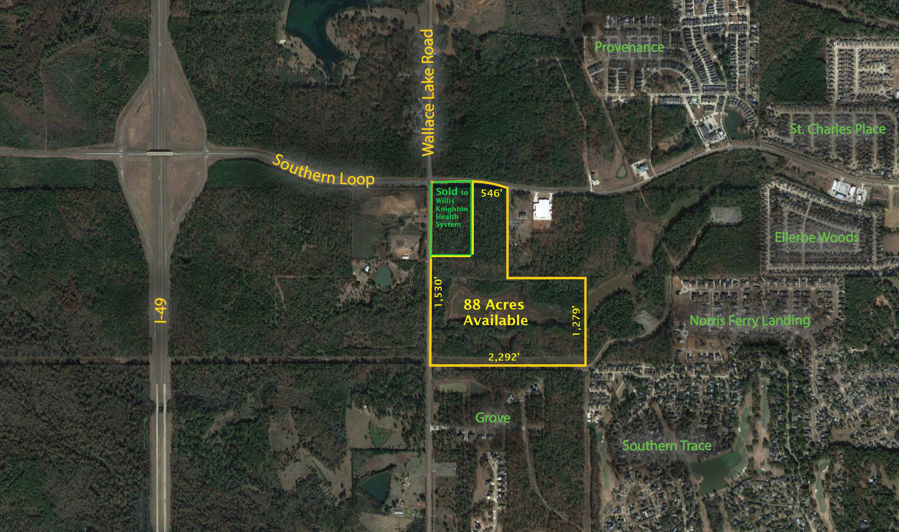 Up to 88 acres of prime commercial and residential land are available, remaining from an original 103-acre tract. The property is located off the northeast corner of Southern Loop and Wallace Lake Road, featuring 546 feet of frontage on Southern Loop and 1,530 feet of frontage on Wallace Lake Road. Willis Knighton Health System has purchased 15 acres at the corner of Wallace Lake and Southern Loop. The site is strategically positioned on the 'going home' side of Southern Loop from the I-49 exit. It can accommodate various uses, including a lifestyle center, grocery store, retail, medical and professional buildings, and restaurants. A signalized light has been installed at the Southern Loop-Wallace Lake intersection.