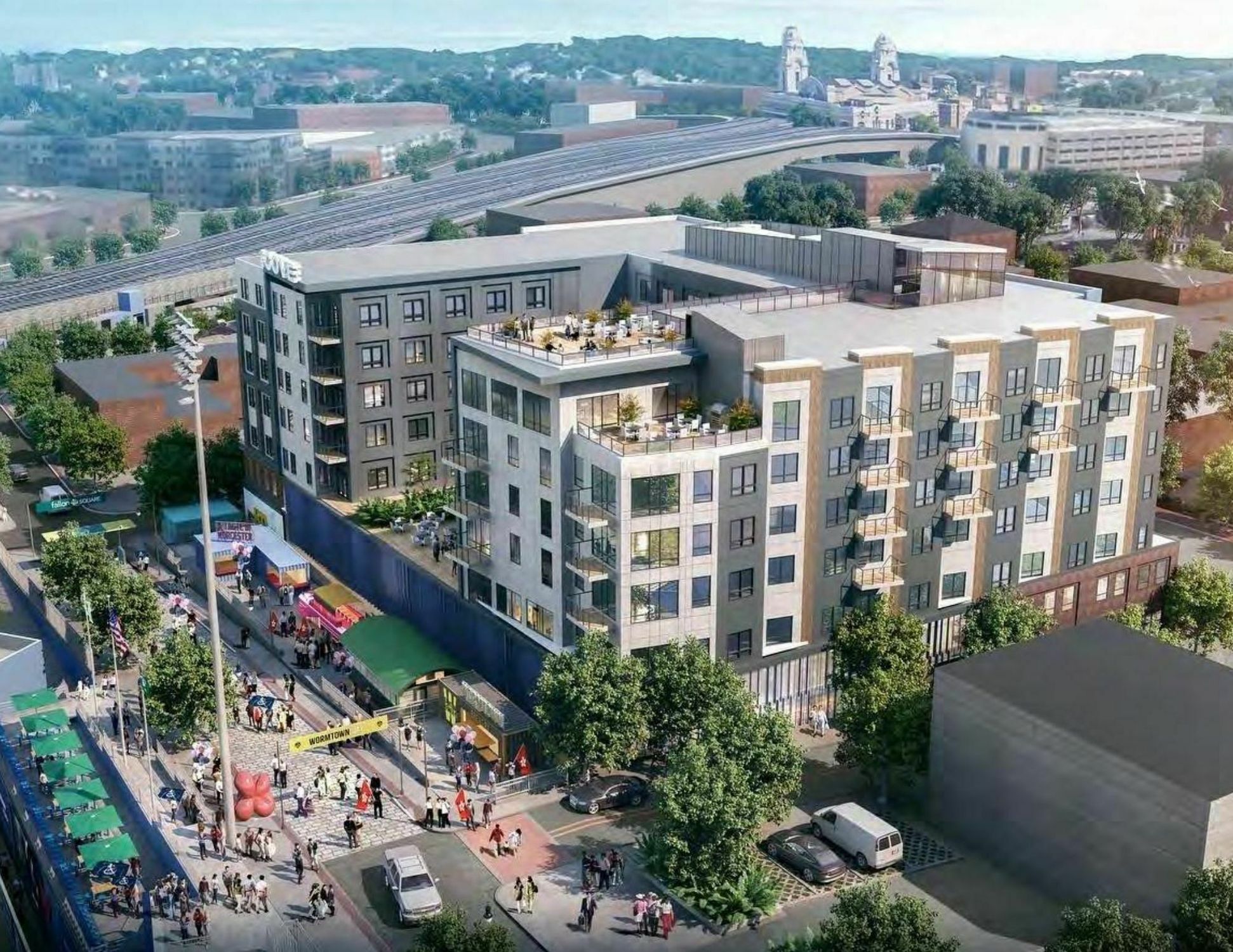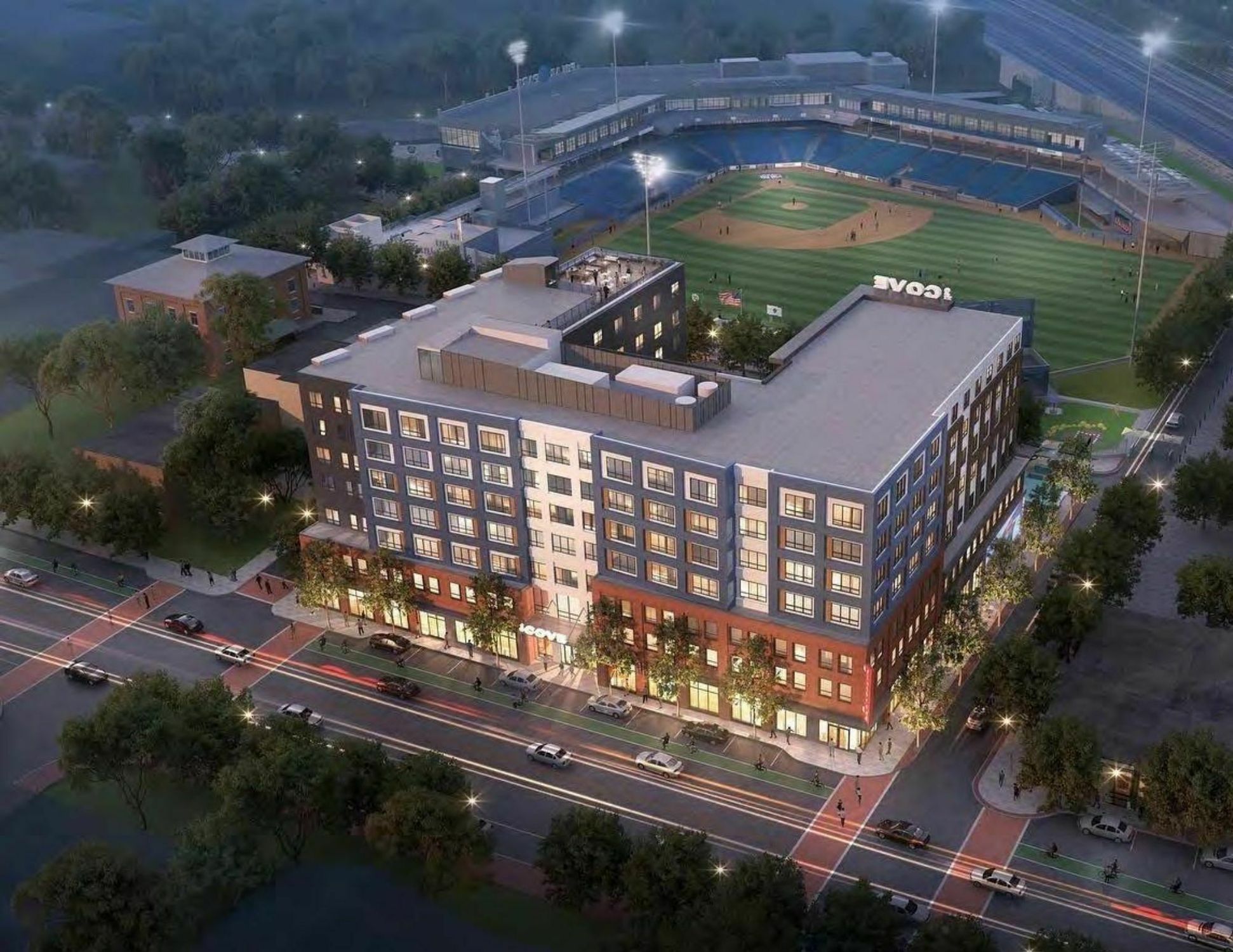 Corner retail space in new development with views of Polar Park.