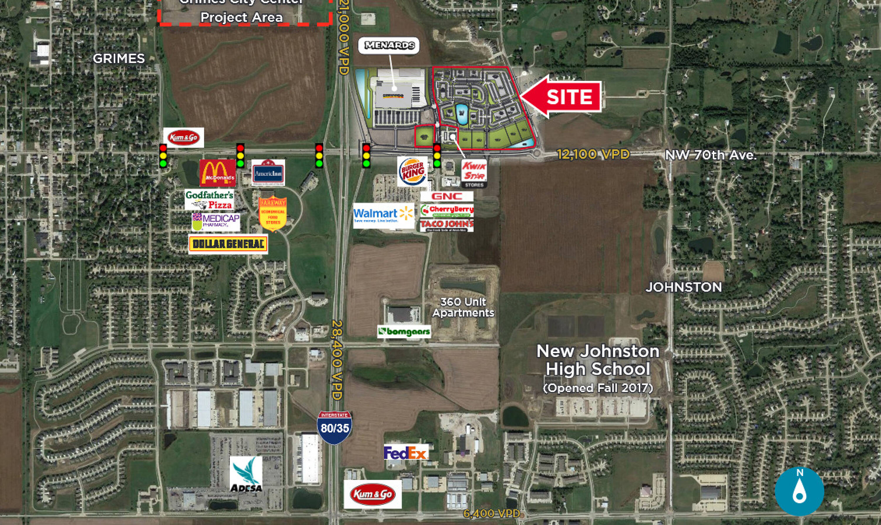 This property is zoned for highway commercial use and is strategically located on the northeast corner of the Highway 141 and Highway 44 interchange. It is adjacent to a new Menards and across from a Walmart Supercenter. The location benefits from rapidly growing residential developments in the area. Nearby retailers include Walmart Supercenter, Bomgaars, McDonald’s, Kum & Go, Charter Bank, and Fareway. The property is also located approximately 1/4 mile from the new Johnston High School, the largest high school in Iowa.