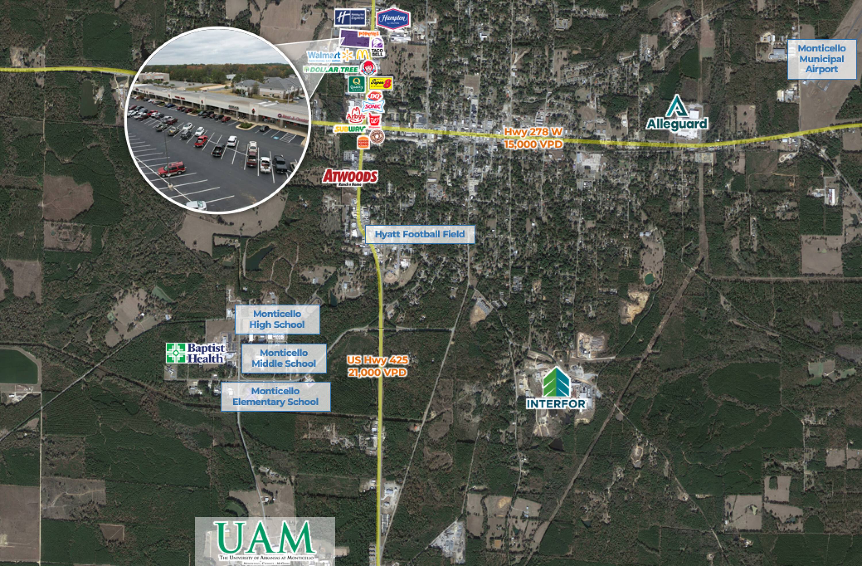 Northpark Village Shopping Center is a Walmart shadow center and reports 3.4 million visitors annually. The property is located off U.S. Hwy 425, which has a traffic volume of 21,000 vehicles per day, and is less than 3.5 miles from the University of Arkansas at Monticello, which has approximately 4,000 students. The shopping center is situated near the intersection of Hwy 278 W and U.S. Hwy 425 and provides 600 surface parking spaces. Current tenants include Hibbett Sports, Bealls, CATO, and Pizza Hut.