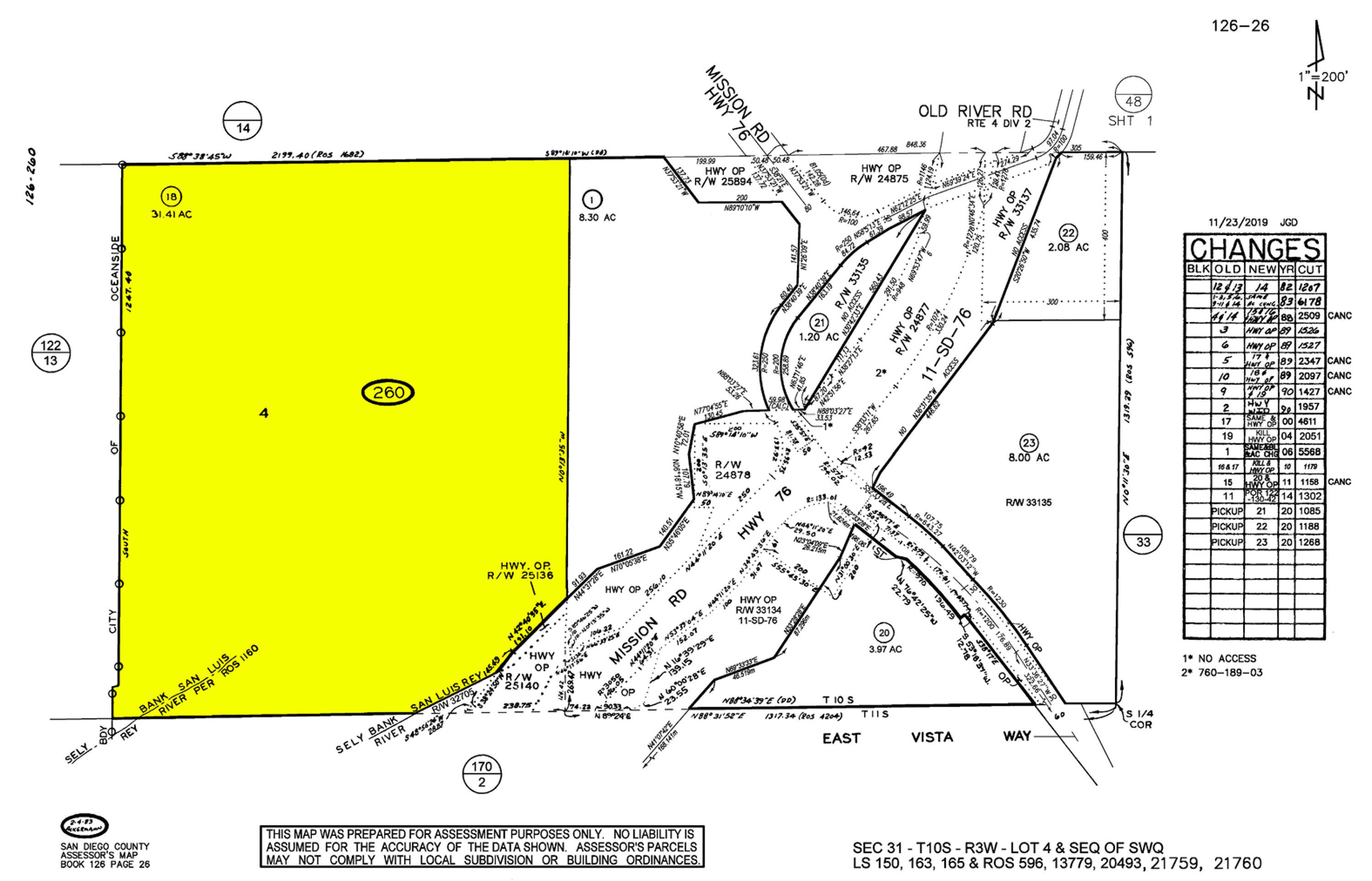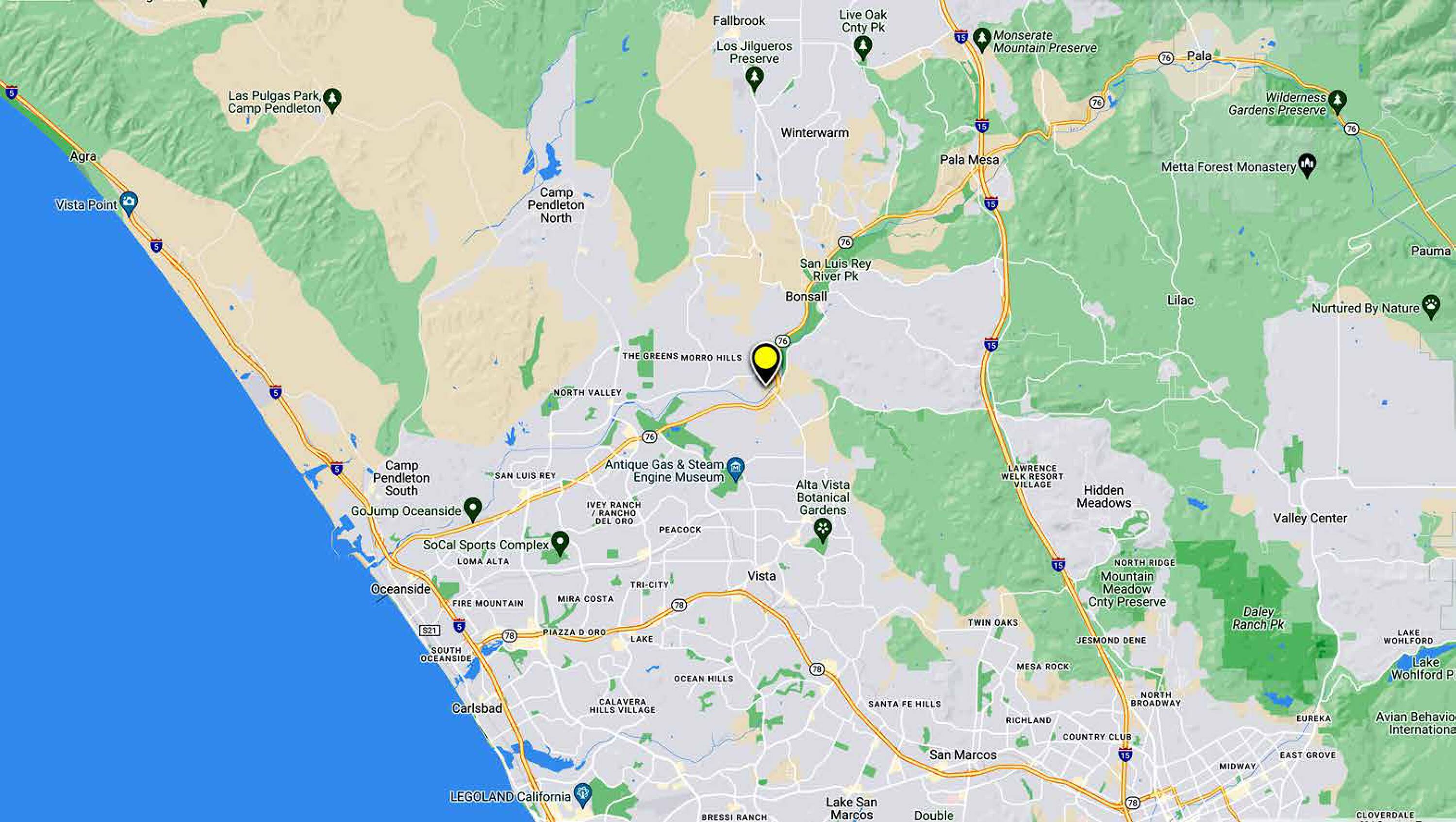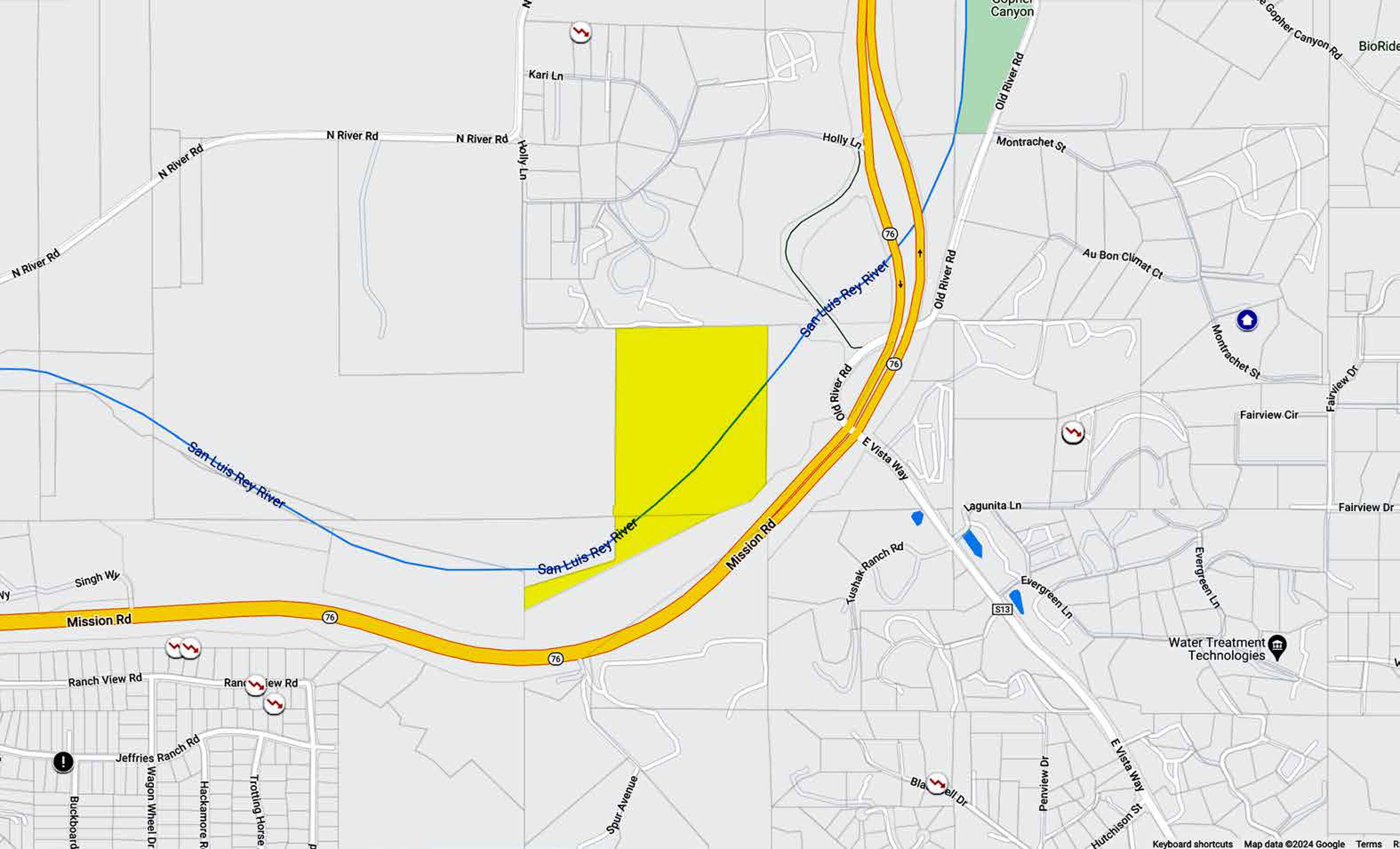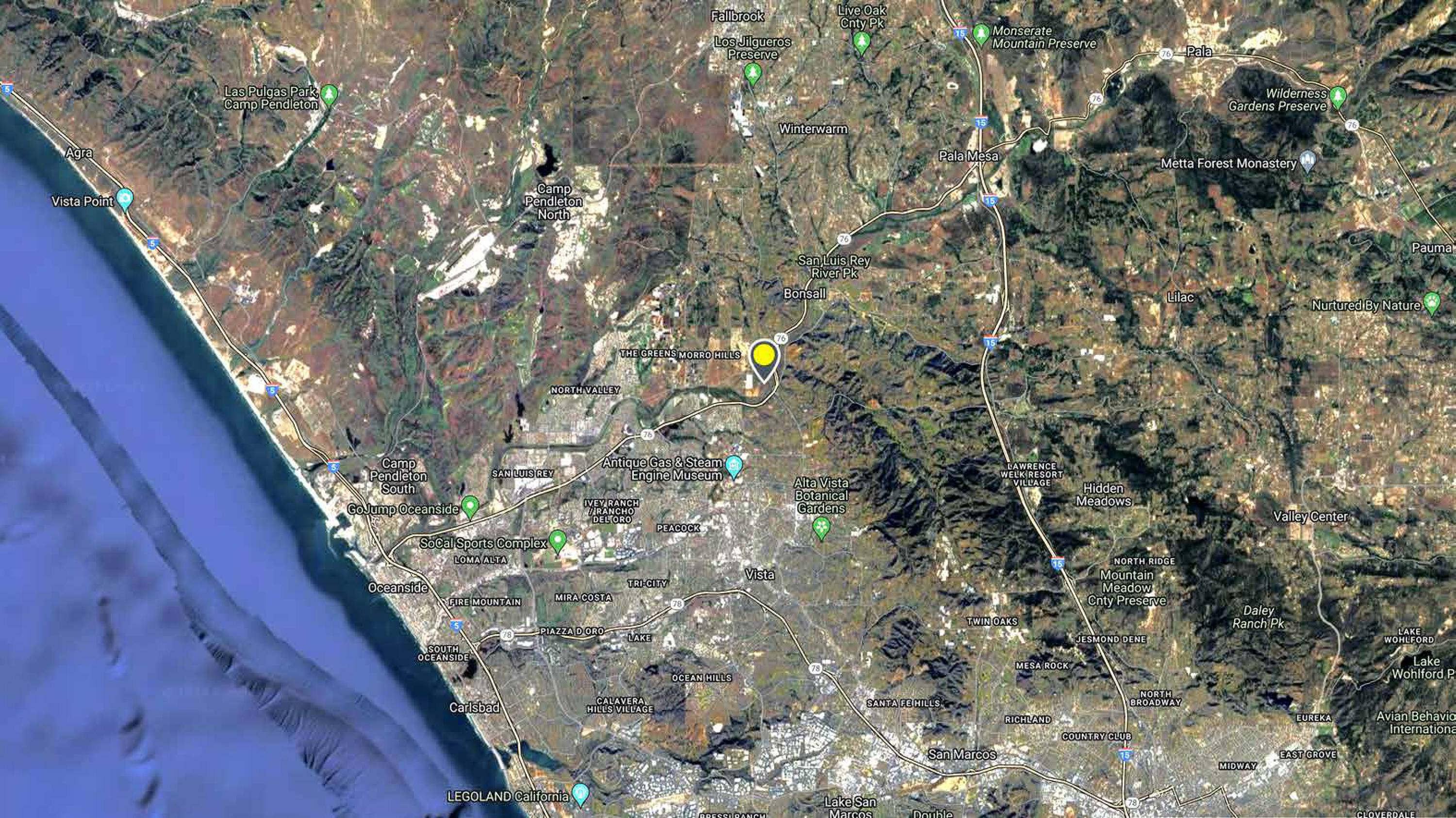 This property comprises 36.3 acres of land located in Bonsall, California. The parcel is situated at the intersection of CA-76 and Old River Road.