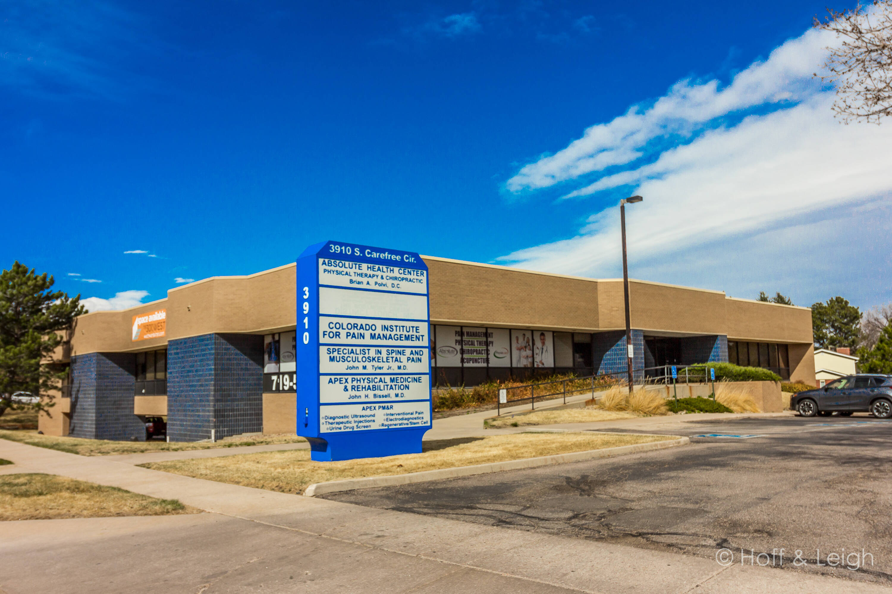 The property at 3910 S. Carefree Circle offers up to 10,124 square feet of medical office space. The building features abundant natural light and numerous exterior windows. Convenient parking is available. The property is located on the ground floor and is near Peak Vista Health Centers at Academy, making it a desirable location for medical practices.