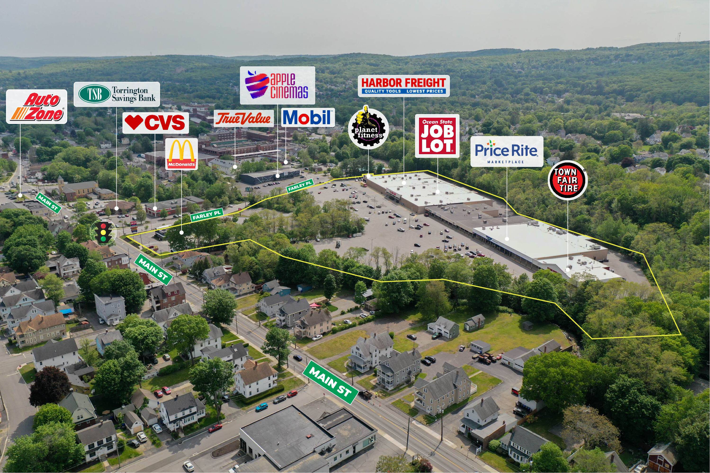 Located at 681 Main Street, Torrington, CT 06790, the Ocean State Job Lot Shopping Center offers leasing opportunities for retail, medical, or restaurant businesses. Available spaces range from 2,148 to 11,914 square feet within the 19.10-acre property. Current tenants include Ocean State Job Lot, Town Fair Tire, PriceRite, Planet Fitness, Harbor Freight Tools, McDonald’s, and Horizon Dental.