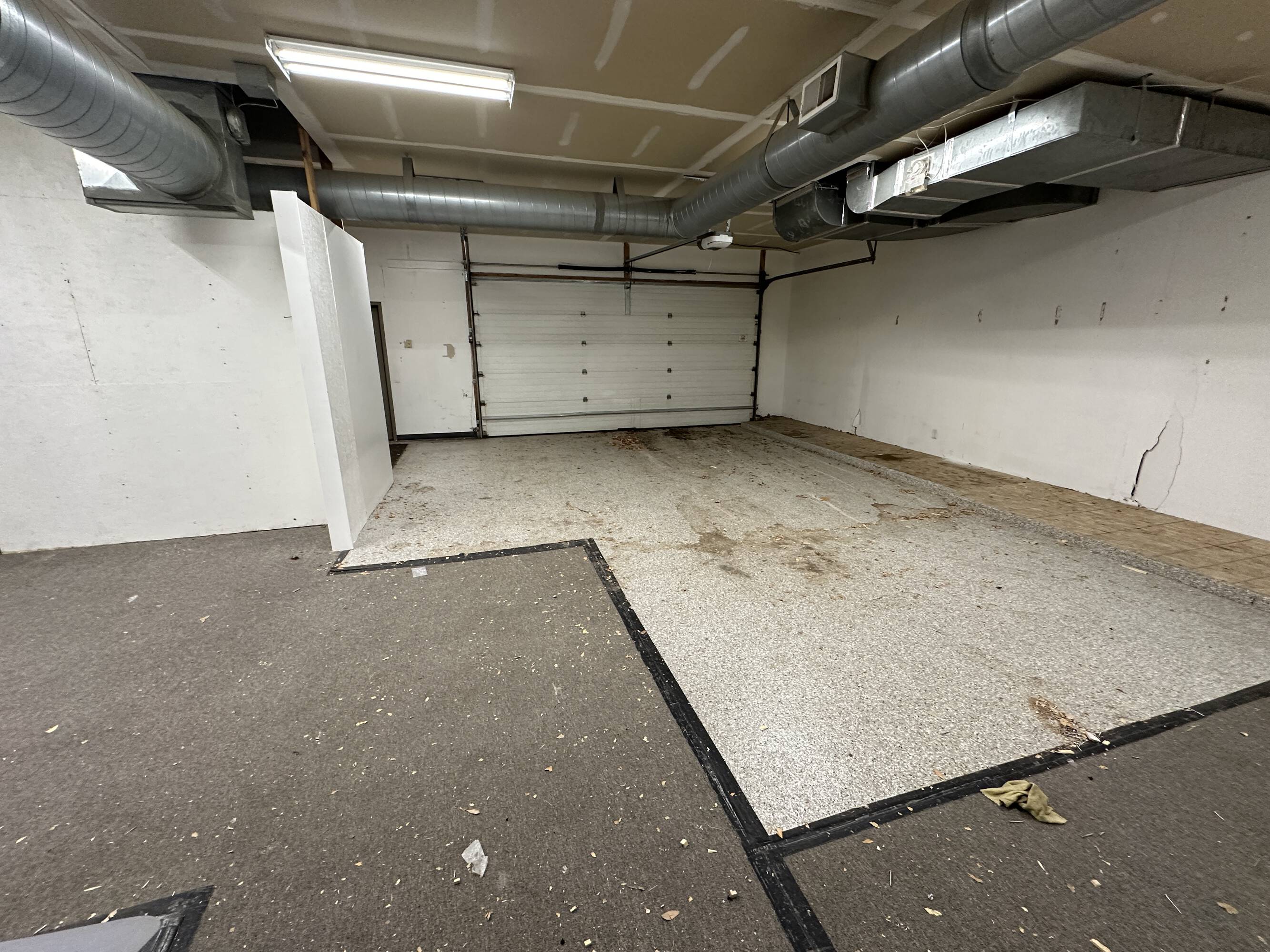 This property offers a combination of retail and warehouse space, suitable for various business operations. The front area features a showroom with storefront glass, providing visibility and display opportunities. The rear portion includes a warehouse or production area accessible via an overhead garage door, facilitating storage and operational needs. The property is positioned in a commercially active area with retail, building products, restaurants, and entertainment venues.
