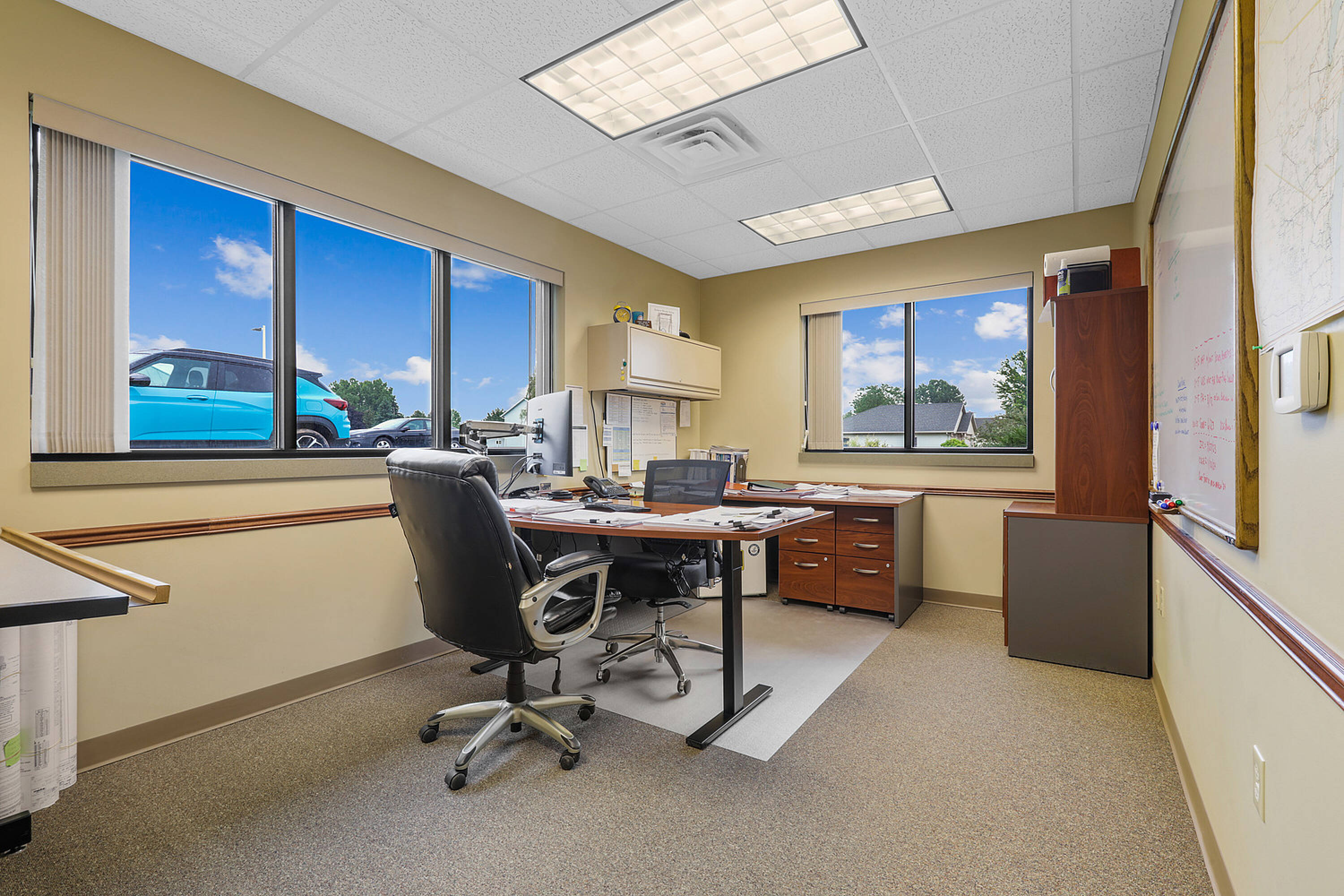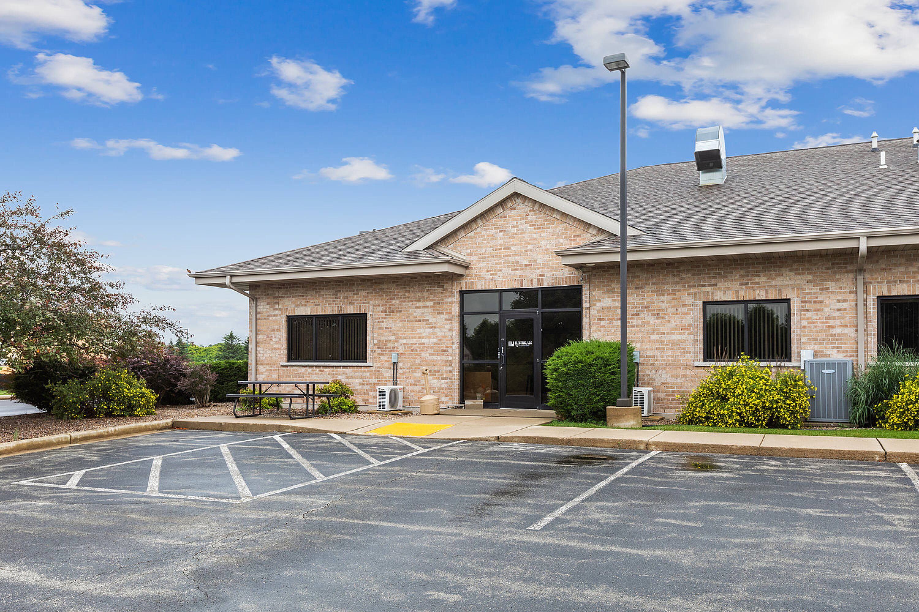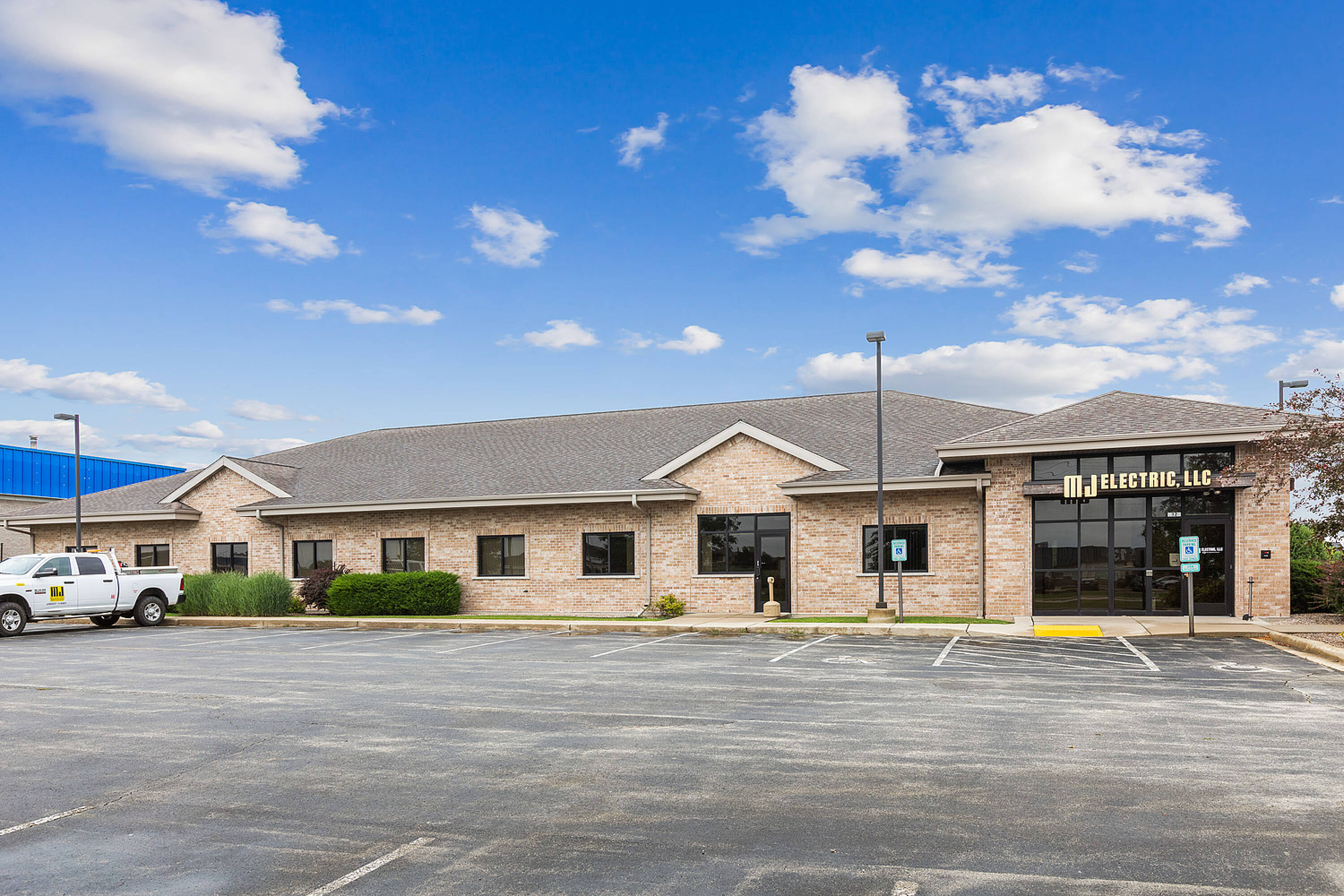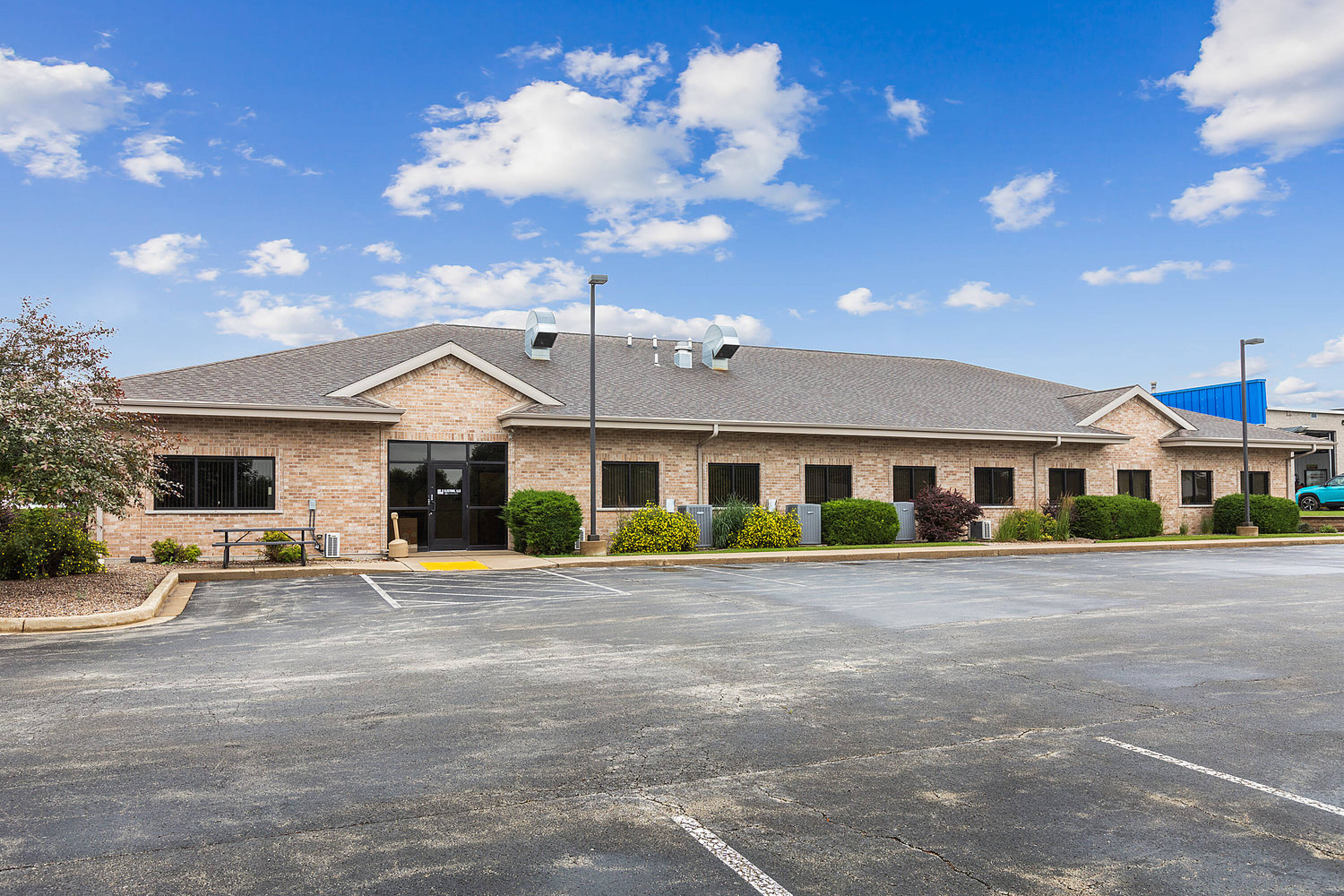 Single-story office building with ample parking and natural light.