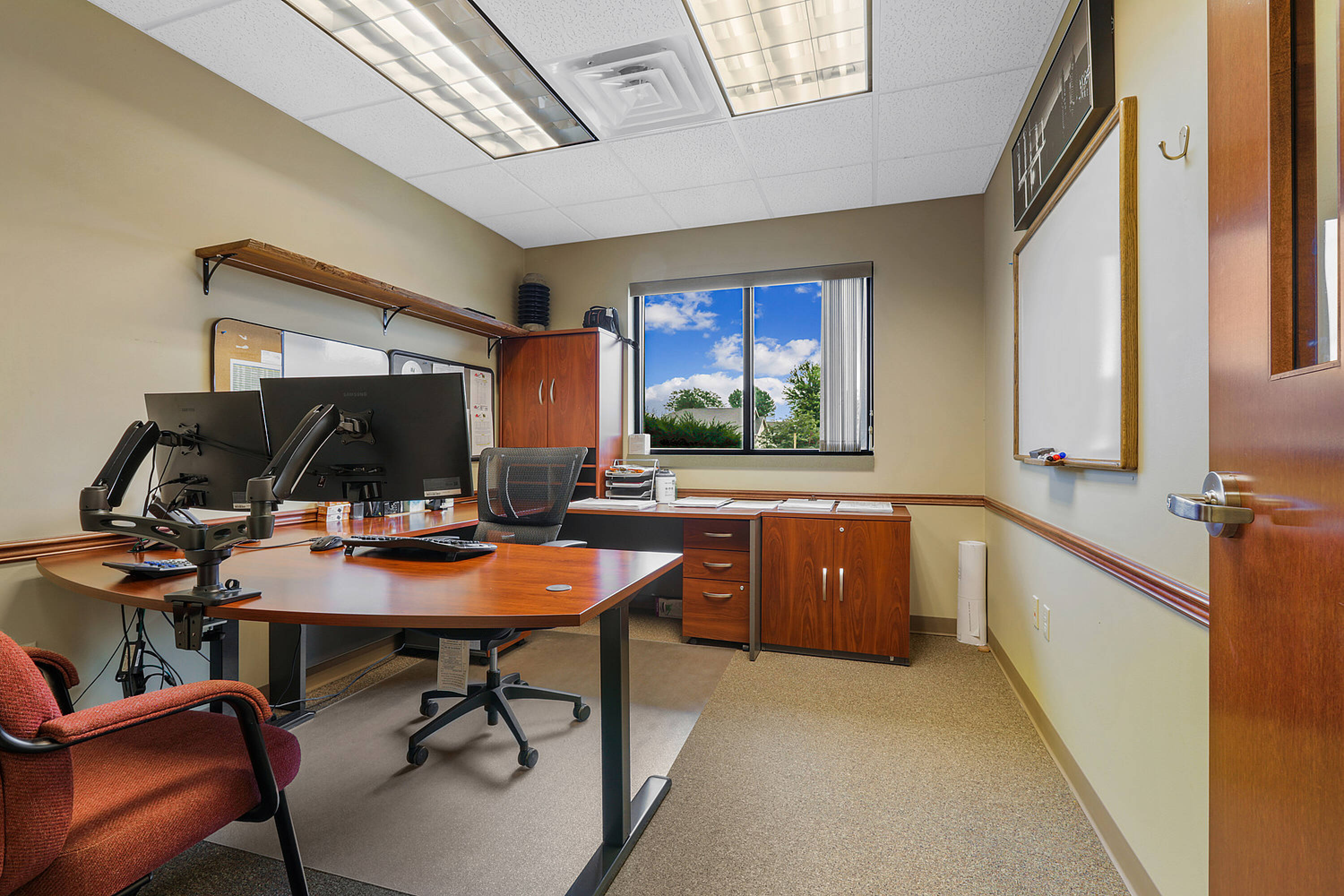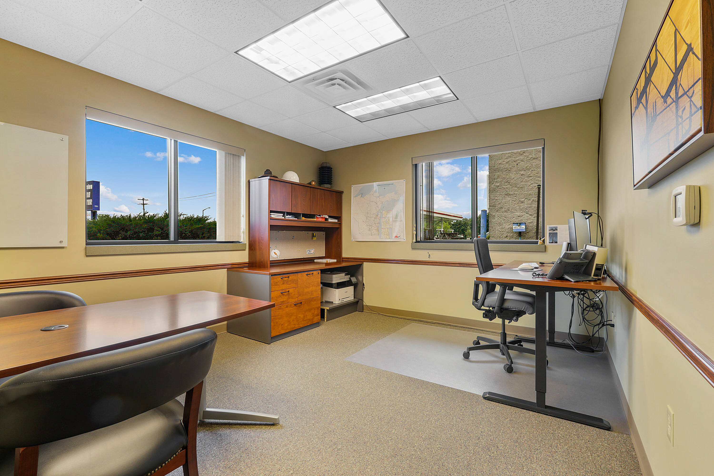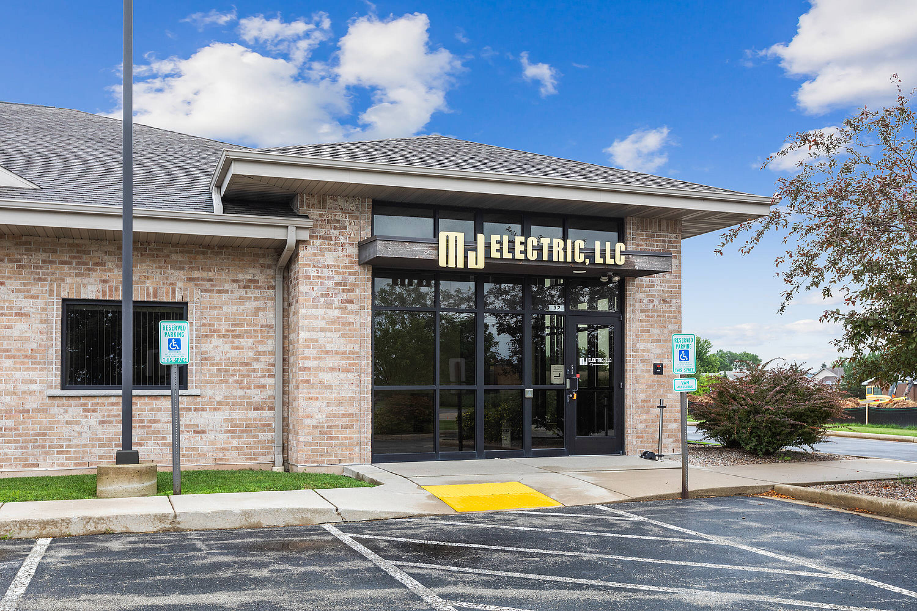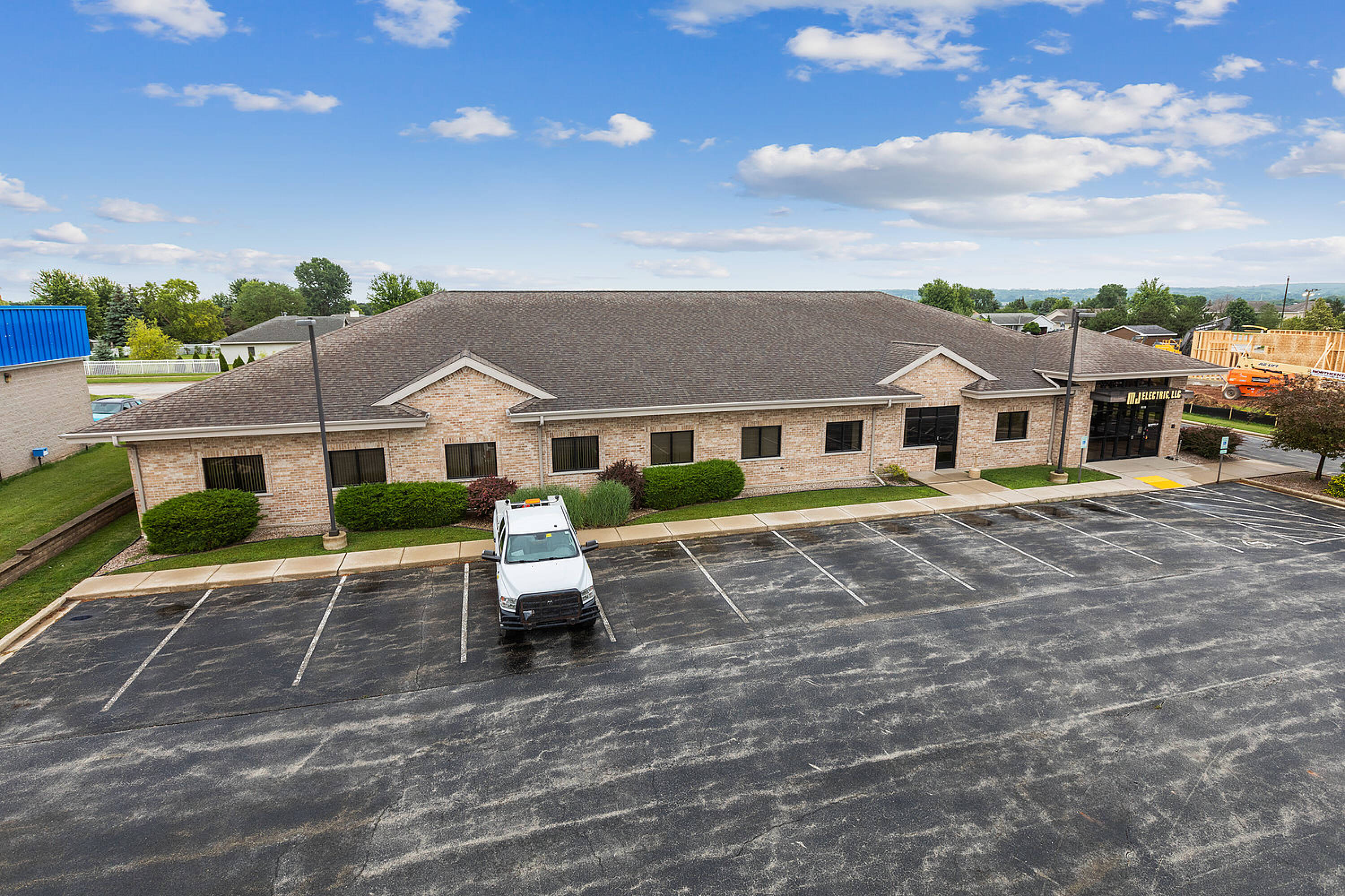 Single-story office building with ample parking and natural light.