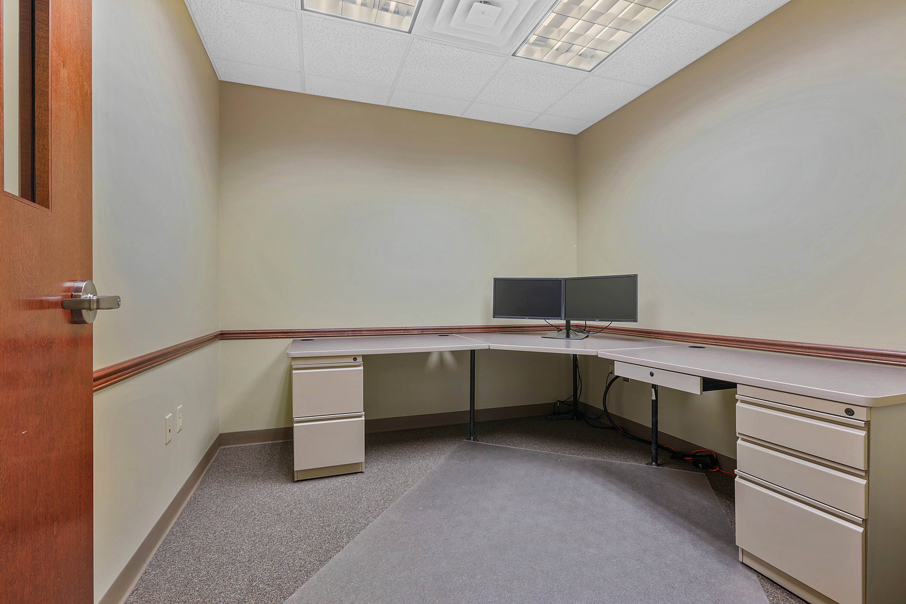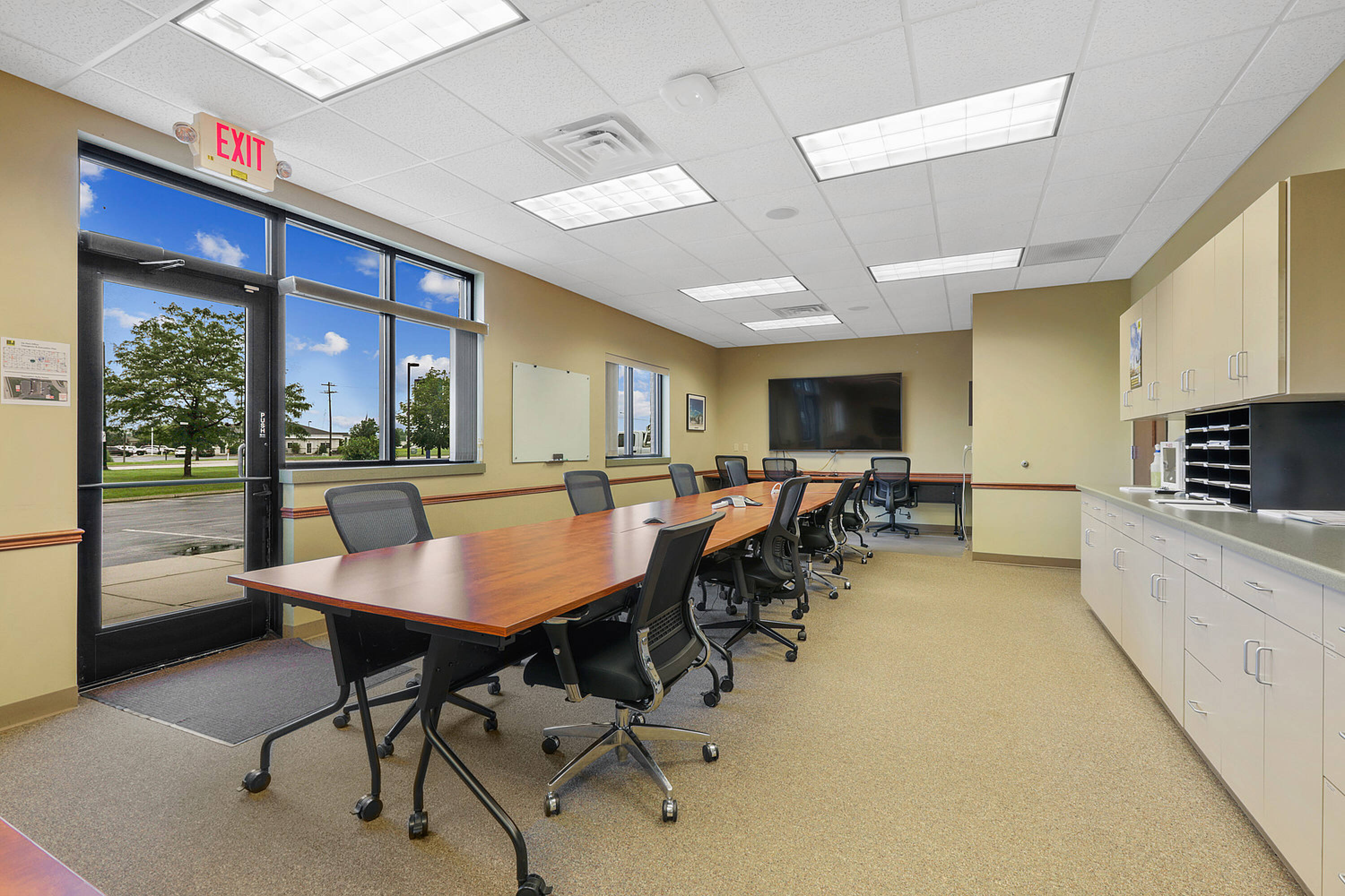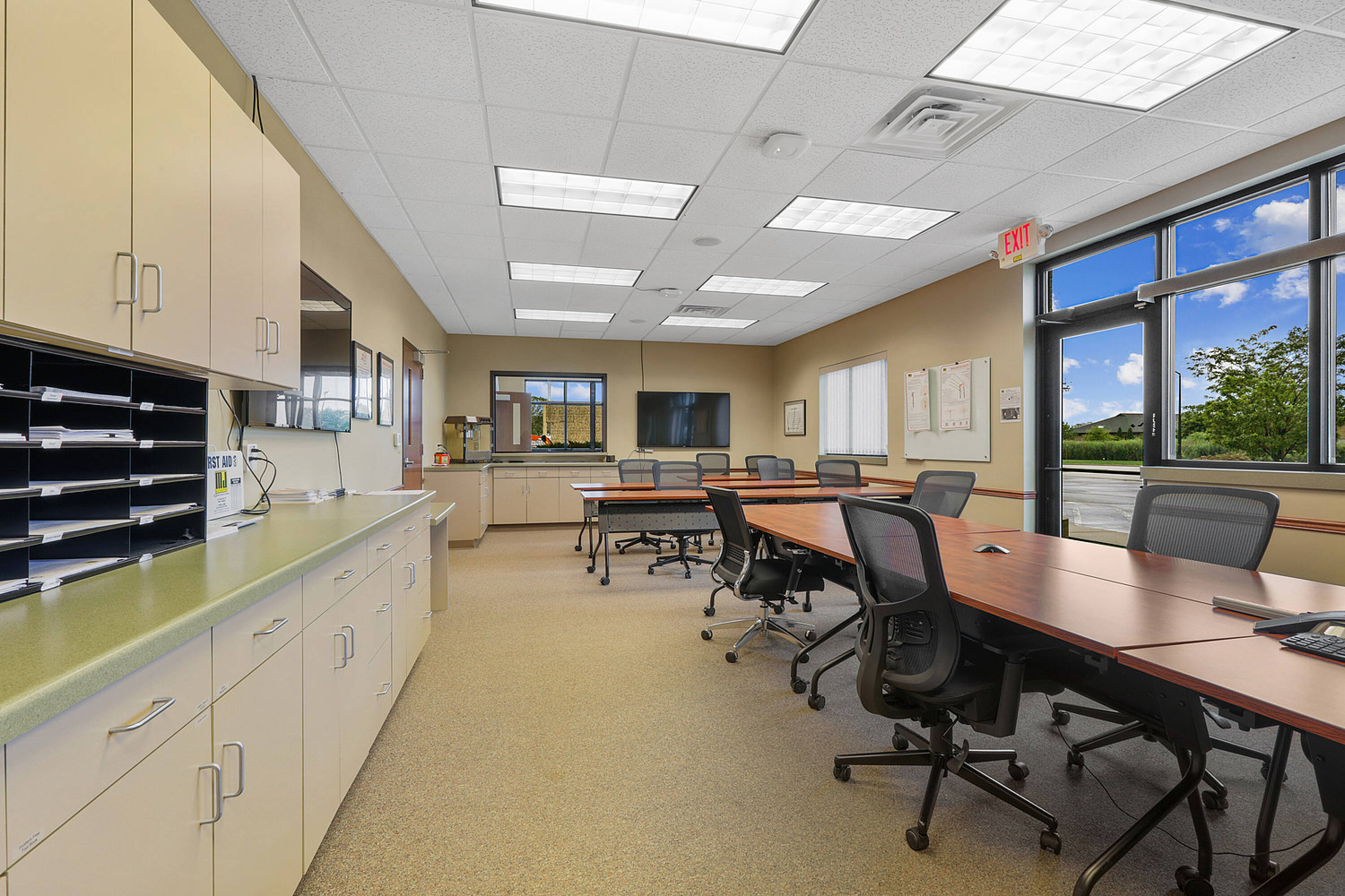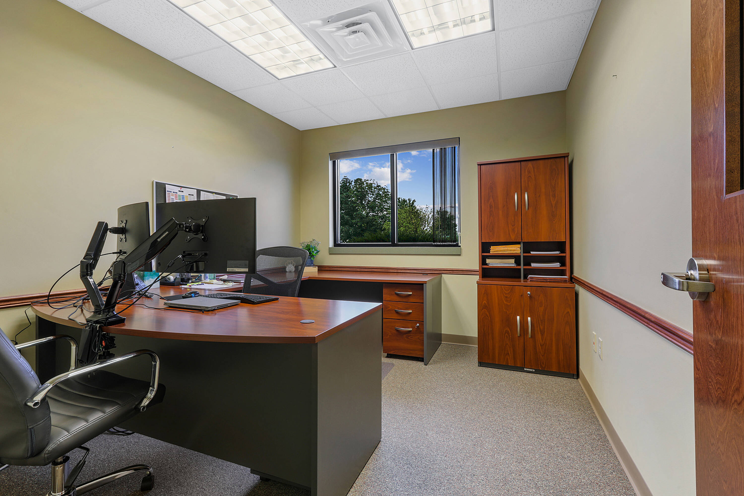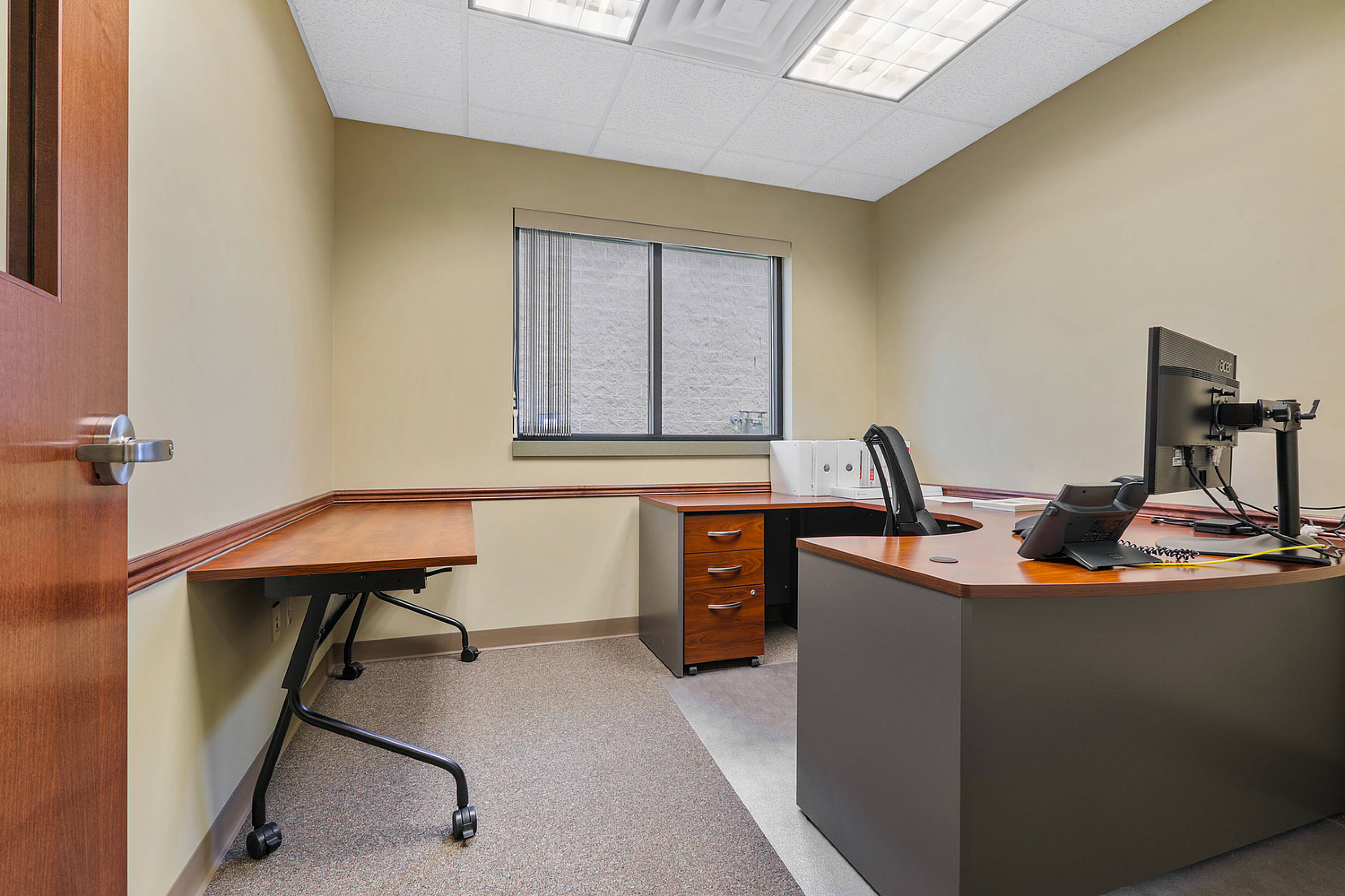 Single-story office building with ample parking and natural light.