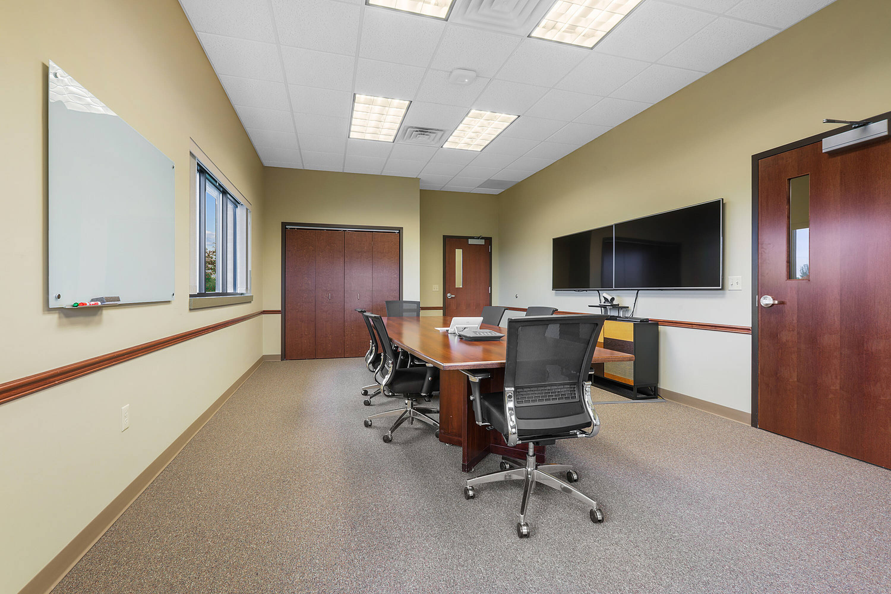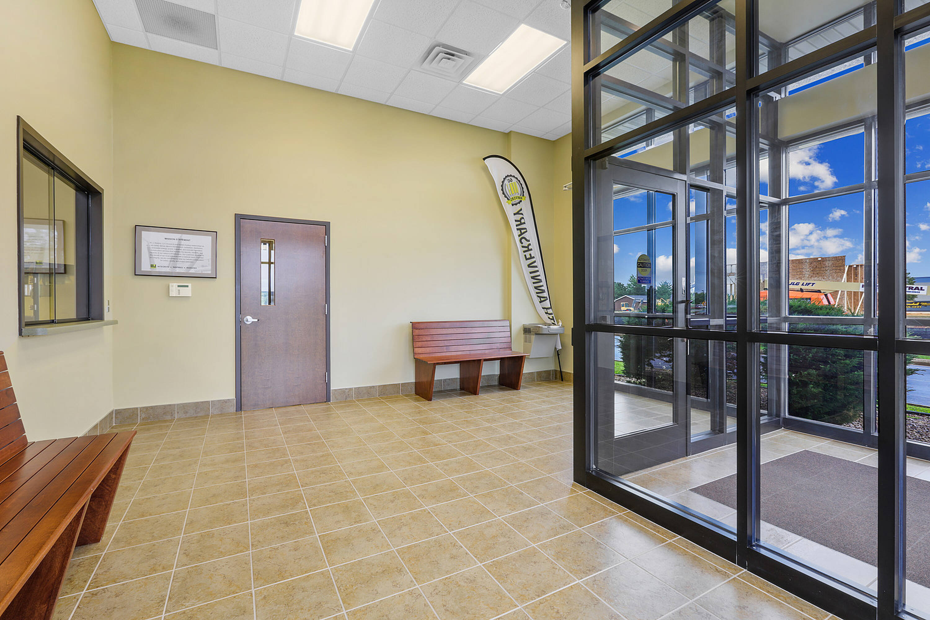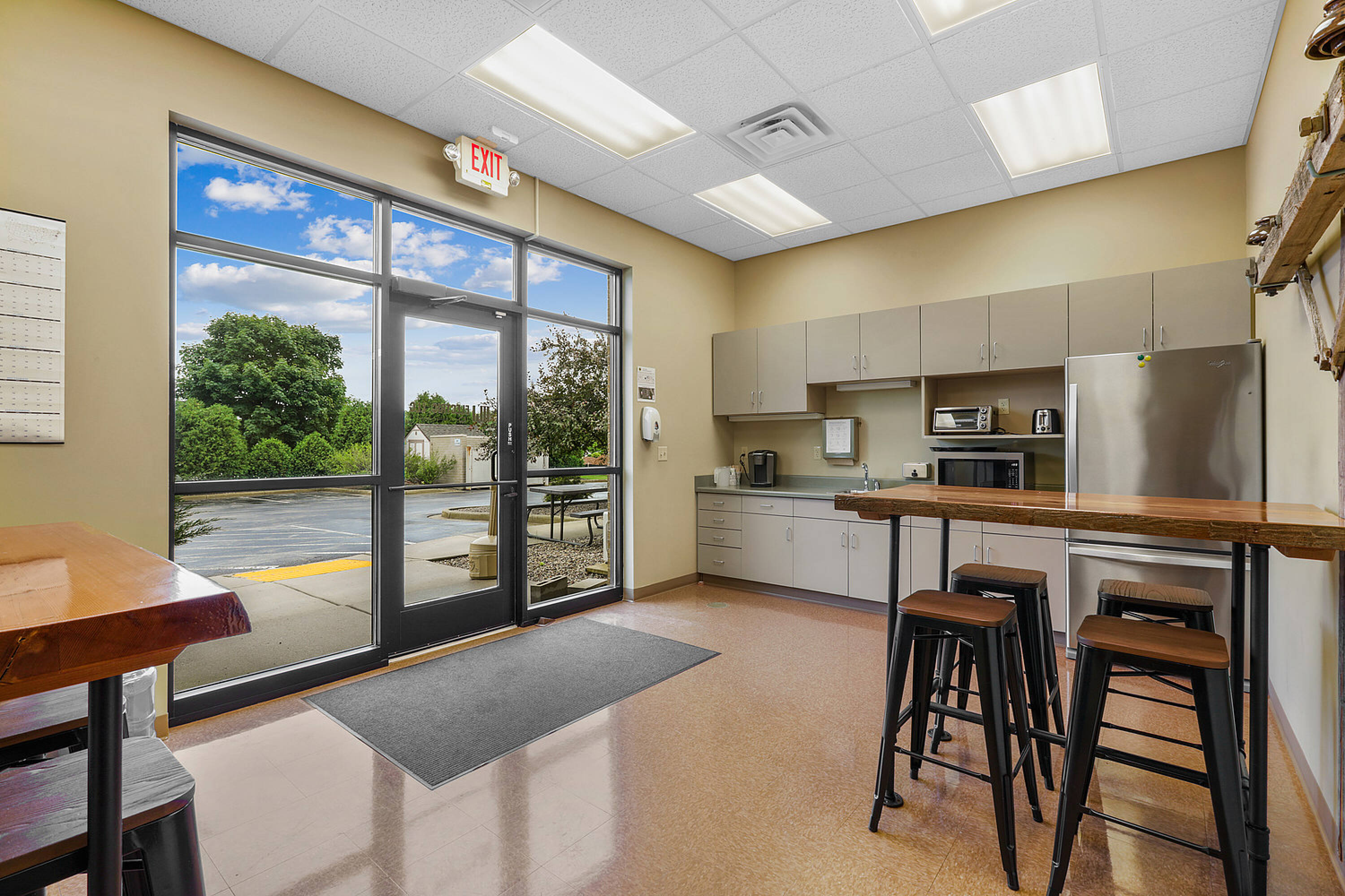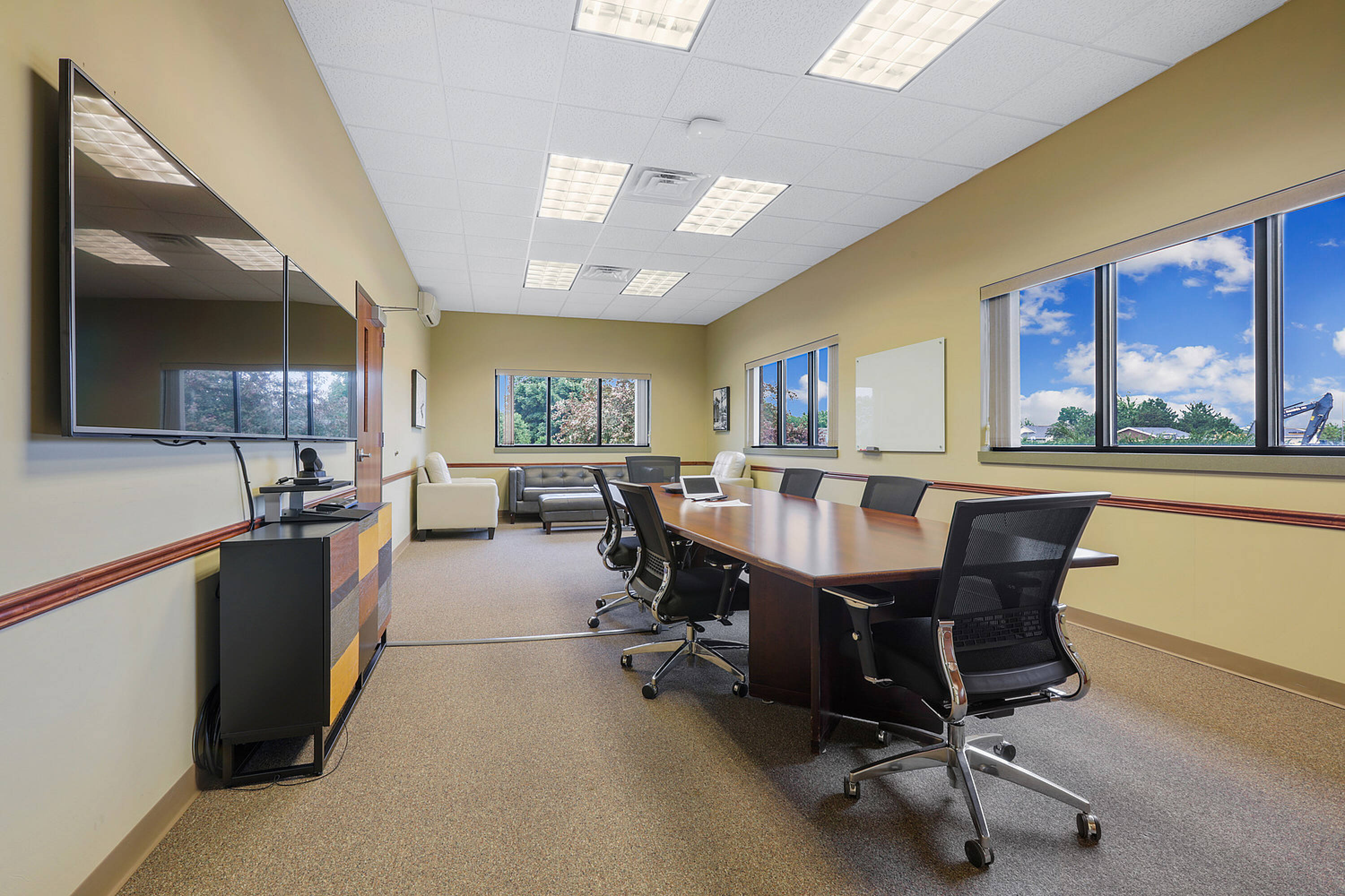 Single-story office building with ample parking and natural light.