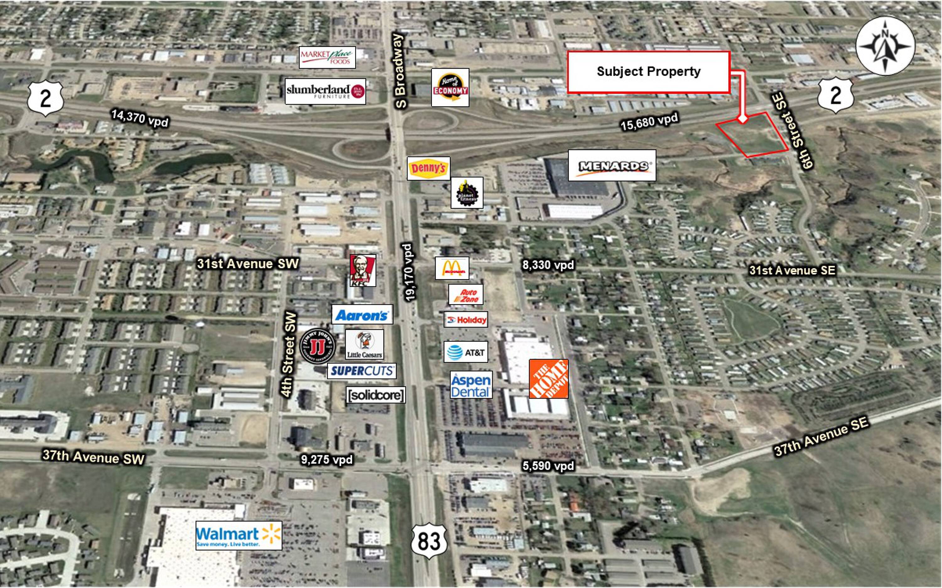 This property consists of 4.18 acres (181,971 square feet) of commercial land. It is located just south of US Highway 2 along 6th Street SE in Minot, North Dakota. The site benefits from good visibility from Highway 2 and features turn lanes from both directions onto 6th Street S.