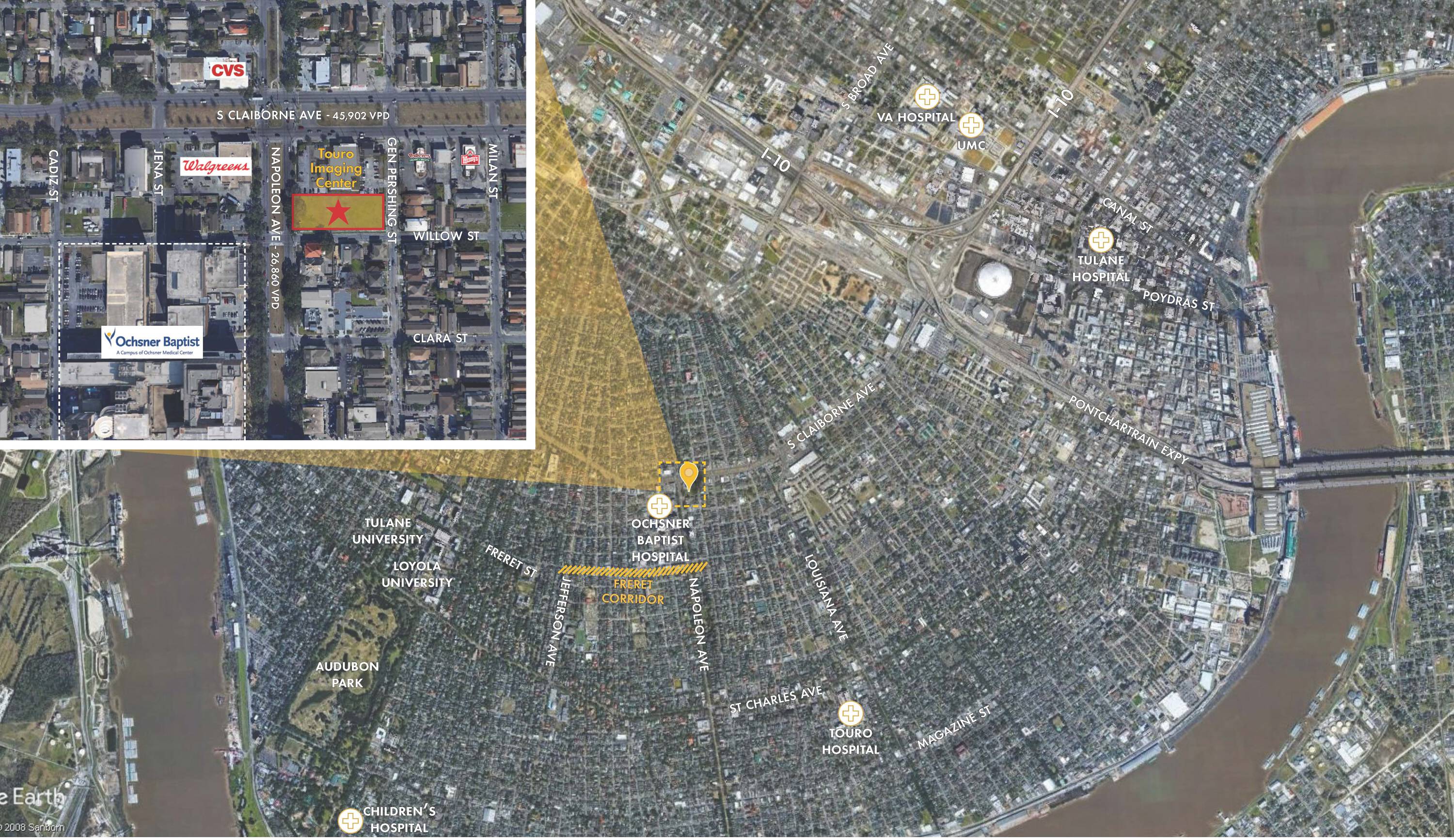 This property features: Prime location facing Napoleon Avenue, adjacent to Ochsner Baptist Medical Complex and Touro LCMC Imaging Center.; Large 36,000 sq ft lot, comprising approximately half the block.; Zoned MU‑1, allowing for a variety of potential uses.