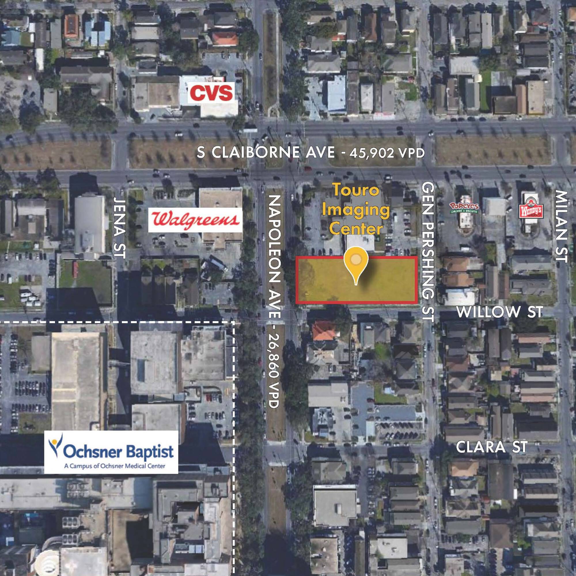 This 36,000 square foot lot is available for rent. It faces Napoleon Avenue and the Ochsner Baptist Medical Complex. Bounded by Willow and General Pershing Streets, the site makes up approximately half the block. The property is directly adjacent to Touro LCMC Imaging Center. It is zoned MU-1 and well-suited for a medical development as well as a variety of other uses. The owner will consider a build-to-suit development. The taxes are $10,364.40 per year.