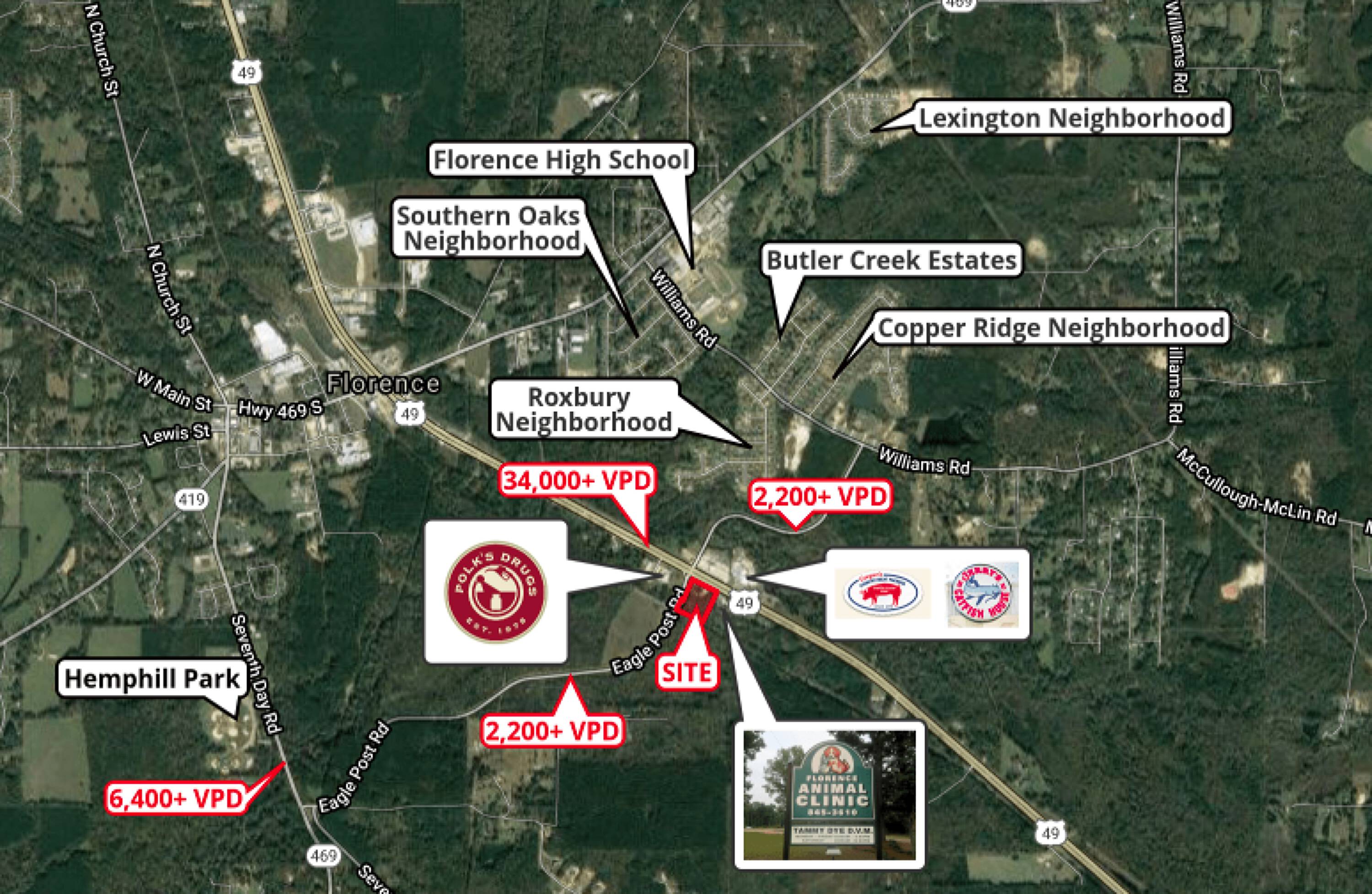 This property presents an excellent development opportunity on Highway 49 South in Florence, Mississippi, situated at the intersection of Eagle Post Road. As a hard corner property, it benefits from frontage on Highway 49, providing access and visibility to traffic exceeding 34,000 vehicles per day. Eagle Post Road's connection to Highway 469, which sees over 6,400 vehicles per day, further enhances the property's exposure to both local residents and the high traffic volume on Highway 49. The location is just south of Main Street Florence and offers convenient proximity to several residential developments. Notable businesses and attractions in the vicinity include Polk's Drugs & Gas Station, Jerry's Catfish House, Cooper's Country Meat Packers, and Florence Animal Clinic. The property is located 13 miles south of Jackson, Mississippi, 78 miles from Hattiesburg, and 178 miles from Gulfport when traveling on Highway 49.