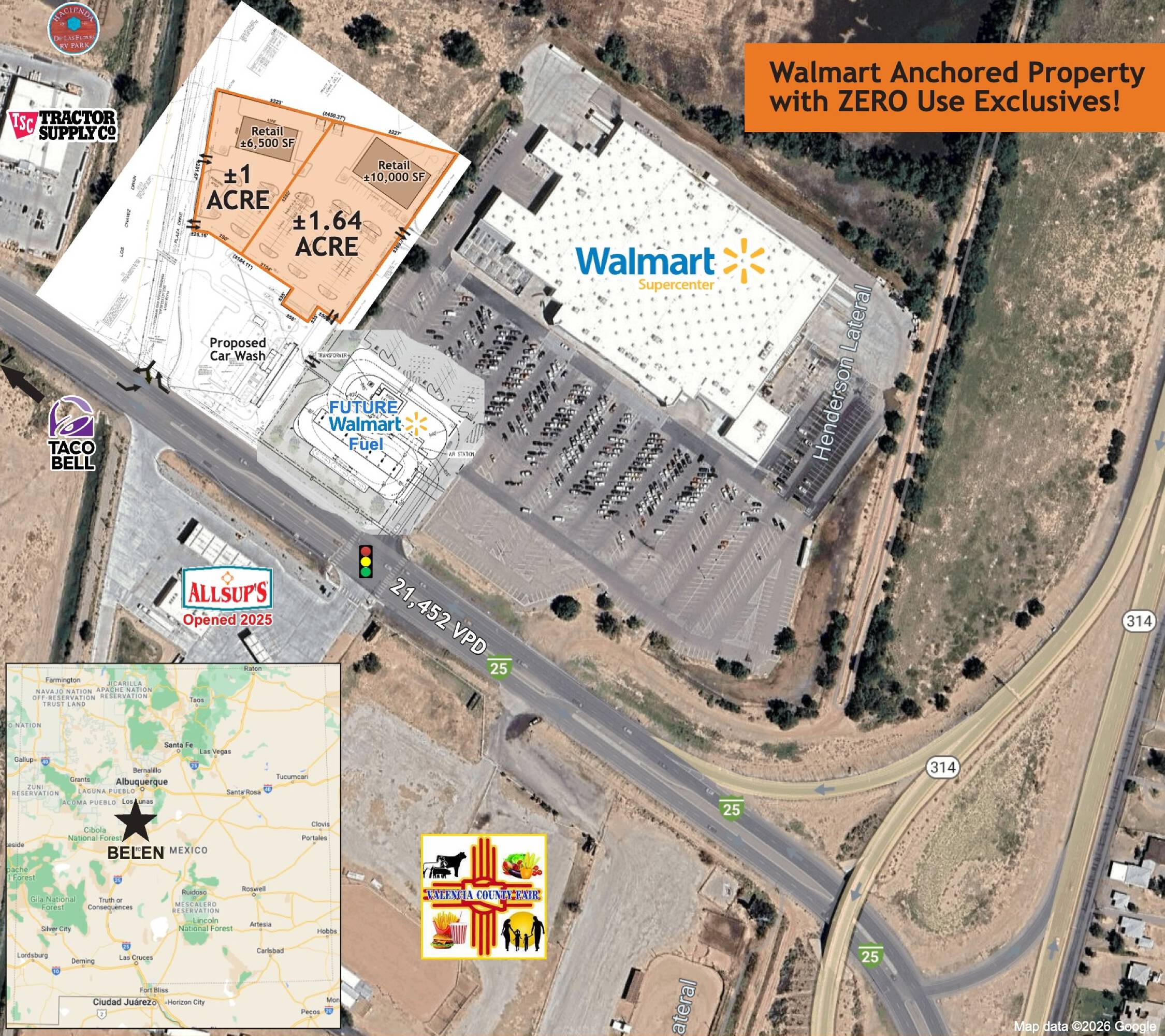 This property features: Join established retailers Walmart Supercenter, Tractor Supply Company, Allsup’s and Taco Bell.; High traffic location: **21,452 VPD on I‑25 Bypass/Business Route.**; Flexible options: Ground lease, build to suit, or sale available.