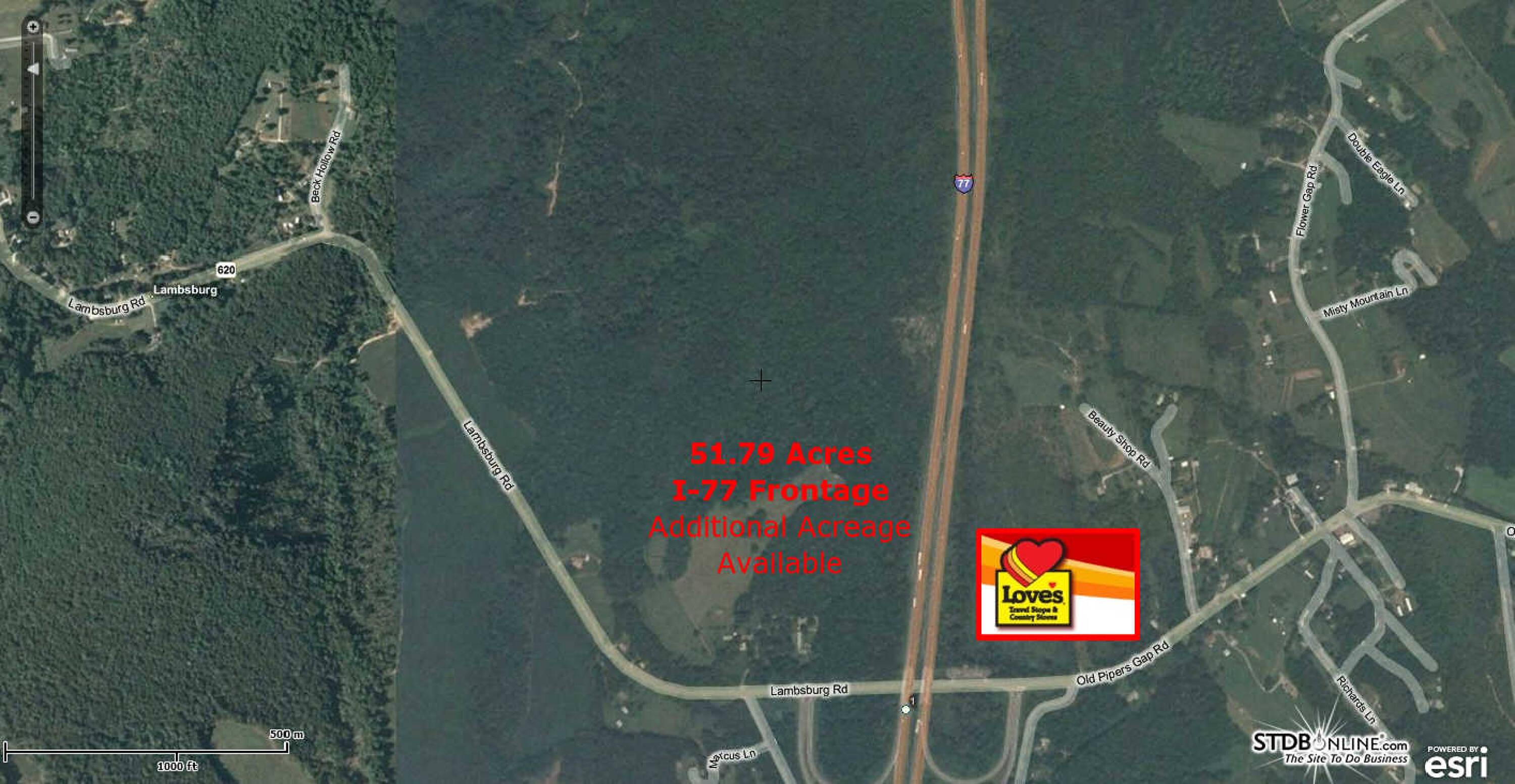 This property features 51.779 acres of land located off exit 1 along I-77 in Lambsburg, Virginia. The site is described as an excellent location for a cell tower at the top of the property. A Love's Truck Stop is located directly across the highway from the property.