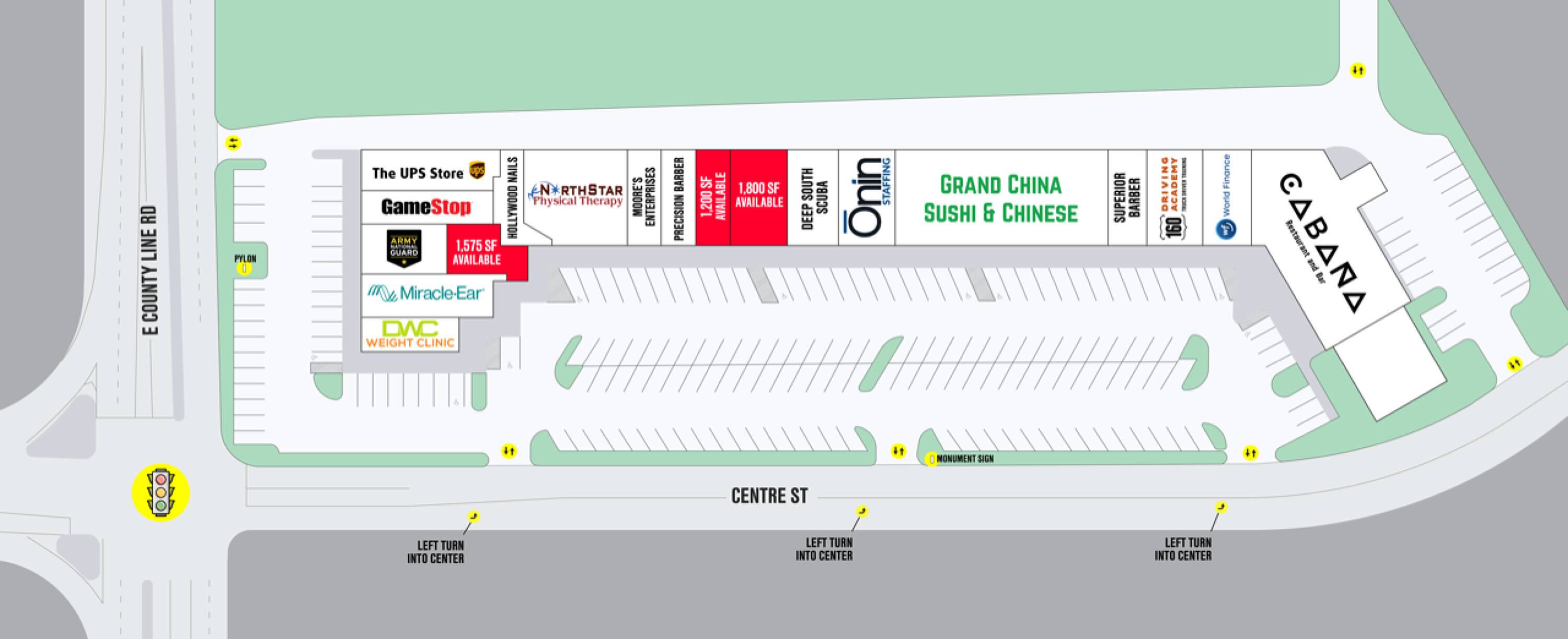 Centre Park is located on E. County Line Road, a prominent commercial corridor in the Jackson metro area. The location offers high visibility and traffic counts of approximately 29,000 vehicles per day, with accessibility for retailers and office users. The center has a tenant mix that includes UPS, World Finance, Miracle Ear, and the U.S. Army Recruiting Office. The property is surrounded by national retailers, restaurants, and service providers along County Line Road, within a high-performing retail area. Recent improvements include facade renovations, architectural elements, updated interiors with new paint and flooring, improved lighting, and upgraded signage. Tenants have access to building-mounted signage and a monument sign along County Line Road. Access is facilitated by multiple entry and exit points and proximity to a signalized intersection. Surface parking is available. Current availability ranges from 1,450 to 5,668 square feet, including the former Burgers & Blues restaurant space. The configurations are suitable for retail, restaurant, medical, service-based, or professional office uses. Centre Park is located in Ridgeland.