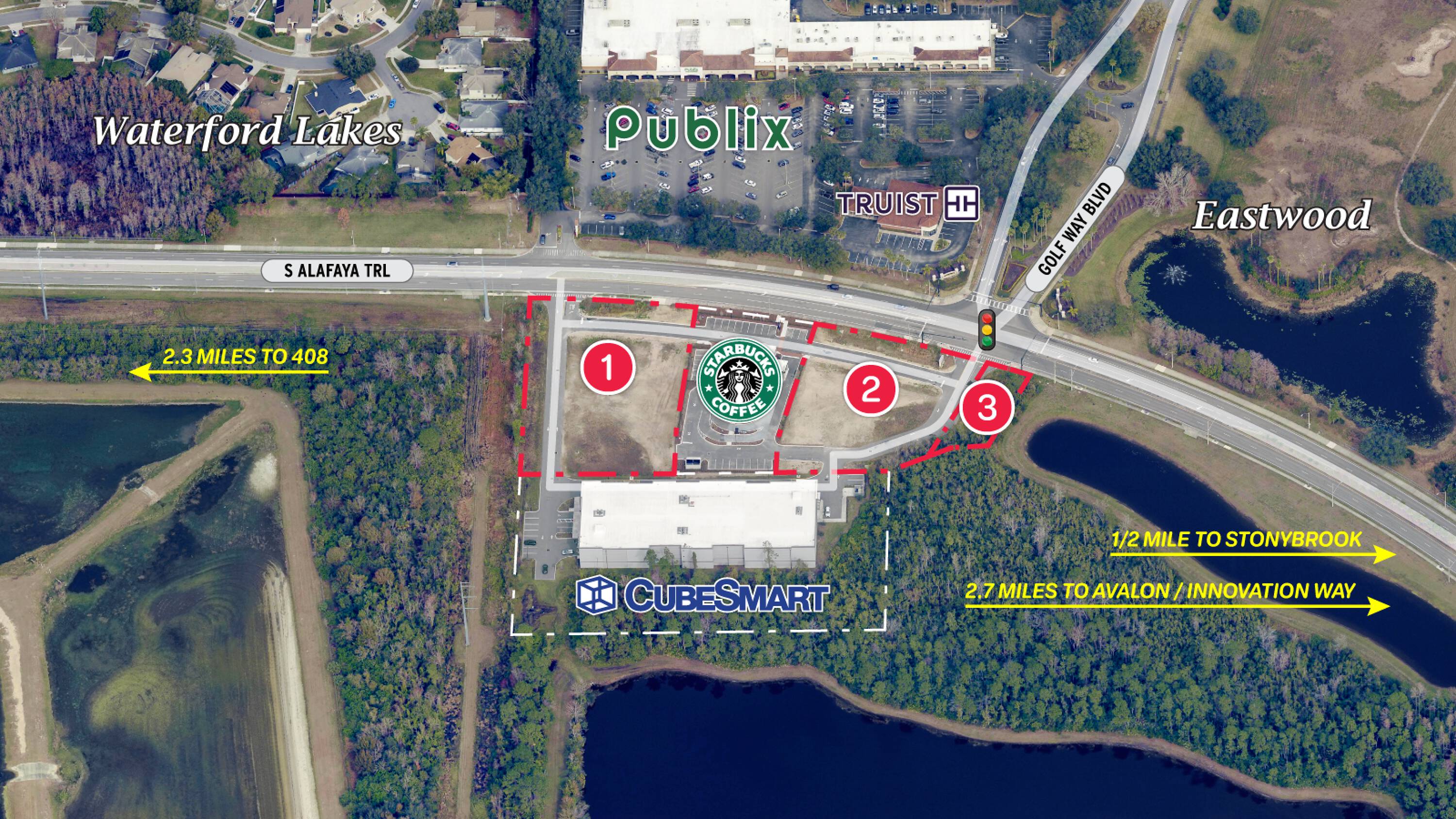 This retail space is located directly across from Publix on S Alafaya Trail, which experiences an average daily traffic count of 31,000 vehicles. It is surrounded by the Waterford Lakes community with 3,104 households, the Stoneybrook gated community with 1,359 households, and the Eastwood golf community with 2,021 households. The property is approximately 2 miles from the 408, providing convenient access to the 417 and the Greater Orlando Area. The property has two access points for shared access with CubeSmart and shared parking with a new Starbucks that is coming soon. One access point is located at the lighted intersection of Alafaya and Golfway Blvd, and the other allows for right turns in and out on the northwest side of the property. Cross-access with adjacent parcels is available. Current tenants include CubeSmart and a Starbucks that is under construction.