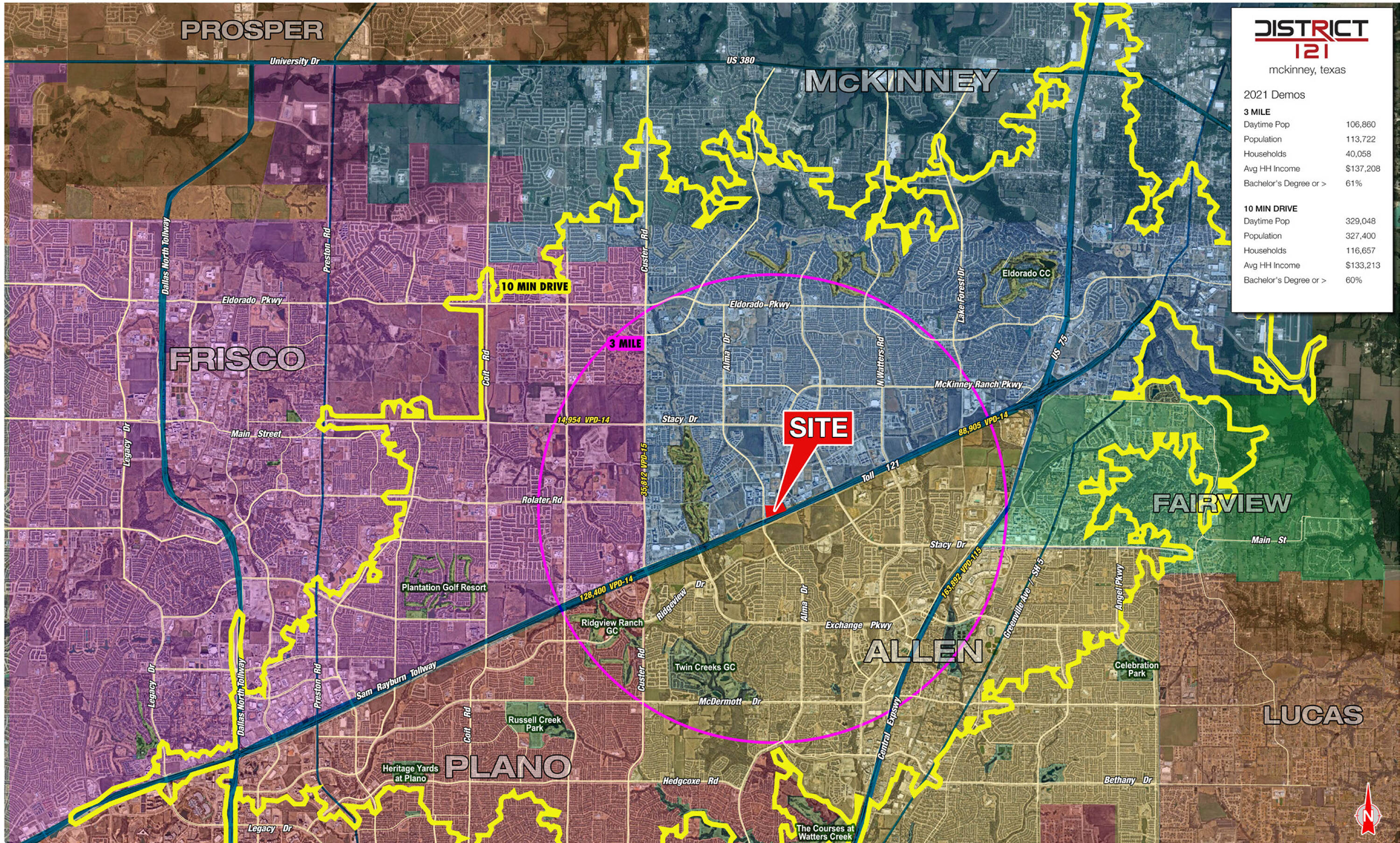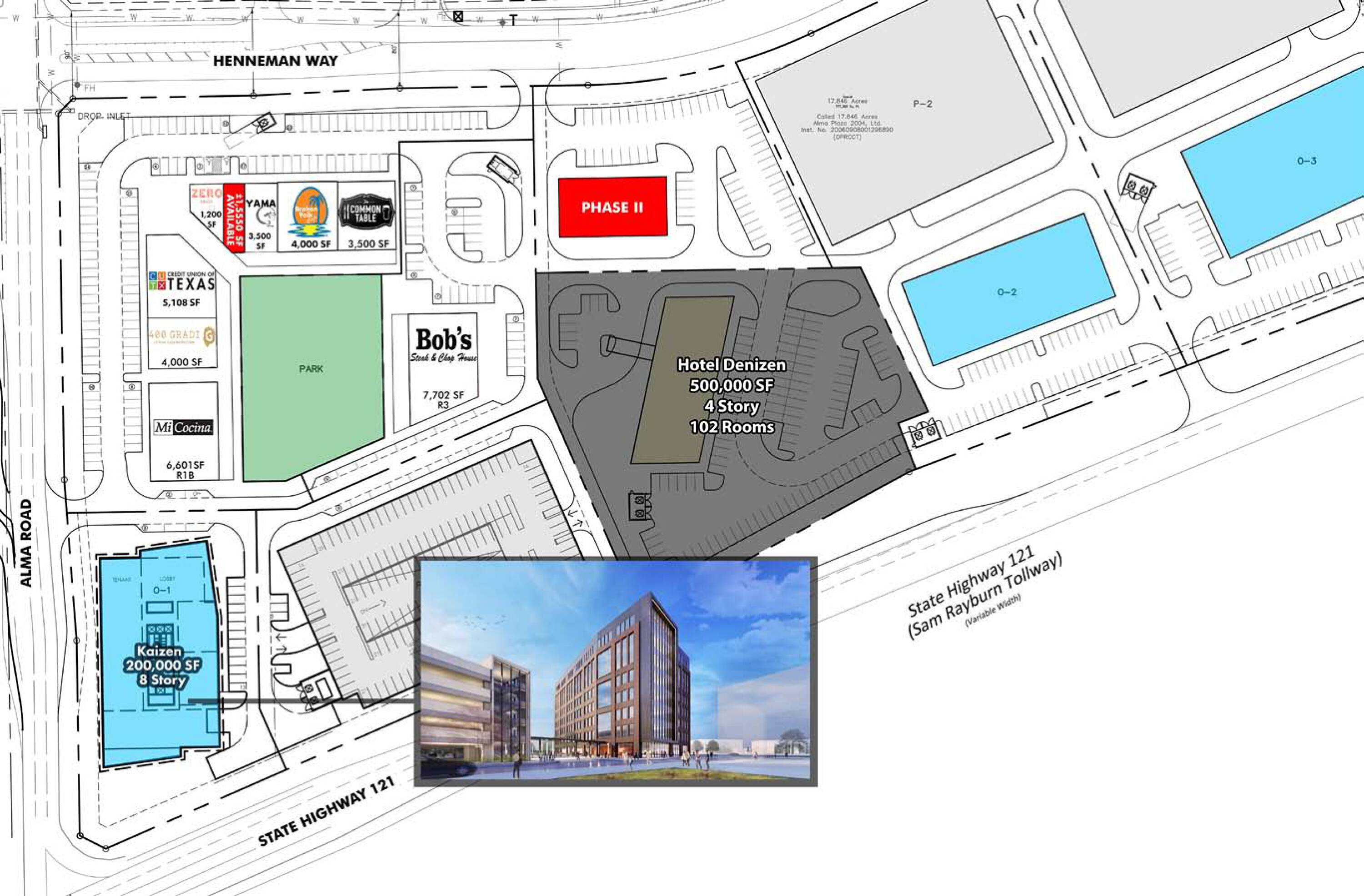Located at the northeast corner of 121 and Alma, this property is part of District 121, which aims to provide a dynamic dining and entertainment experience. Positioned as a focal destination in a robust sector, the location is adjacent to Craig Ranch, a 2,200-acre master-planned, mixed-use development. This project seeks to serve not only its neighboring development but also the surrounding communities of McKinney, Allen, Plano, and Frisco. The property will feature patio space alongside an activated green park, which has received a $2 million grant for outdoor events. The trade area, referred to as the “Blue Diamond Corridor,” is experiencing rapid development and is becoming a desirable market.