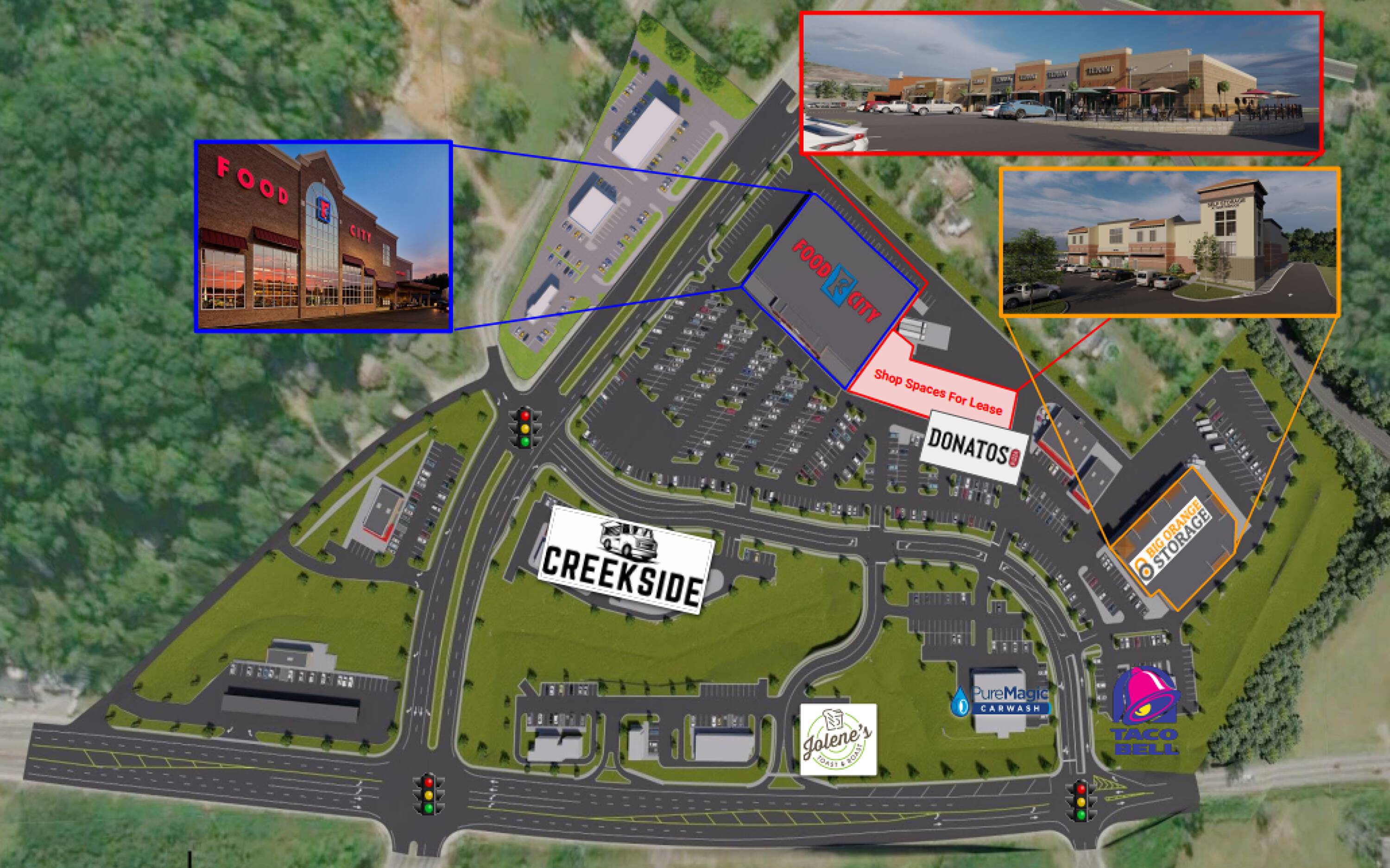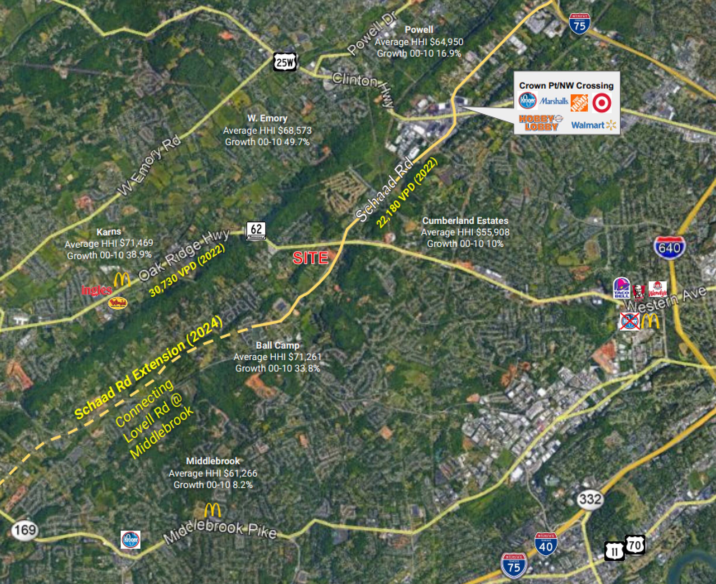 This is the last remaining first-generation retail space available within a busy shopping center that had 1.3 million visits in 2024. The Grassy Creek Shopping Center is anchored by a Food City grocery store, which opened in the first quarter of 2021. Food City (KVAT Food Stores) ranks as the 33rd largest grocer in the US, operating 127 stores and employing over 16,000 individuals across Tennessee, Georgia, Virginia, and Kentucky, with sales exceeding $2 billion. The shopping center is located at the intersection of Oak Ridge Highway and Schaad Road. Oak Ridge Highway (TN-62) has recently been widened to five lanes, connecting Karns with Downtown Knoxville. Schaad Road is a new five-lane ring road designed to connect I-75 in North Knoxville with I-40/75 in West Knoxville, and is on track for completion in 2024. Upon the completion of Schaad Road in 2024, the combined traffic count is projected to be 52,910 vehicles per day (CDM Smith TIA). The area has limited inventory and high growth, with excellent schools and over 2,376 new homes approved in the trade area. This location is one of the few areas in Knox County with remaining developable land for residential growth. The property offers easy access and visibility via new project roads signalized at Oak Ridge Highway and the new Schaad Road. It serves the growing Karns community of Knoxville and is convenient to employees in the CBD, Pellissippi Technology Corridor, Oak Ridge National Lab/DOE Installation, and the University of Tennessee. The space is warm shell.