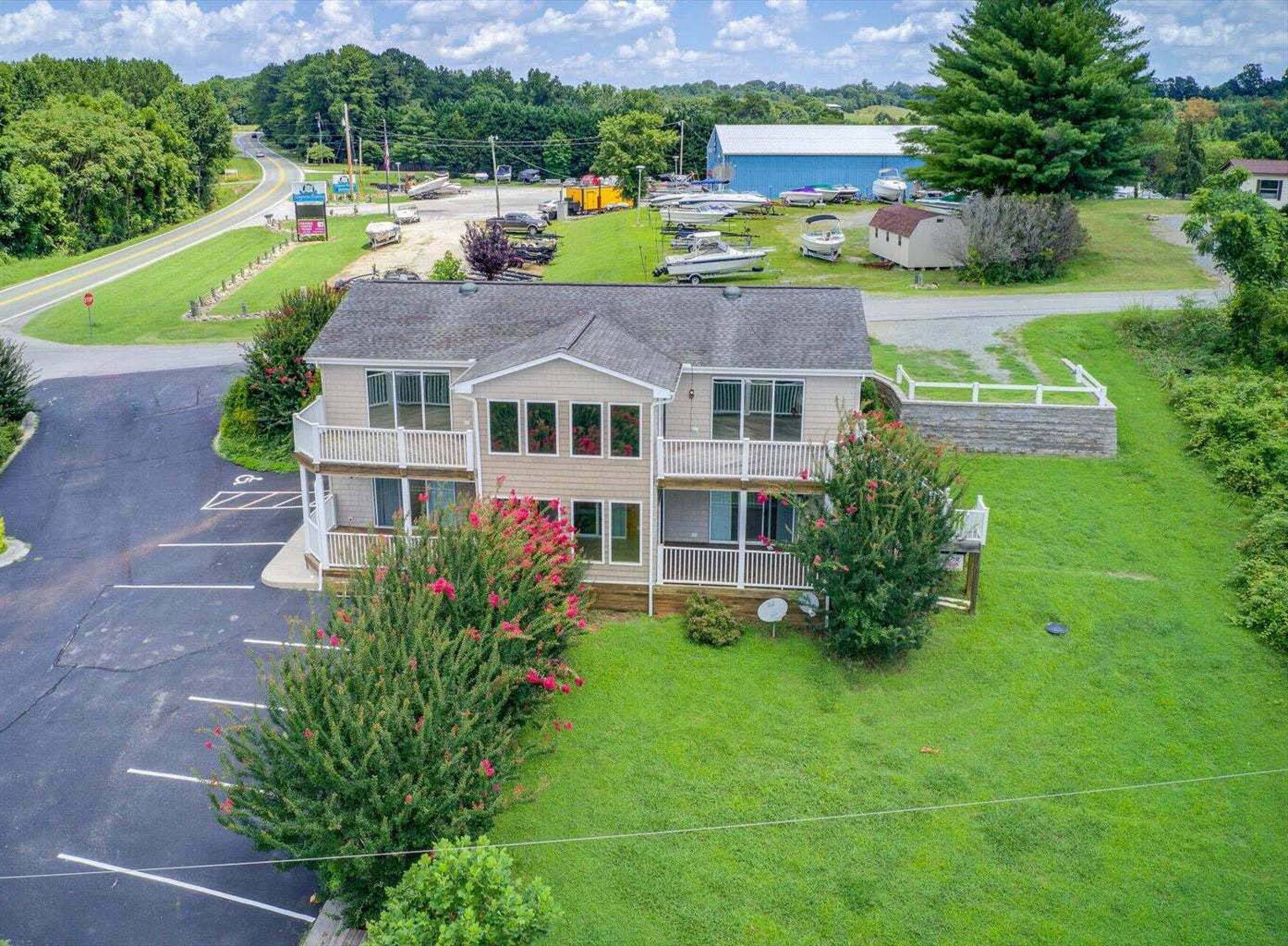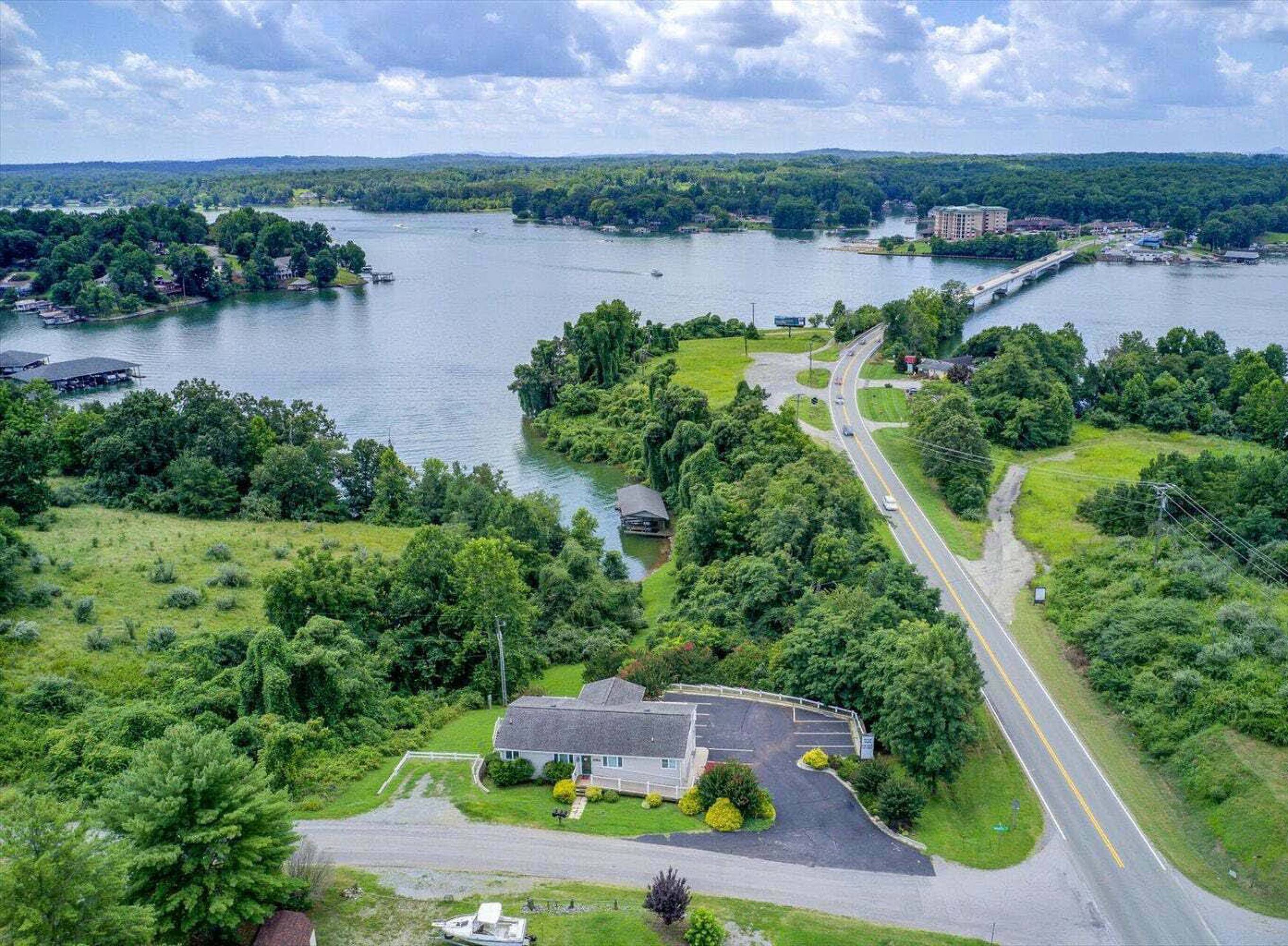 This property features: Lakefront property with boat dock featuring **4 covered slips on Smith Mountain Lake.**; Prime location on Smith Mountain Lake's major commercial corridor, off Rt 122 at Hales Ford Bridge.; Zoning allows for a multitude of uses, including short‑term rentals.