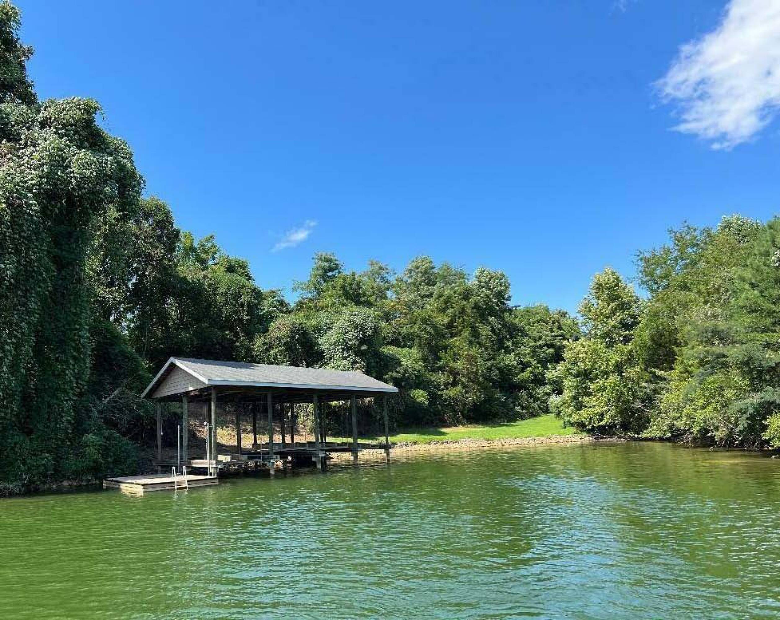 Lakefront commercial property with boat dock and covered slips.