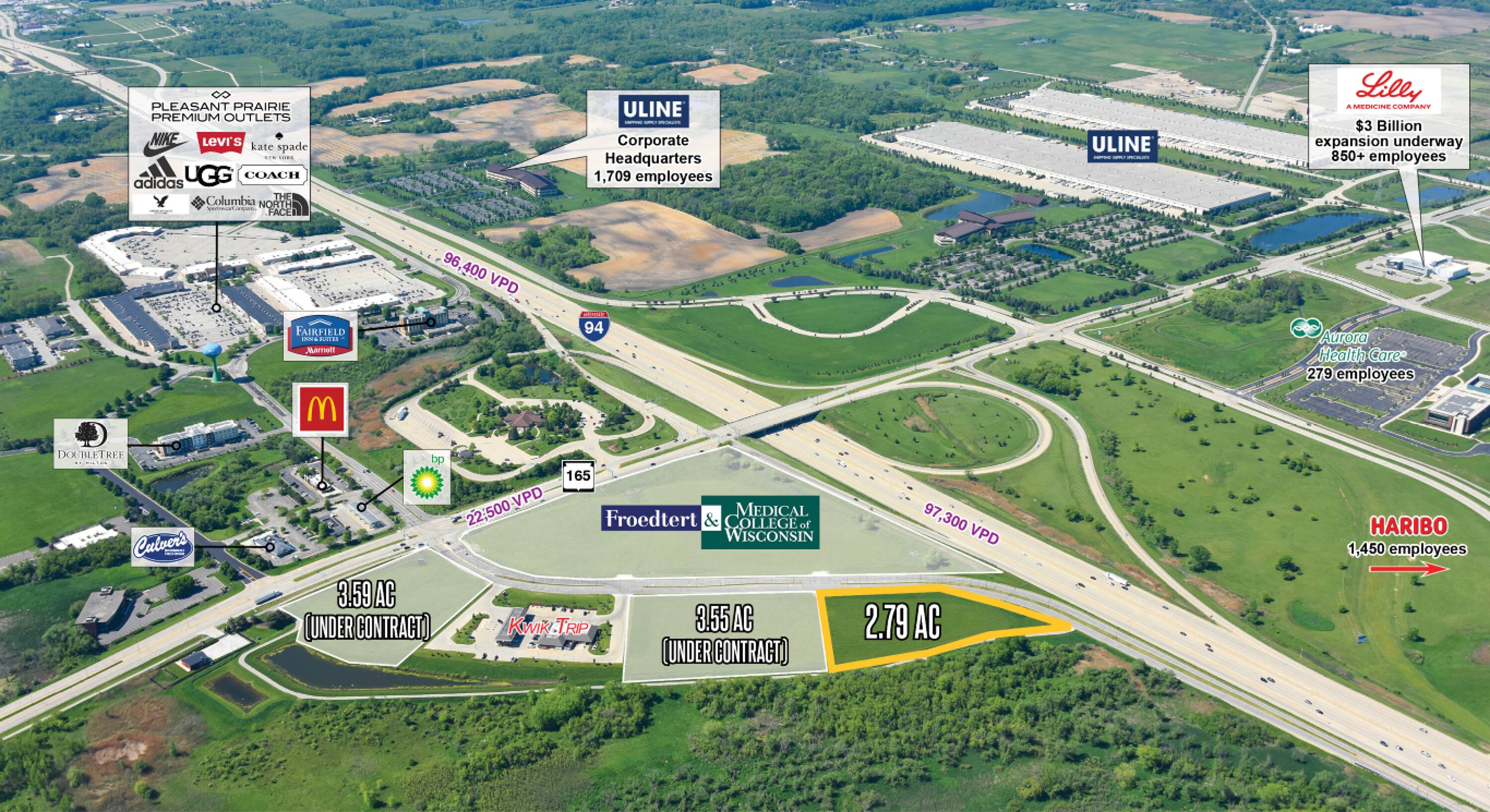 This commercial land opportunity is situated near several significant developments. Froedtert/Medical College of WI is constructing a new facility adjacent to the property. Haribo is building a 500,000 square foot plant with a $242 million investment, expected to create 450 new jobs. FoxConn has committed to a $10 billion factory in the region, potentially generating up to 10,000 jobs. Aurora Health Care has completed a 200,000 square foot medical facility with a $130 million investment, located just south of the Haribo site. Uline's new corporate headquarters, spanning 275,000 square feet, and a 1.2 million square foot warehouse are projected to employ 2,400 individuals in Kenosha County. Kenosha County has experienced a population growth of 12.6% since 2000 and is home to major employers, including Amazon, Uline, Snap-On, and Meijer distribution.