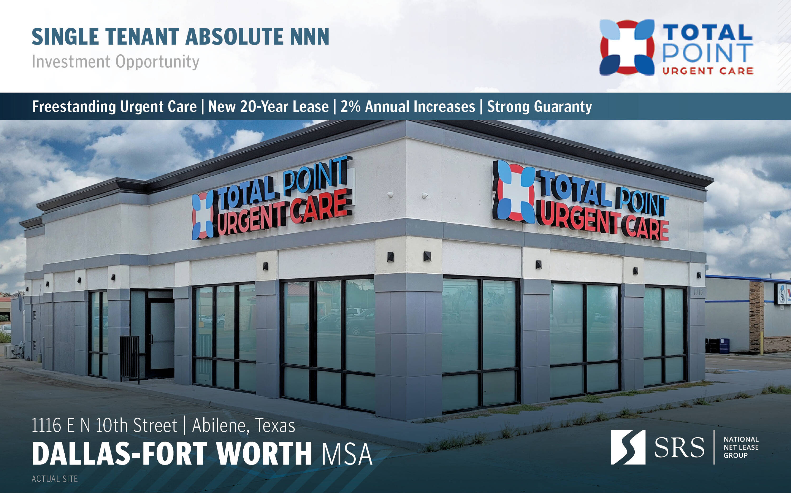 This property features a newly redeveloped urgent care facility offering imaging services, including on-site x-rays and labs. The property is under a brand-new 20-year lease with 4 (5-year) options to extend. The lease is guaranteed by Rocinate Equity Inc., dba Elysian Capital, a UK based private equity firm. There are 2% annual rental increases throughout the initial term and each option period. Total Point, a rapidly growing medical service provider with urgent cares, imaging, emergency rooms and hospitals across Texas and Arizona, occupies the space. The property is located in Abilene, Texas and has a size of 2551 square feet.
