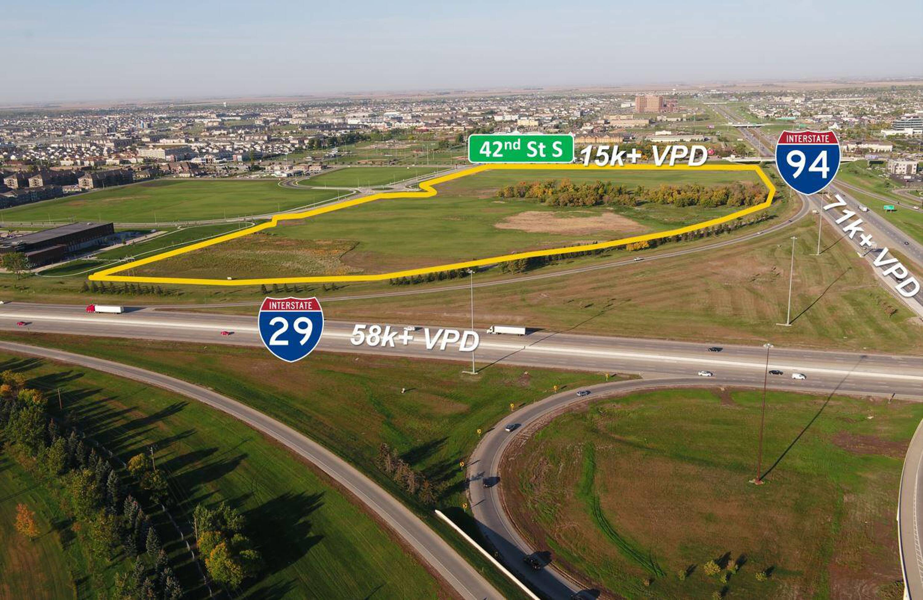 This property features: Unmatched visibility and access adjacent to I‑94 and I‑29.; Highest combined traffic counts in the state (over 144k vehicles daily).; Located in The Crossroads, a master‑planned commercial development.
