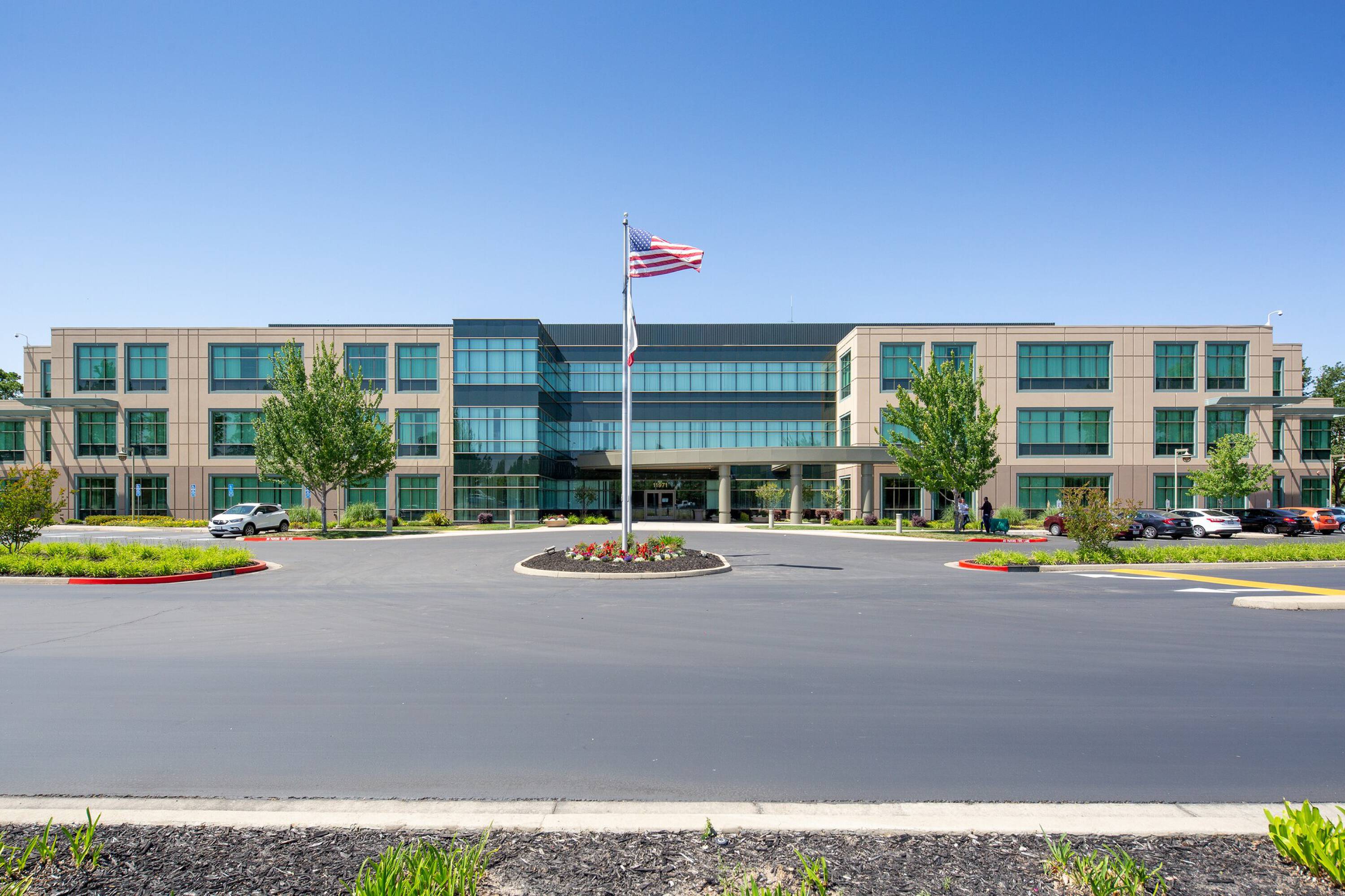 Freeway-facing office building with excellent access and modern amenities.