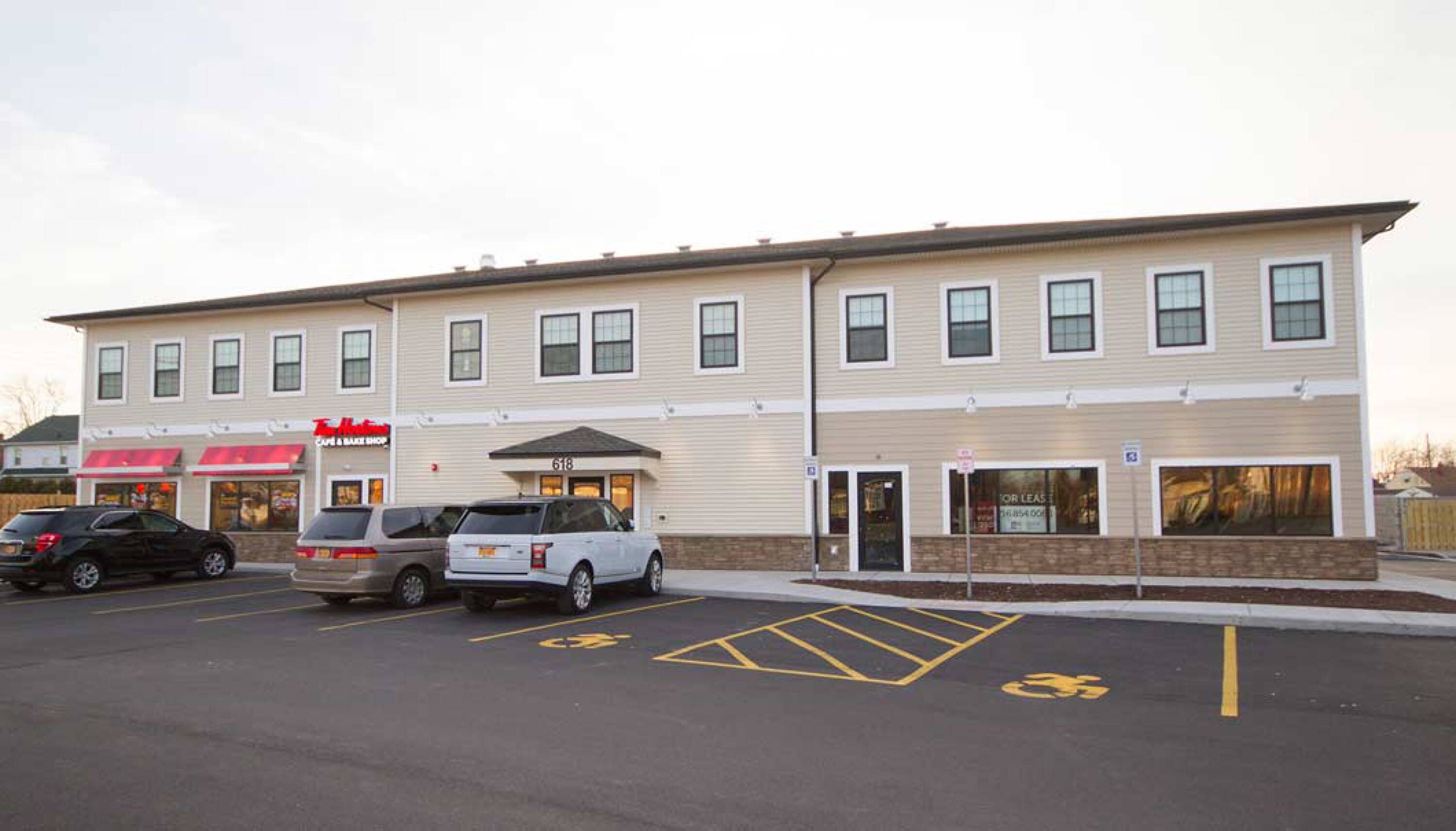 Mixed-use building with retail and residential spaces, including Tim Hortons.