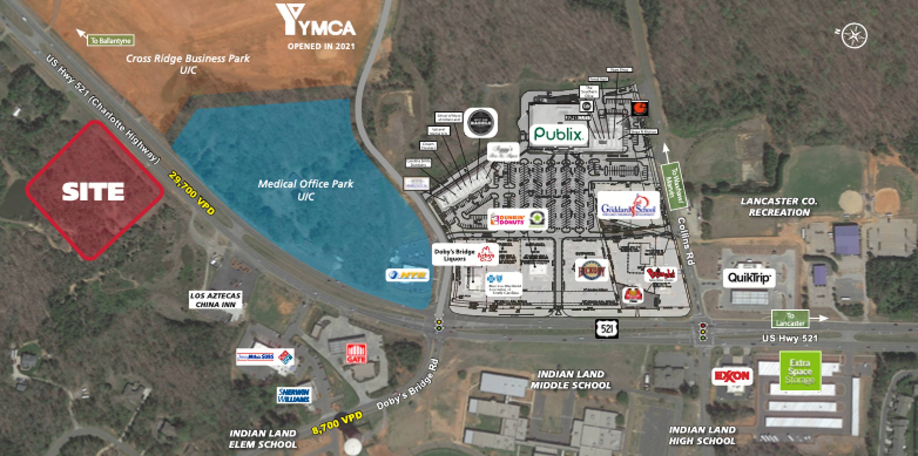 This property features: 3.526 acres Zoned GB (Lancaster Co.) with **420’ of frontage on Hwy 521**; Across the street from the Indian Land YMCA & Target Shopping Center; **0.5 mile to the new Costco**