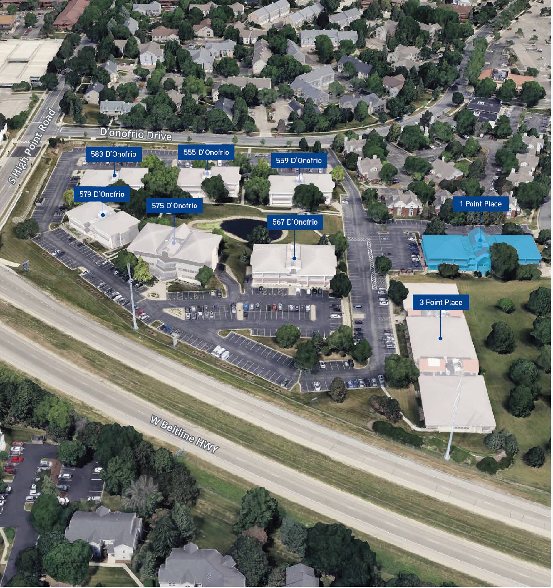 Professional and affordable office spaces are available for rent in High Point Office Park, situated off the Beltline and Mineral Point Road. Tenants have access to a conference room and fitness room without additional charge. Substantial parking is available. The monthly rent covers all expenses except for phone, internet, and in-suite janitorial services.