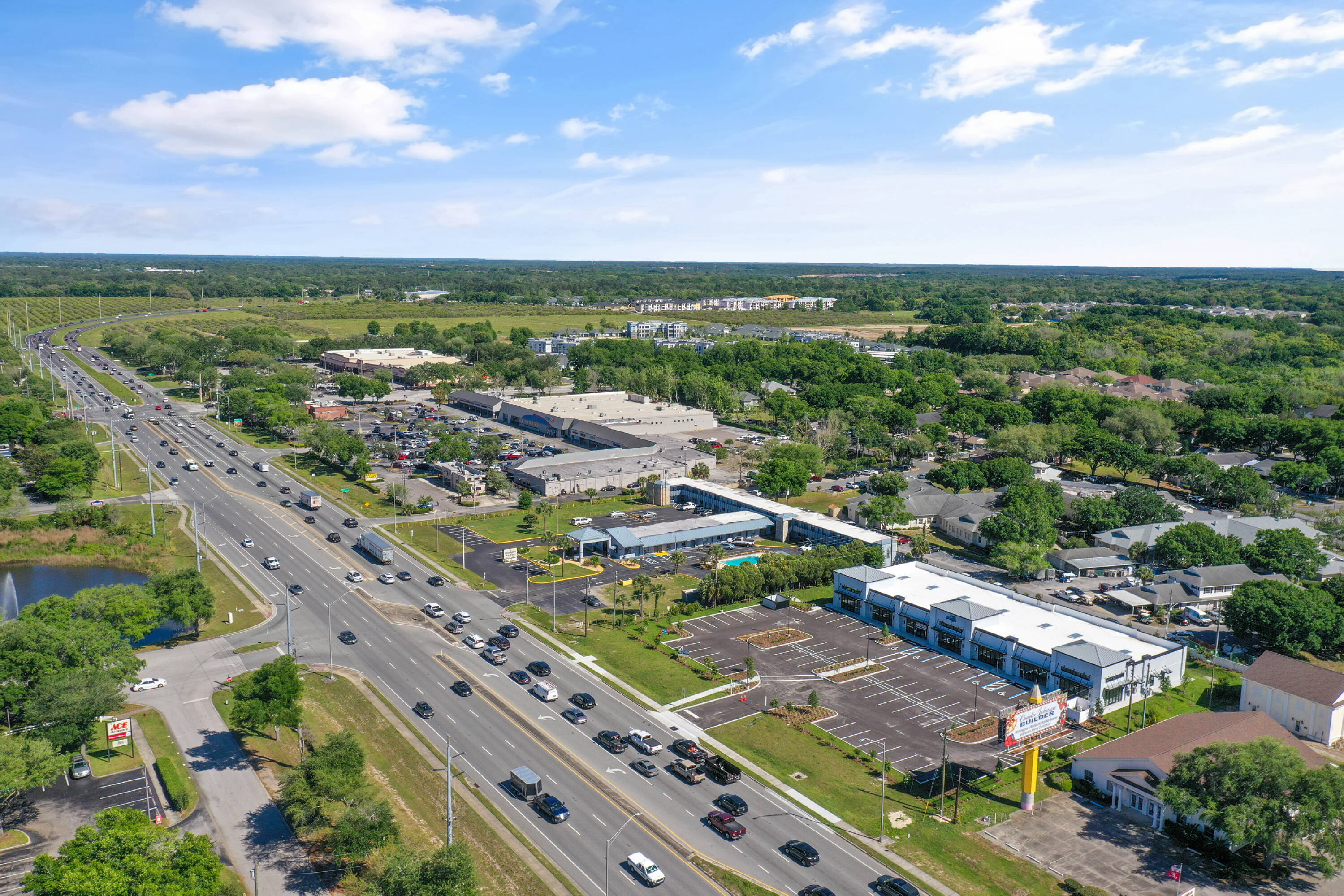 Retail and office spaces available on a high-traffic highway.