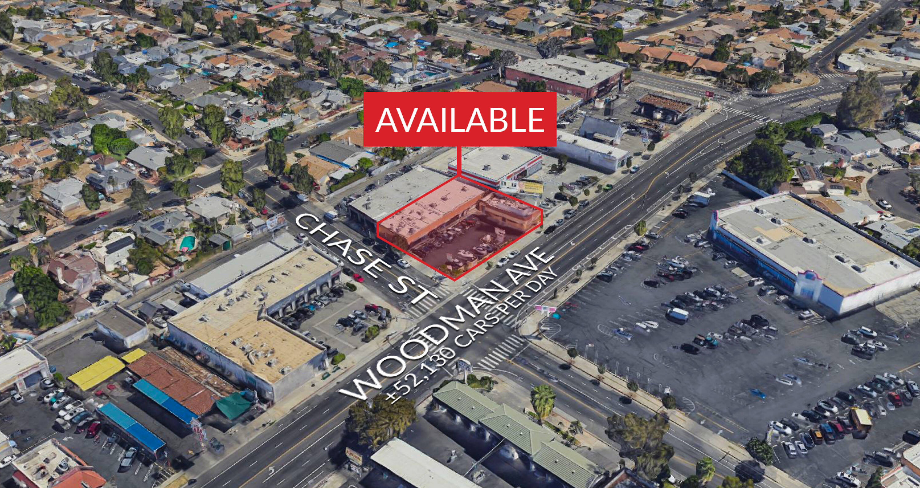 This property features: High traffic location with ±52,130 cars per day at the intersection of Woodman and Chase.; Close proximity to Kaiser Permanente and Panorama Mall.; **Drive‑thru availability.**