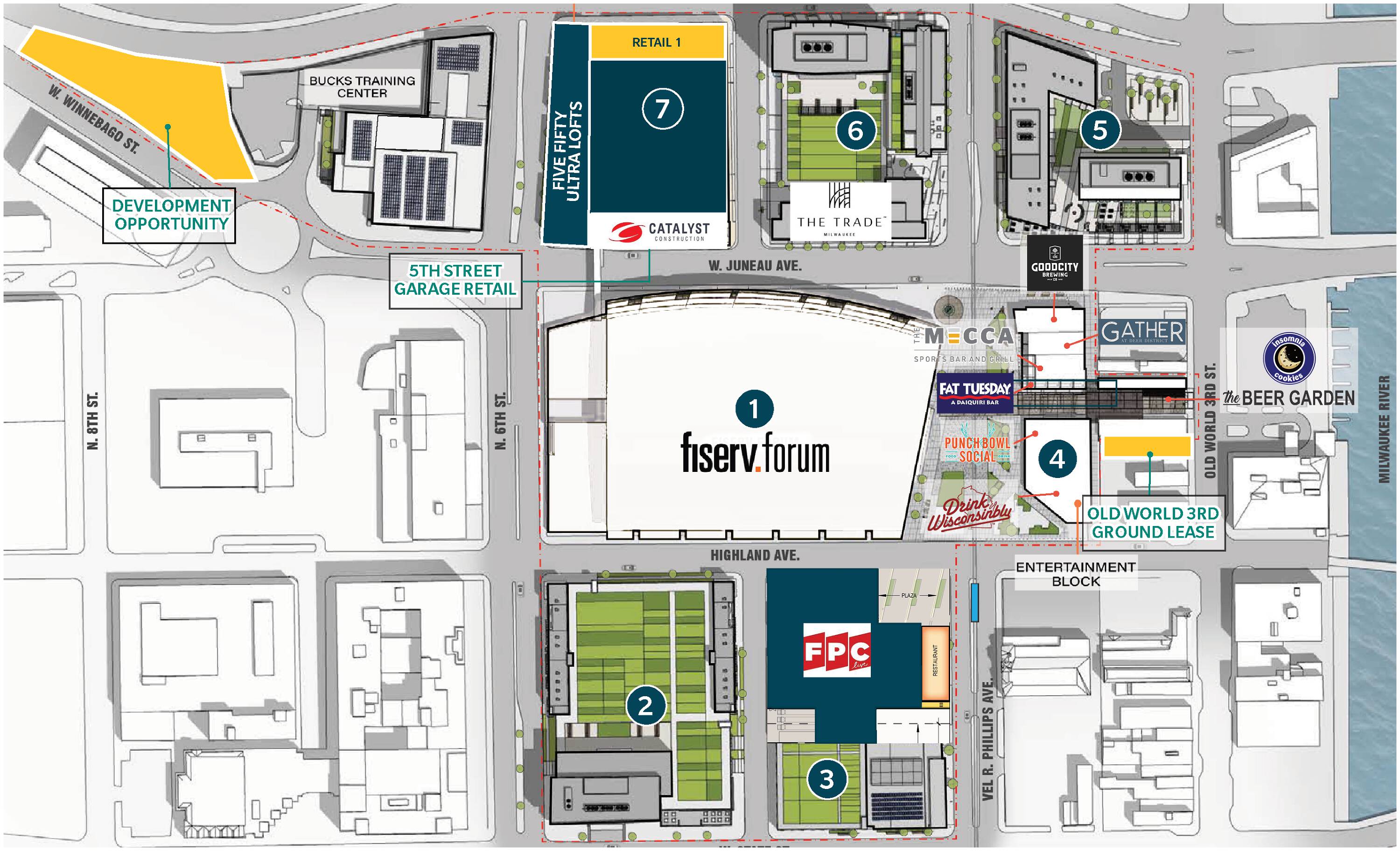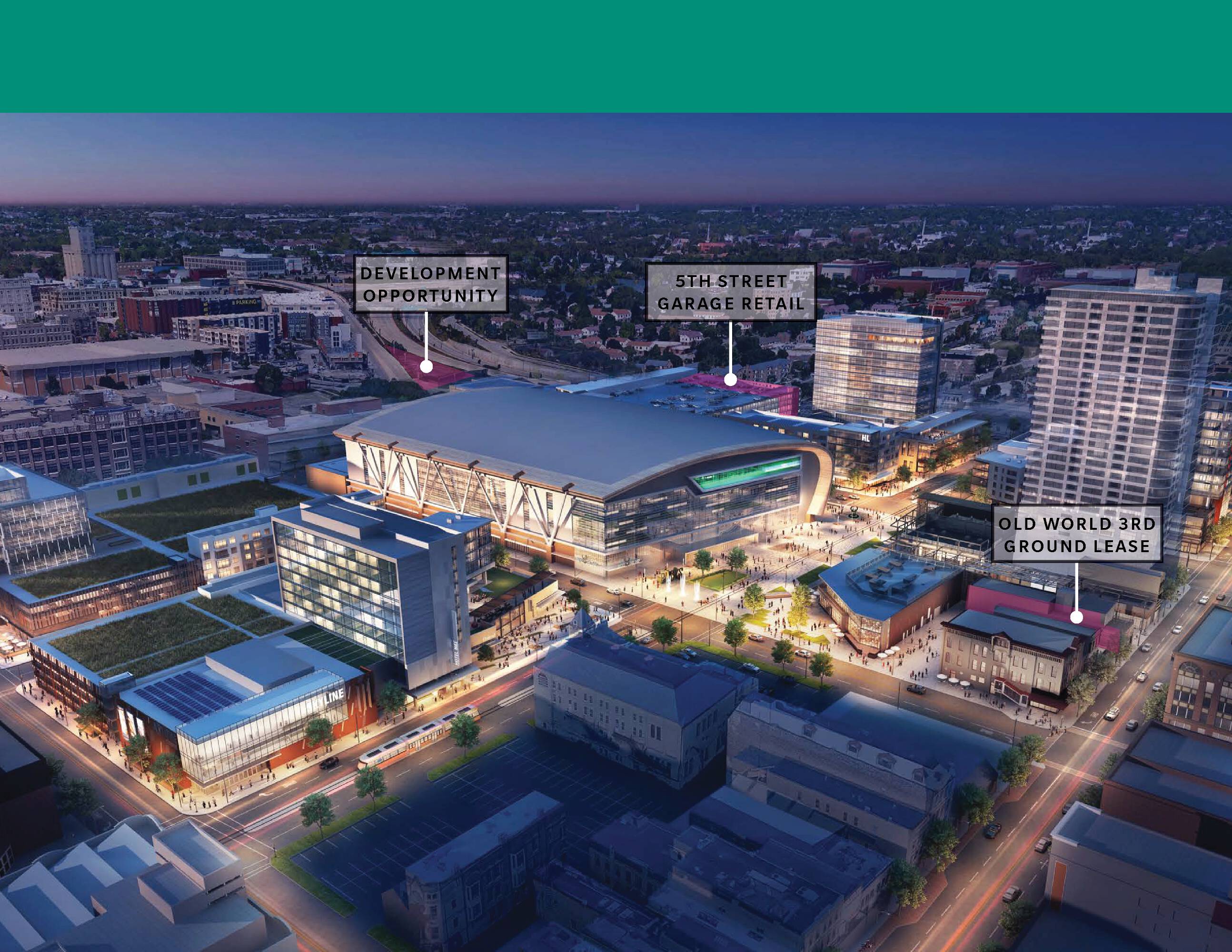 Located in Milwaukee's Deer District, a 30-acre development surrounding Fiserv Forum, are multiple commercial leasing opportunities. The district hosts more than 150 events per year and is home to the Milwaukee Bucks and Marquette Men's Basketball. A 230-room Autograph Hotel development is upcoming. Current opportunities include the 5th Street Garage, offering full access off 5th Street and a high-profile signage opportunity on an LED reader board, along with 122 dedicated ground-level parking spaces with direct access to retail. Additionally, there is a high-profile ground lease opportunity on Old World 3rd Street, allowing the tenant to construct a multi-story building with a rooftop patio. A 0.58-acre development opportunity is also available for ground lease, providing high-profile visibility from McKinley Avenue and easy access to I-43 off of W. Winnebago St. This site is located adjacent to the Froedtert & Milwaukee Bucks Sports Science Center and is zoned PD - Planned development overlay zone.