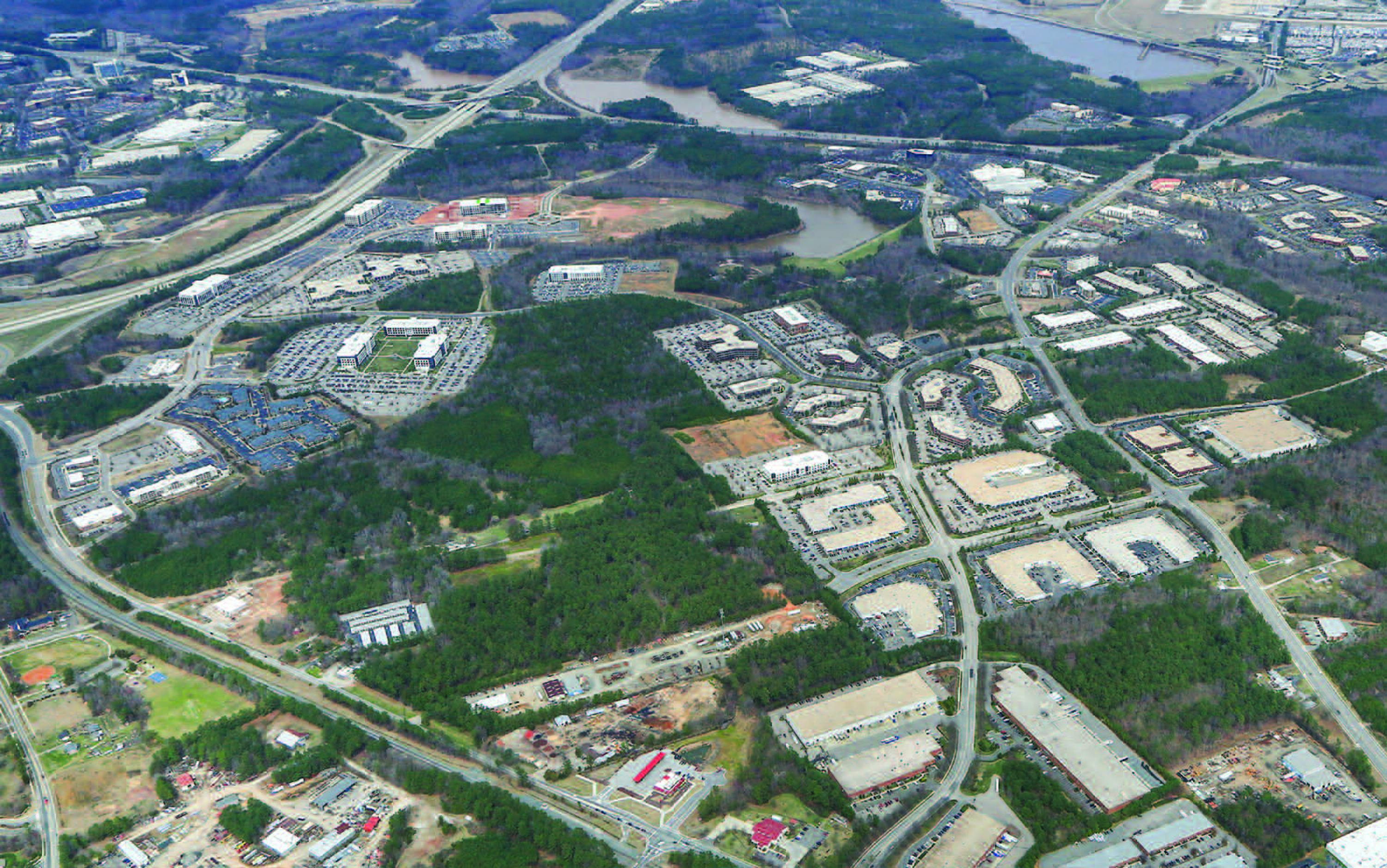 Modern office buildings in a master-planned park setting.