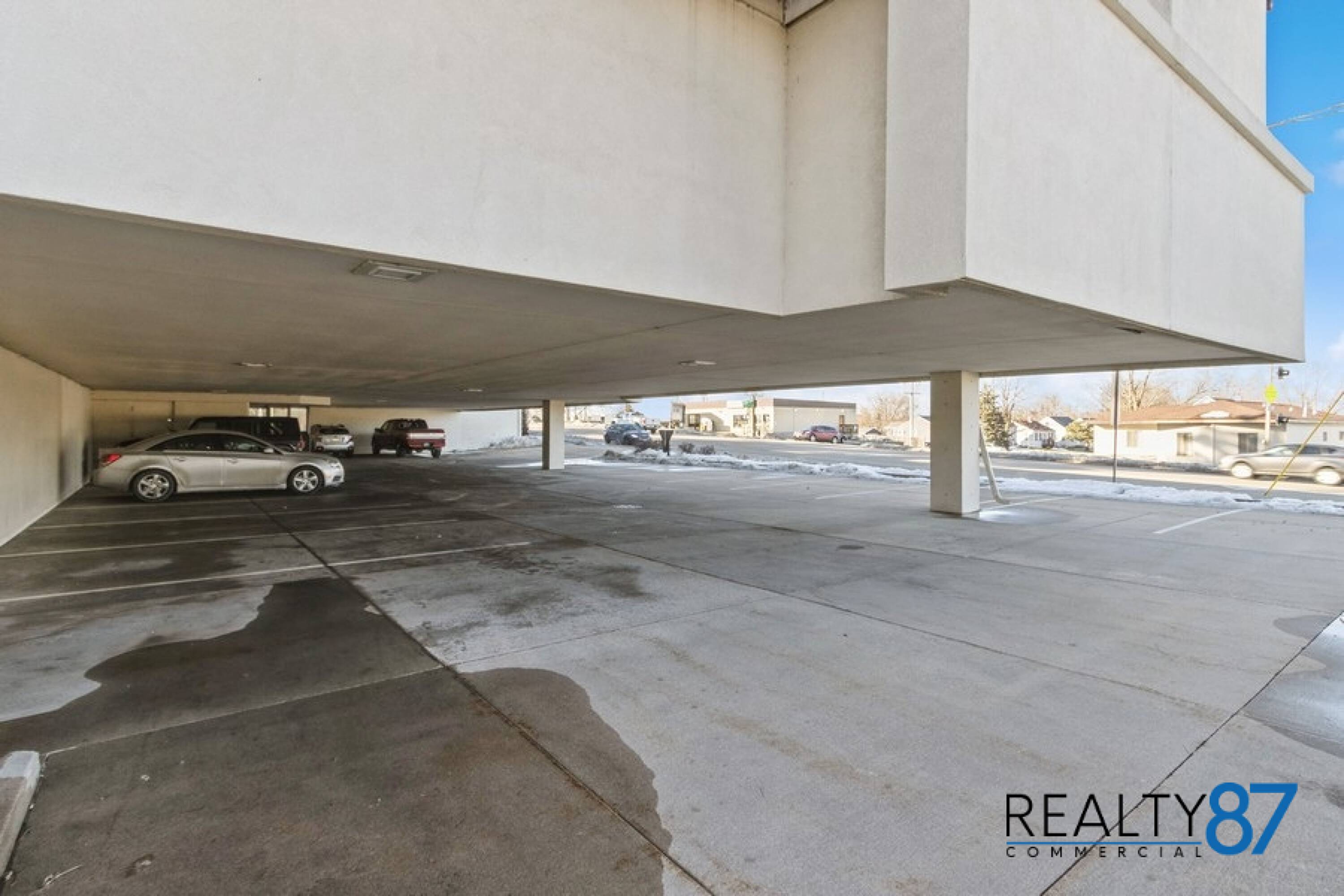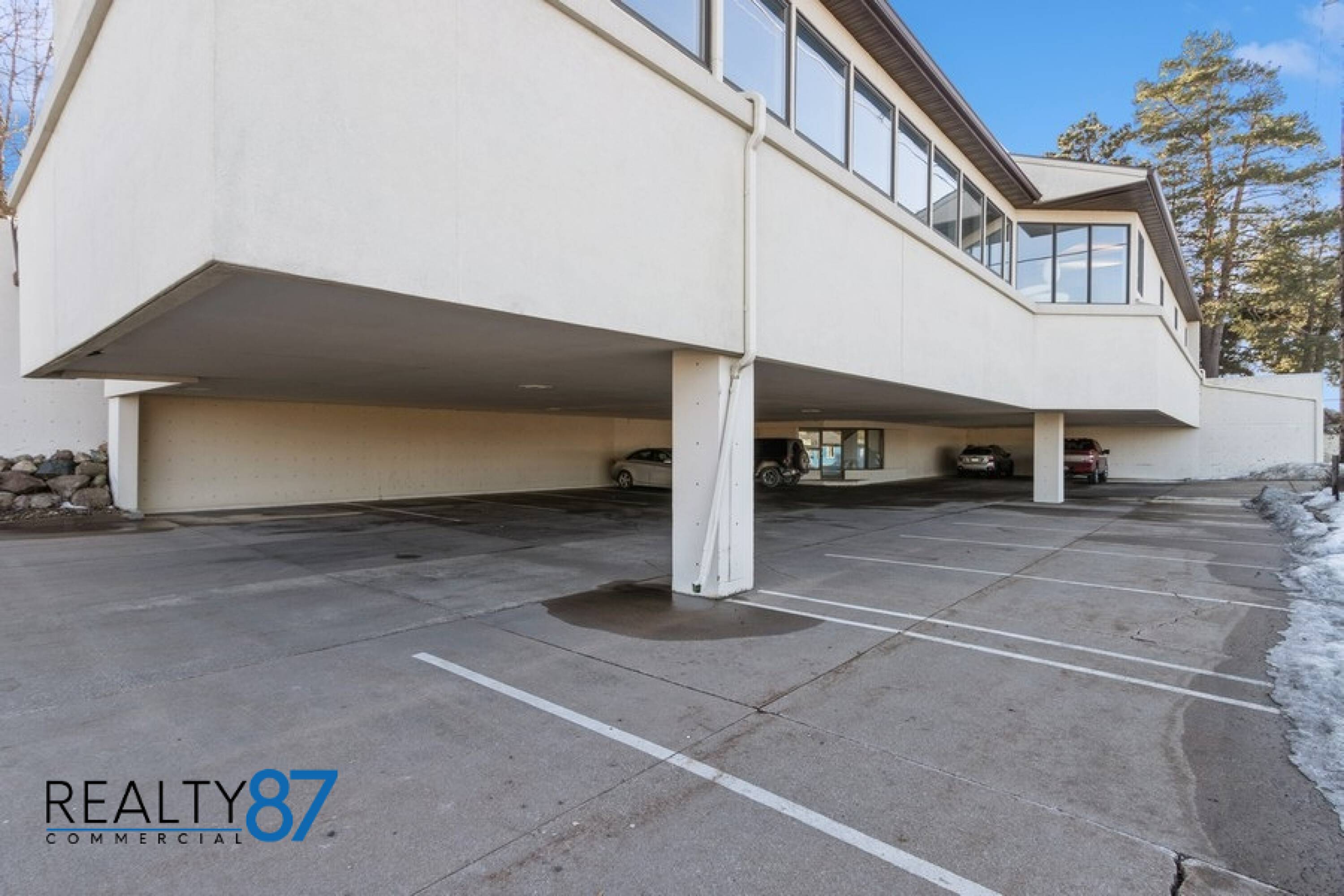 Unique office building with covered parking and open floor plan.
